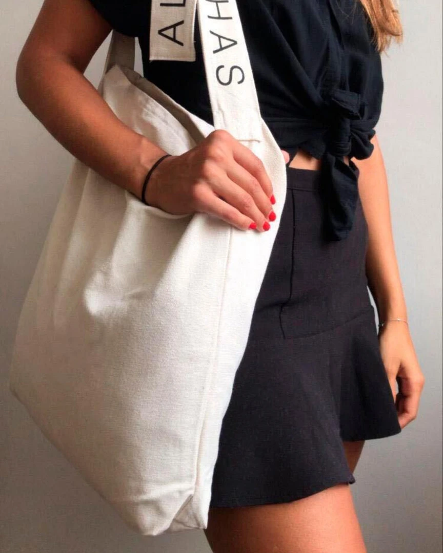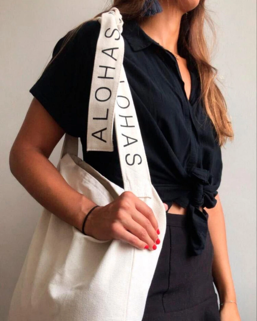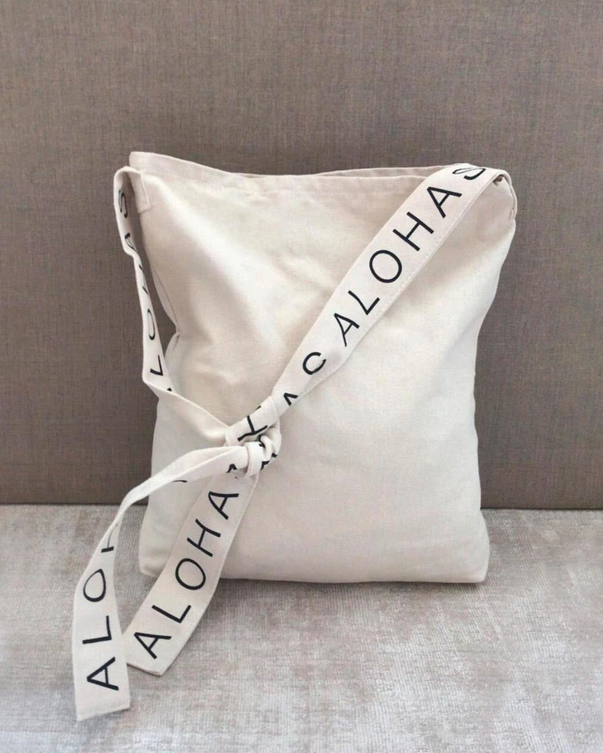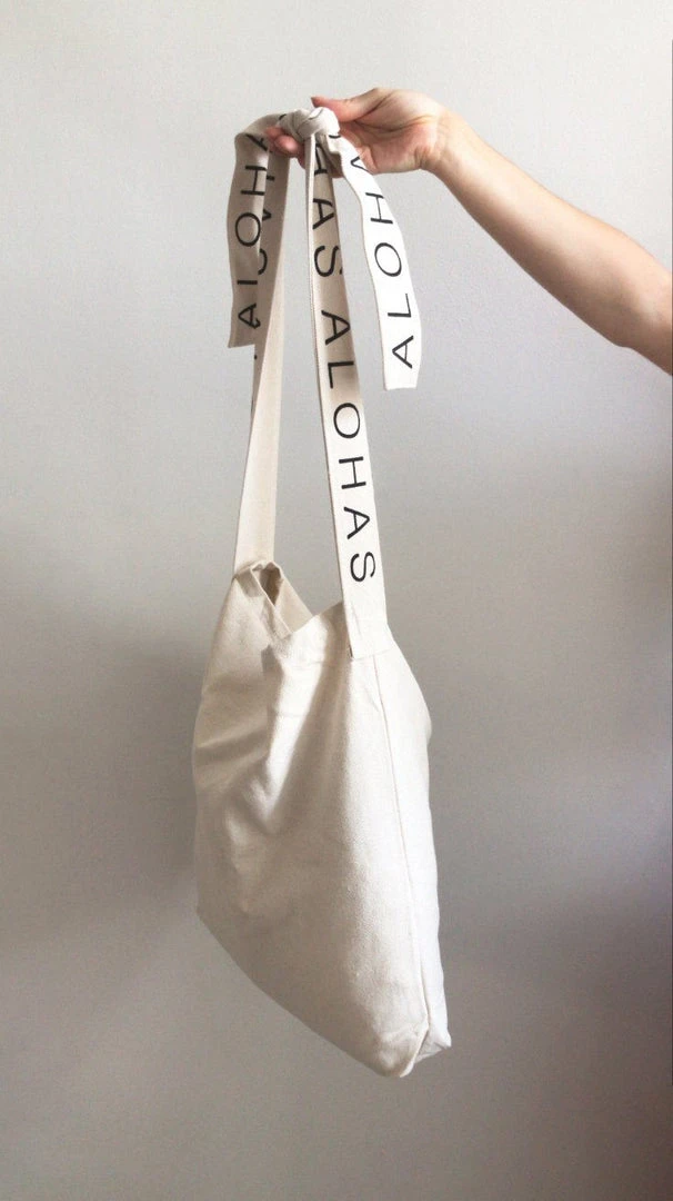 Off white tote bag featuring the ALOHAS logo along thick straps knotted above the shoulder.