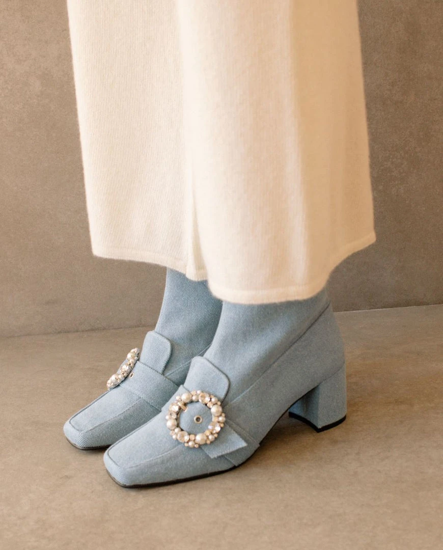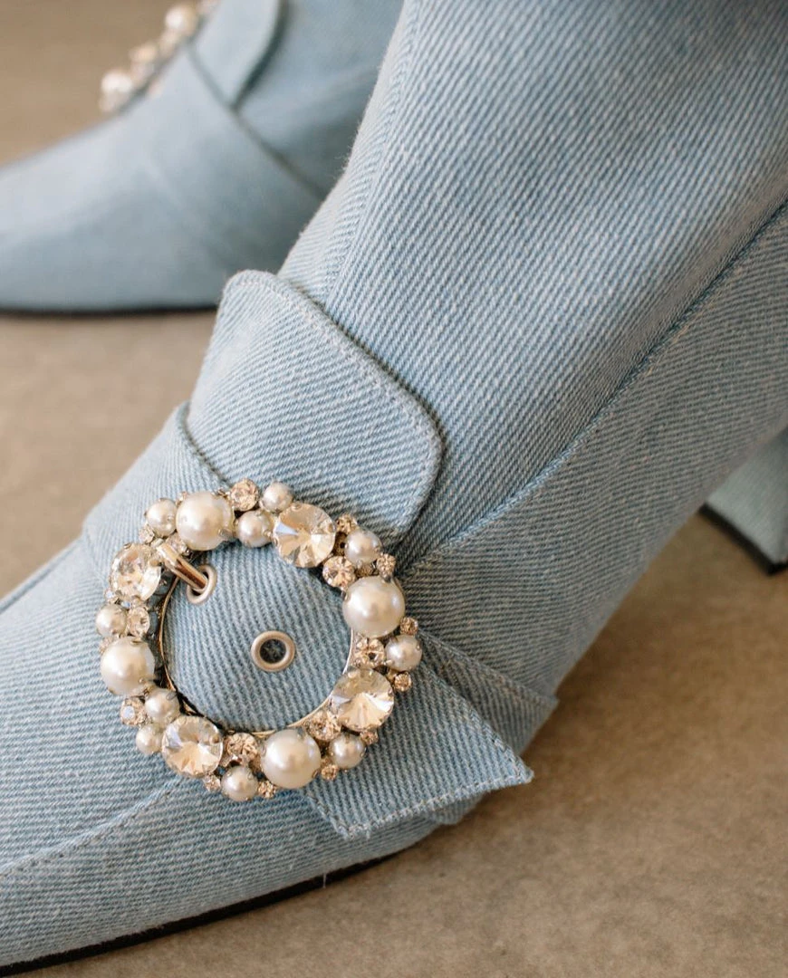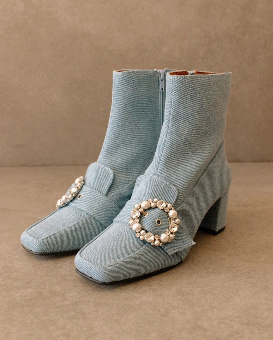 Ankle boot and moccasin at the same time? I’m listening! Heeled denim boot with a moccasin front and a jeweled buckle that will dazzle everyone within a one mile radius. Side zipper for extra comfort.