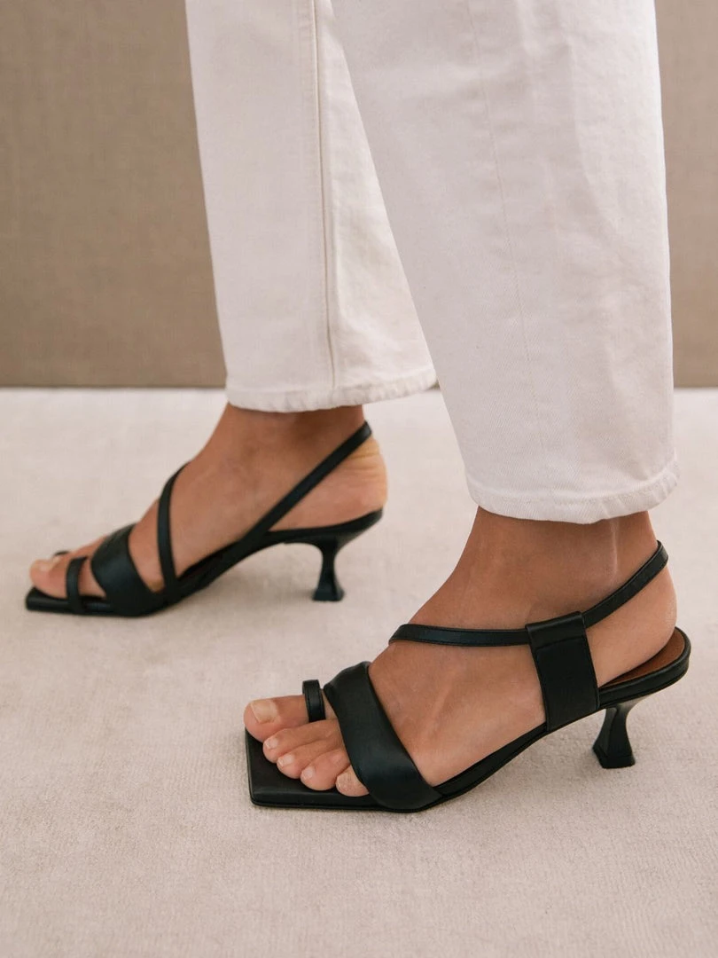 These black leather low heel sustainable sandals feature several types of straps: a toe strap for front support, a chunky instep strap for added flattery, and a thin strap from across the instep to the heel, offering side support. The cherry on top of these asymmetric sandals are without a doubt their chunky kitten heels.
