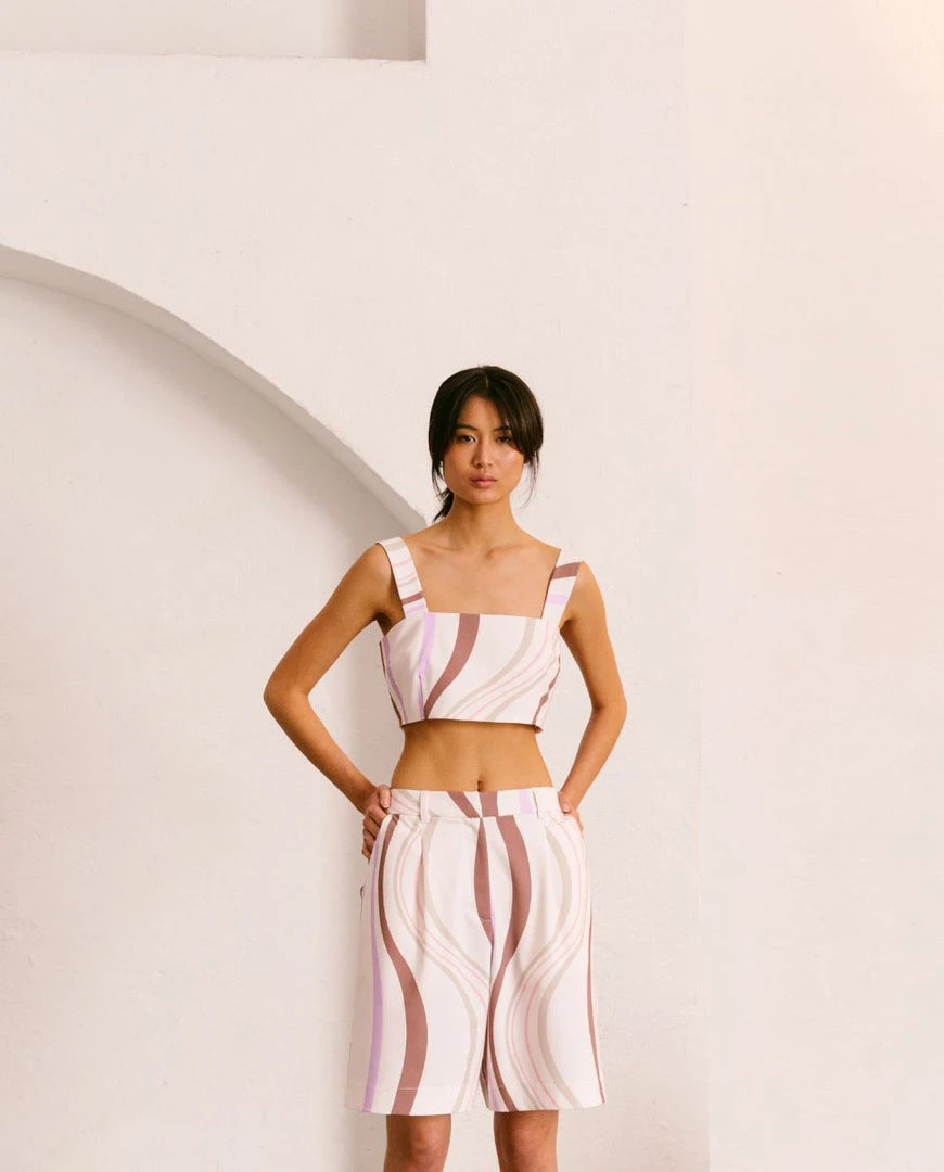Sleeveless crop top with thick shoulder straps and a summer evoking below the chest cut. Wear with high waisted flares for a vintage Venice beach hippie look.