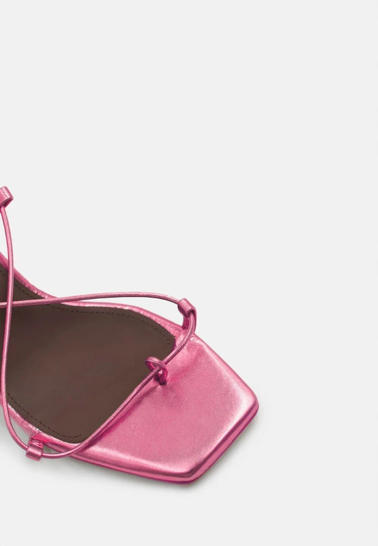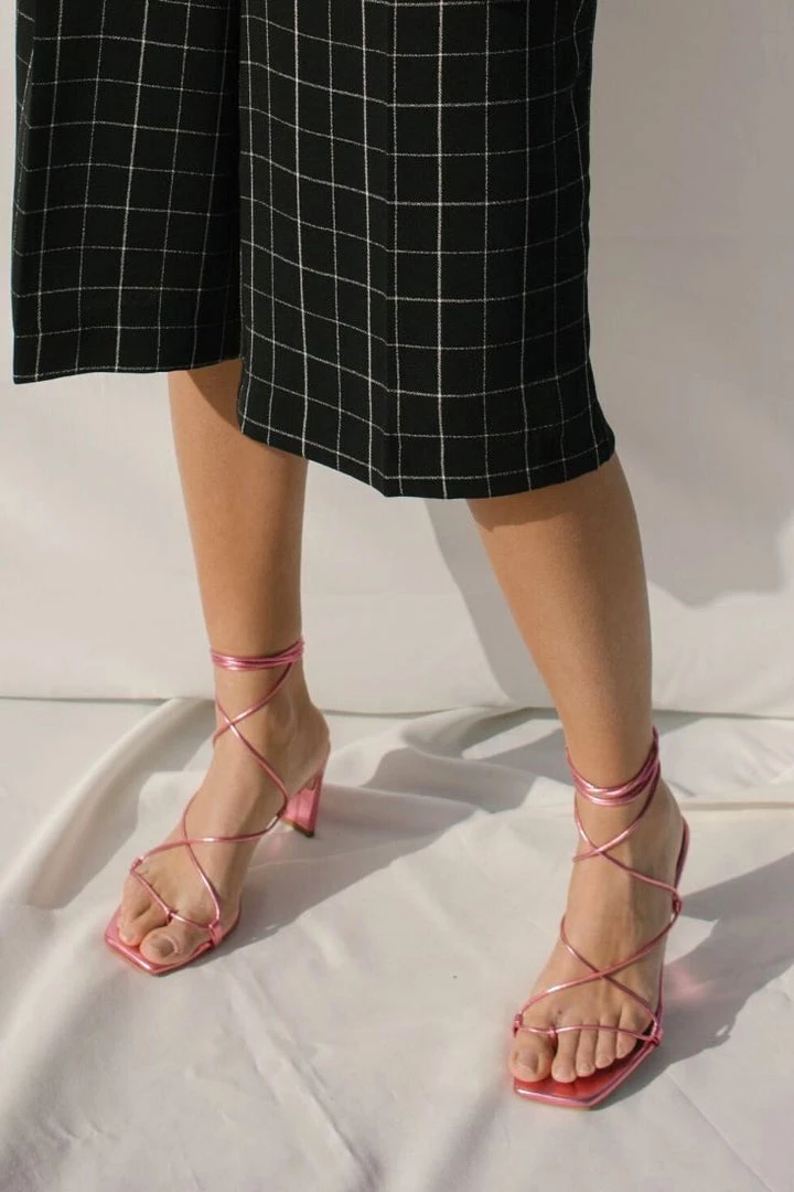 The ultimate combination of glamour and comfort. Made by hand in Spain and crafted in soft leather, this lace-up style wraps around the ankle in a barely there delicate sandal that is perfect for any special occasion.