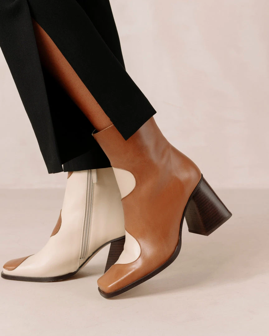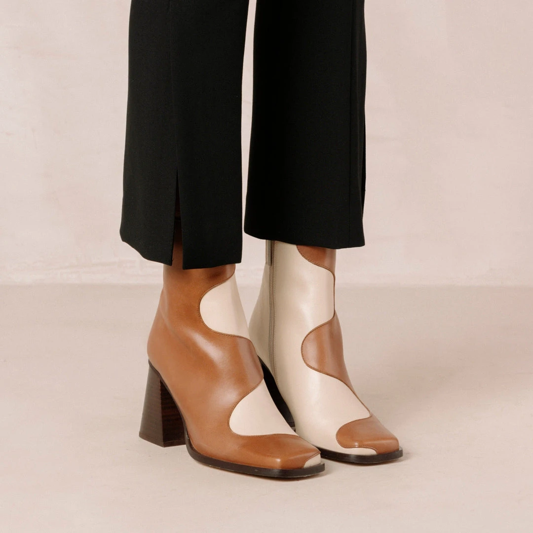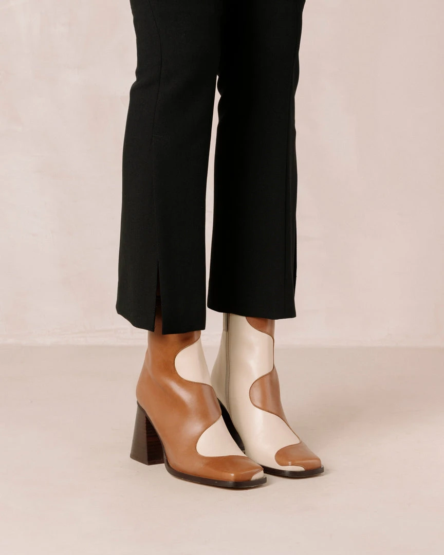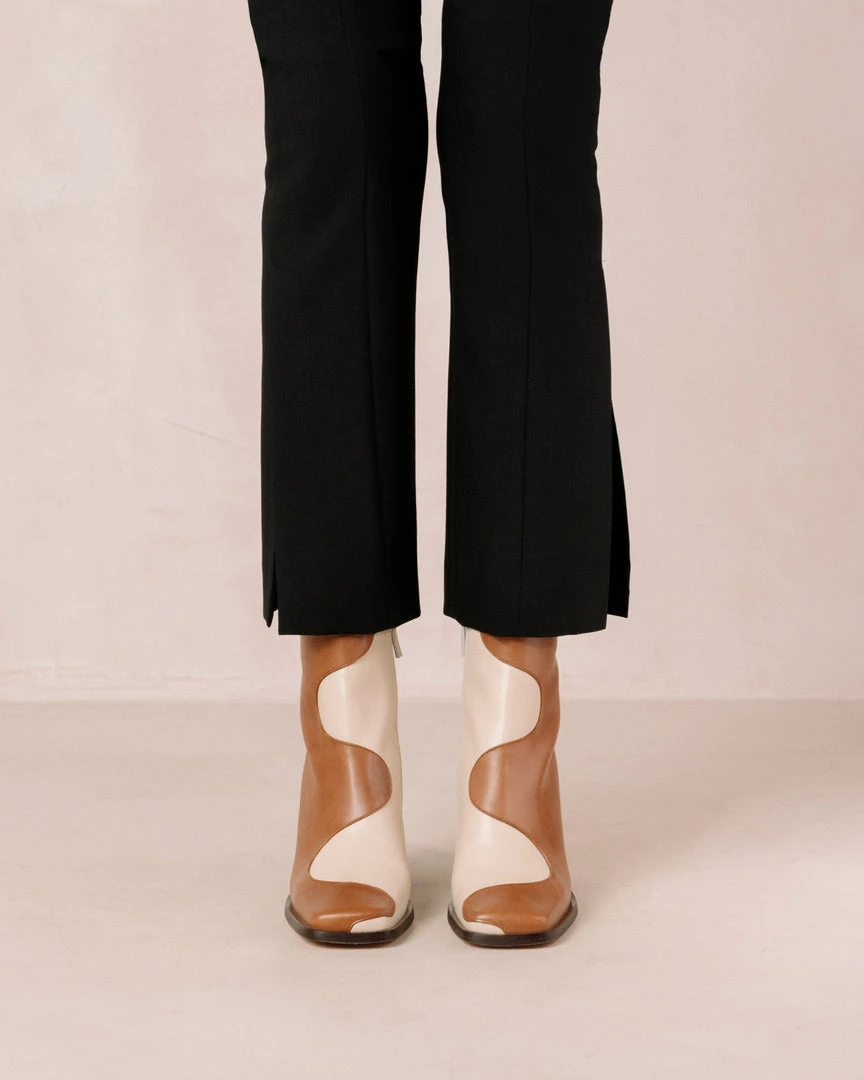 Gorgeous ankle boot with block heel, square toe and a vertical bicolor wavy pattern. The perfect statement piece for any season. Side zippers for maximum comfort.