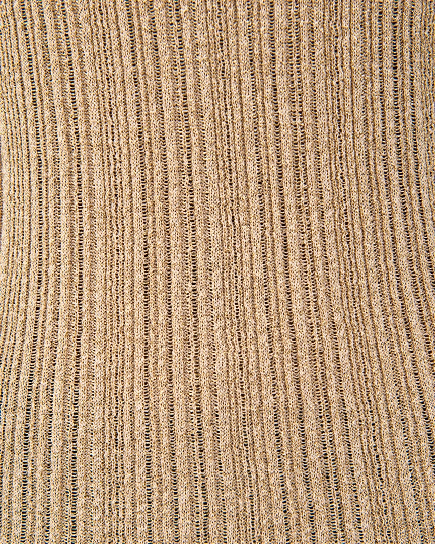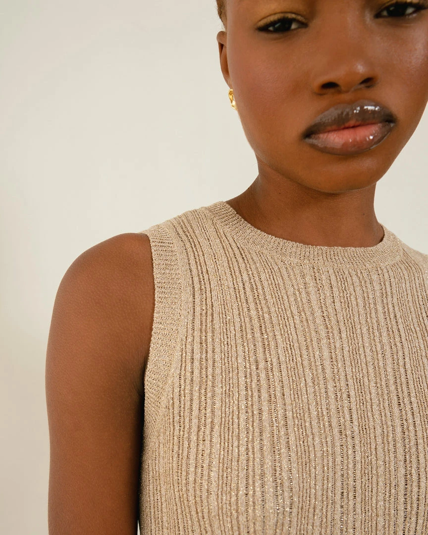 Sleeveless fitted ribbed glitter knit midi-dress featuring an open slit designed for an anything goes attitude. Simplicity, elegance, and comfort combined.