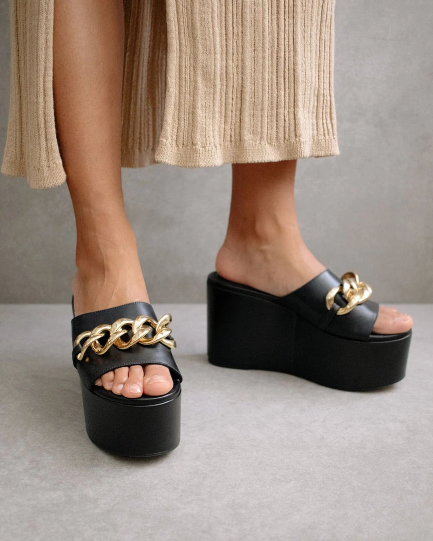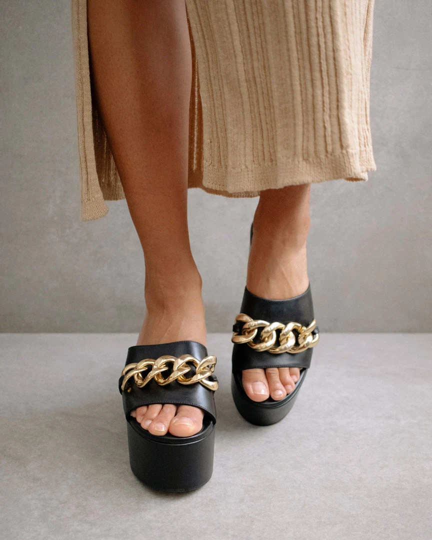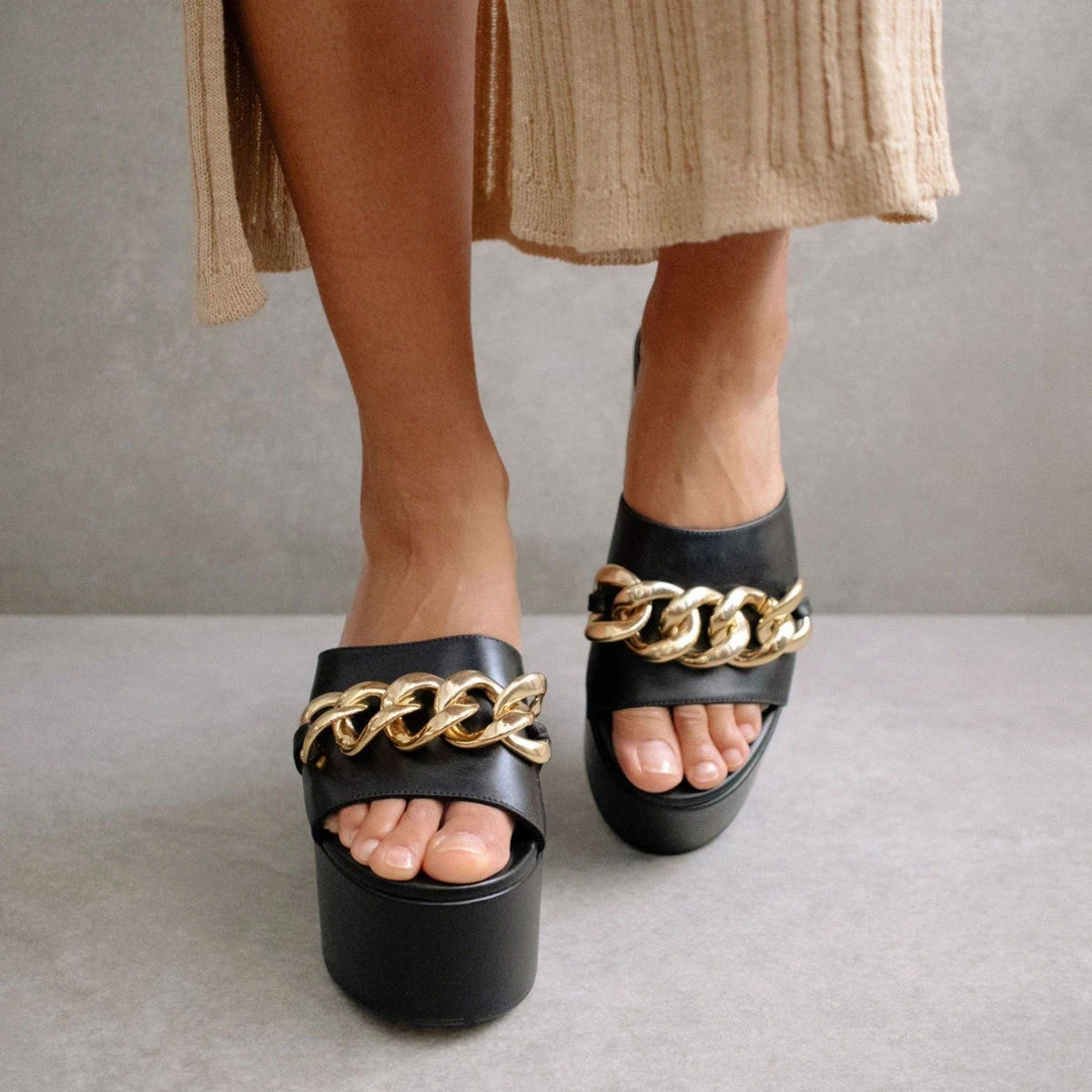 Open toed, extra chunky, maxi platform sandal featuring all leather. Embellished with a maxi link chain in gold.