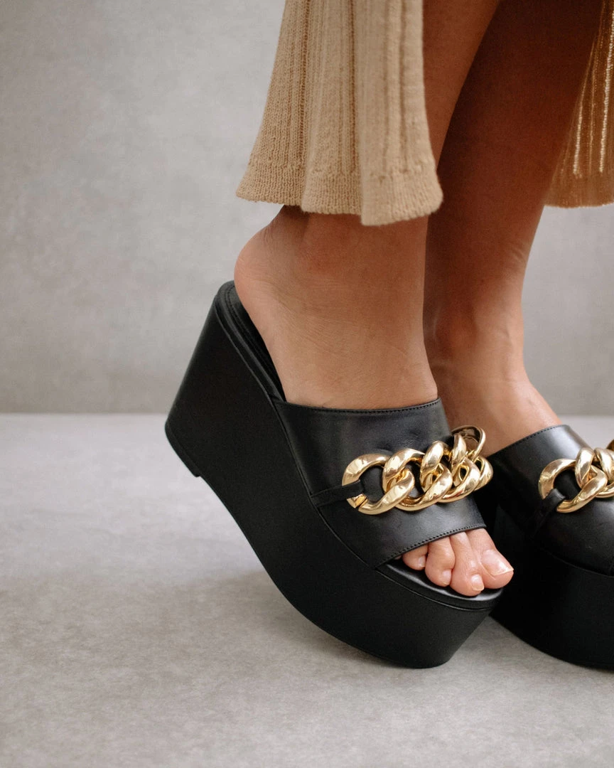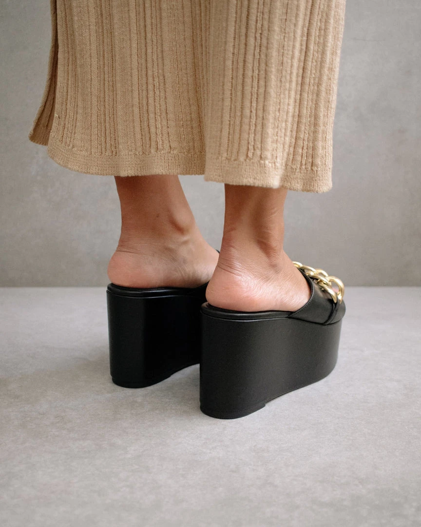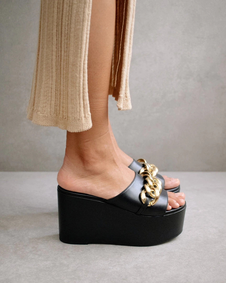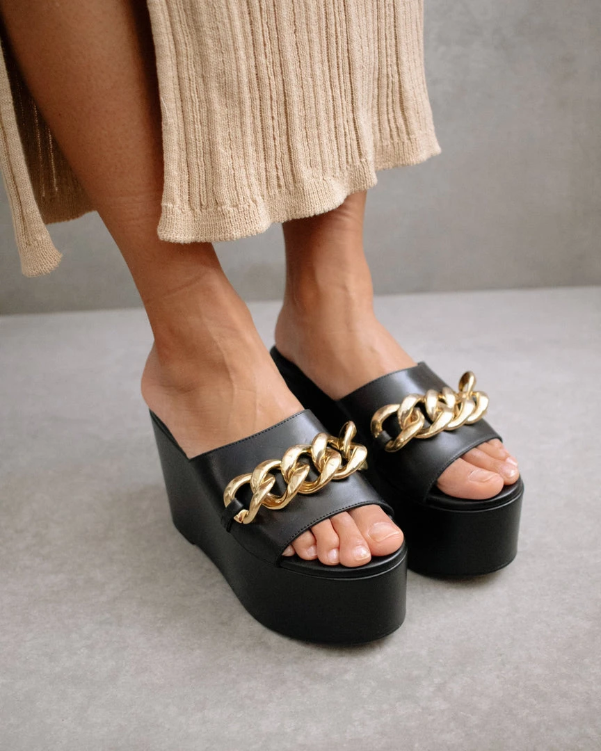 Open toed, extra chunky, maxi platform sandal featuring all leather. Embellished with a maxi link chain in gold.
