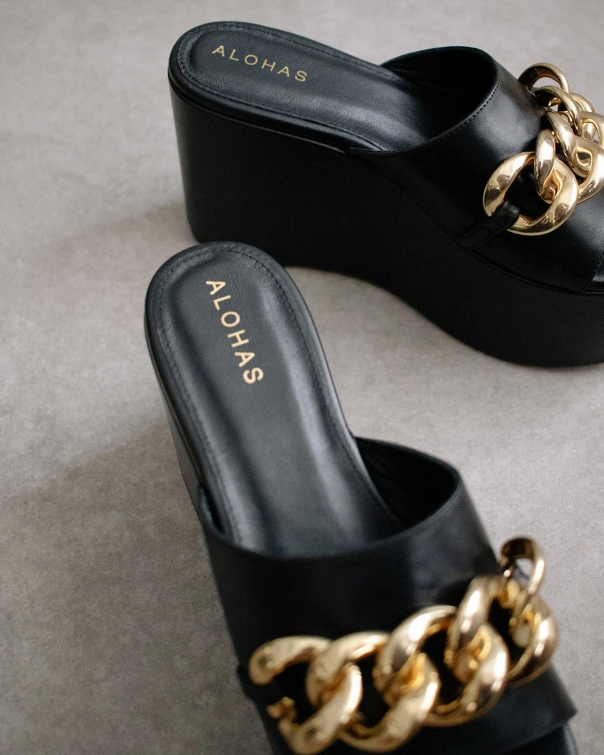 Black sandals with gold chain