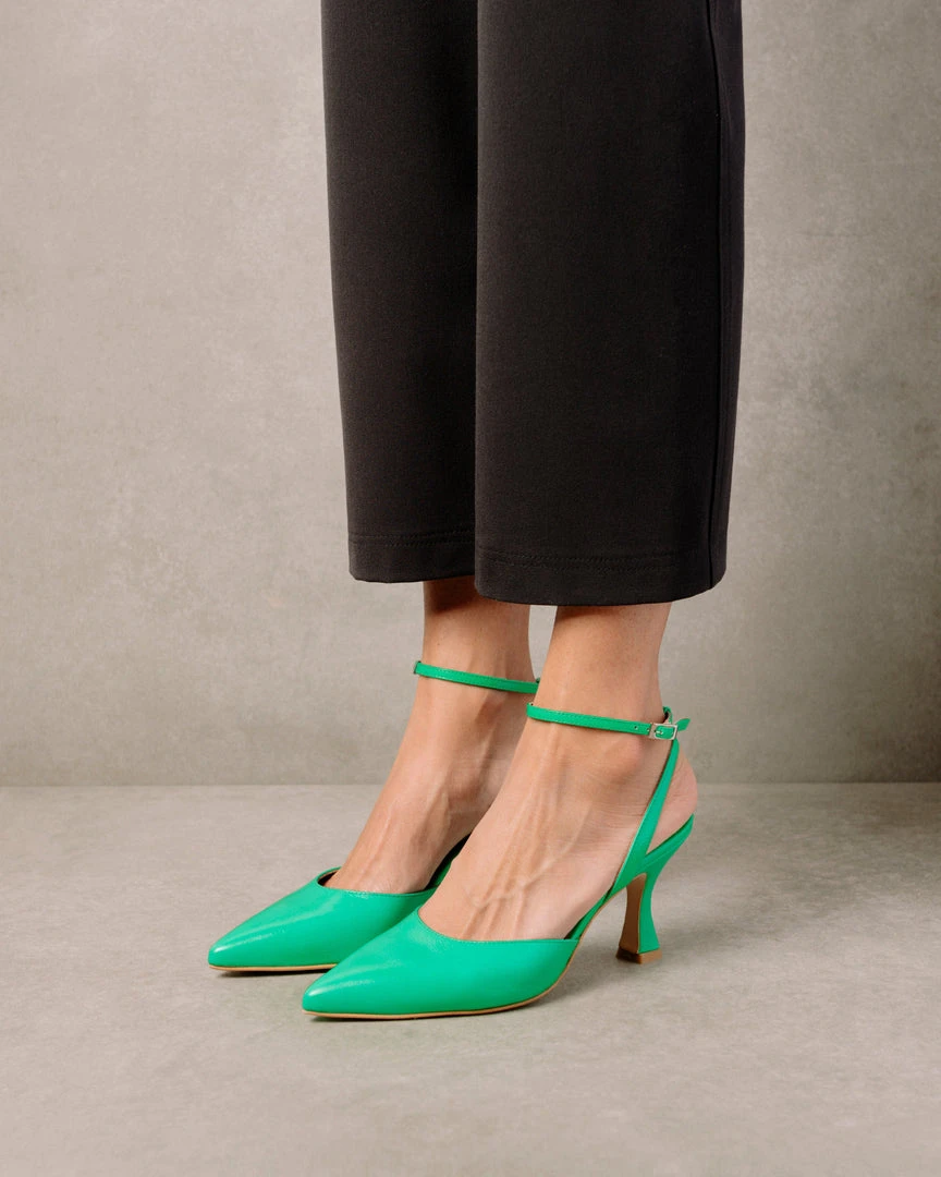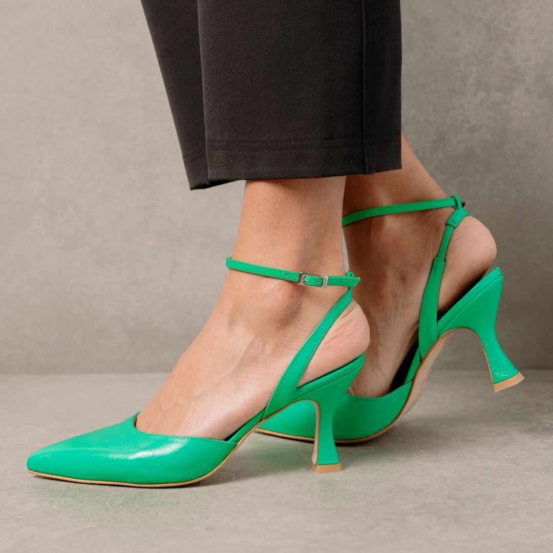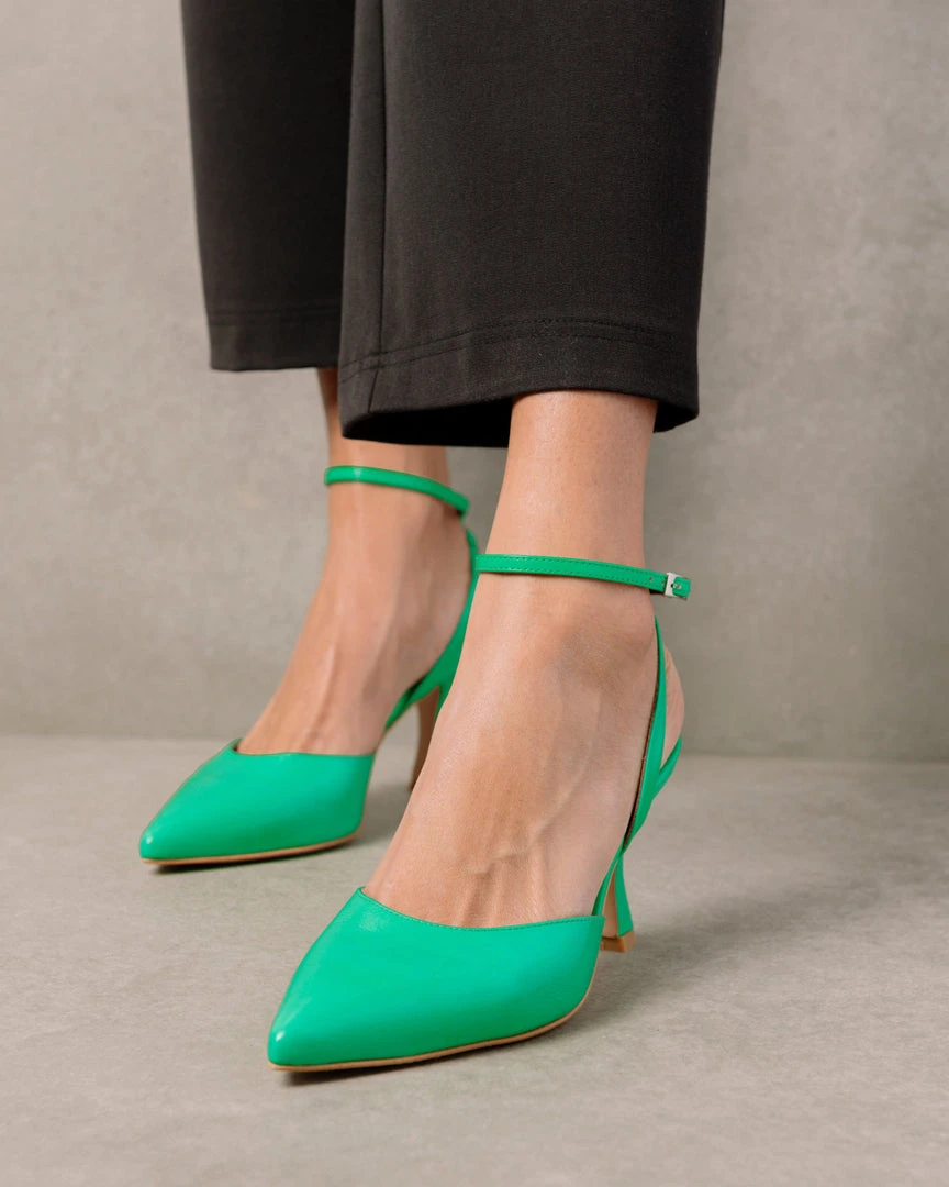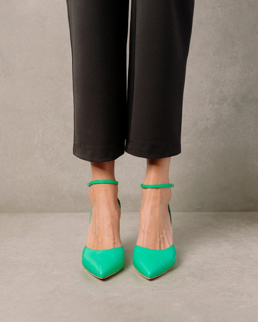 Sophisticated heel with a pointed toe and a whole lot of personality. Adjustable ankle strap for maximum comfort.
