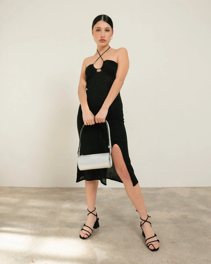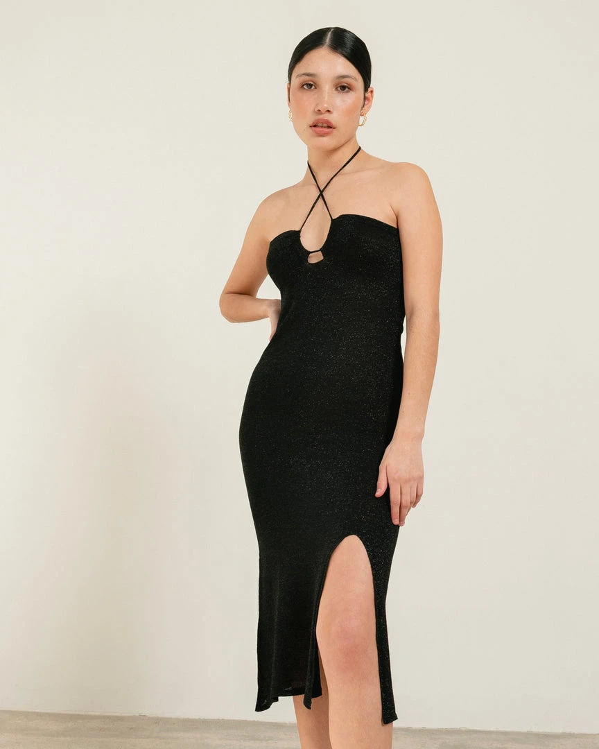 Proof that sustainably produced clothing can be sexy. Long fitted dress with a halter neck and a side slit at the bottom are the key ingredients that will make anyone queen of the dancefloor.