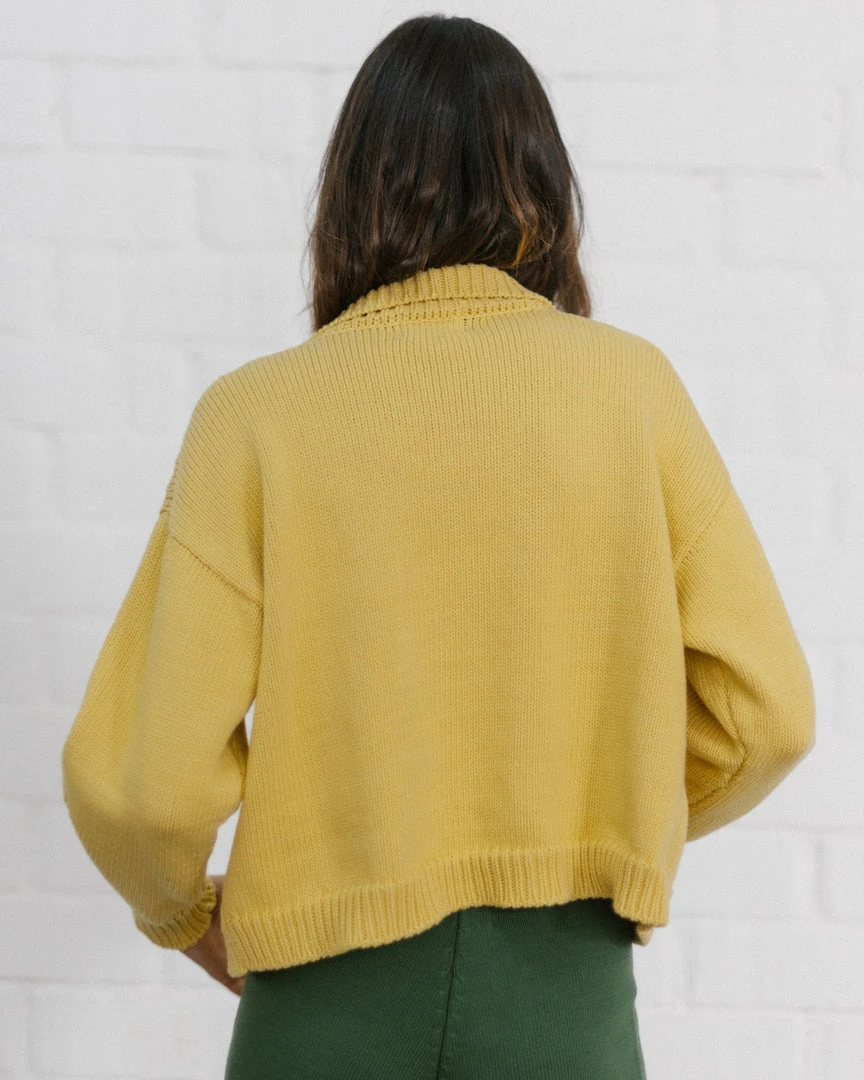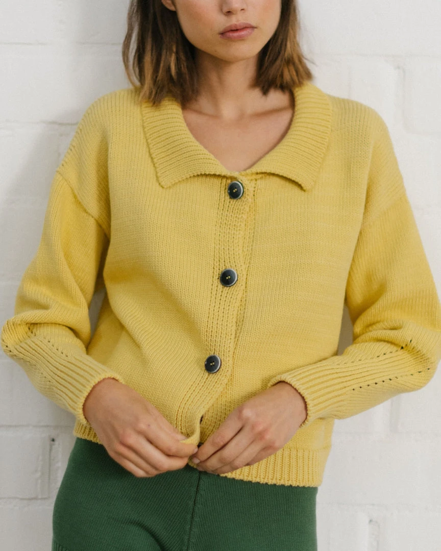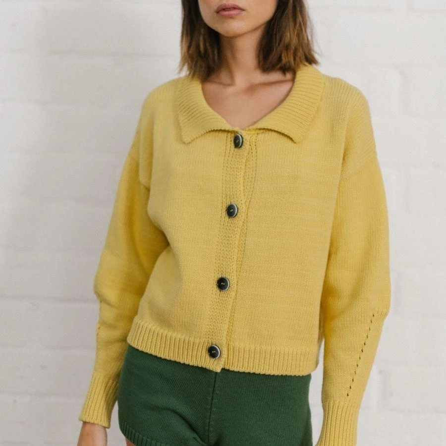Button down knit cardigan featuring a mid-sized collar. Long sleeved and slightly oversized.
