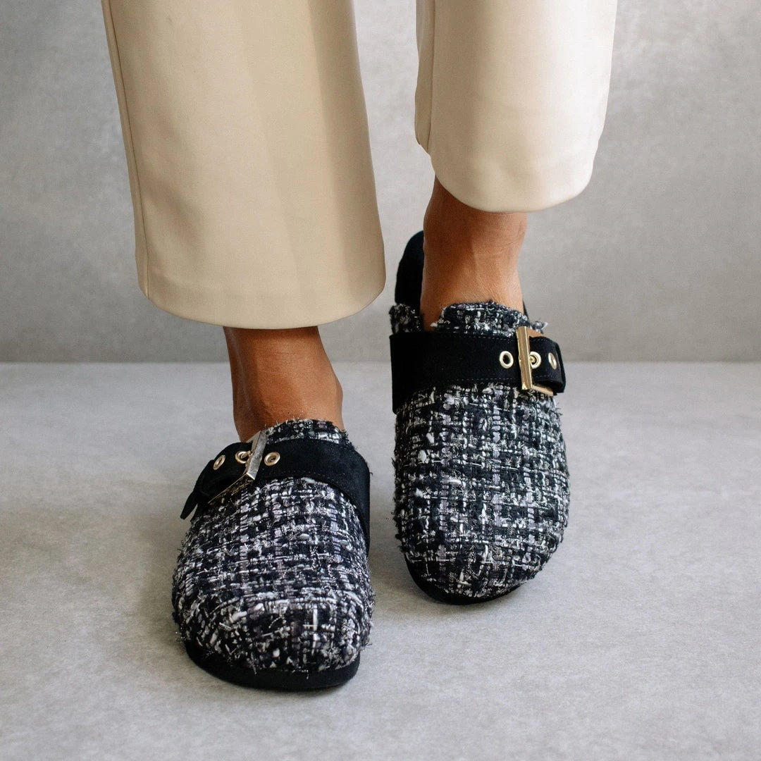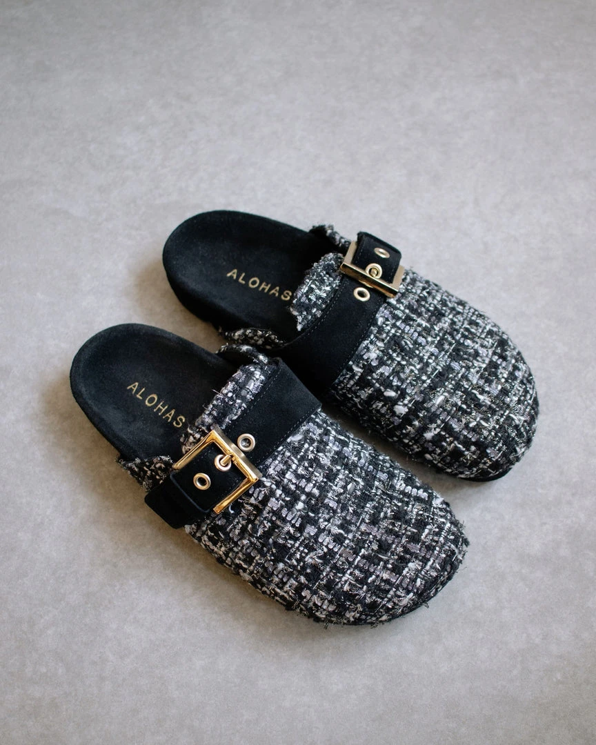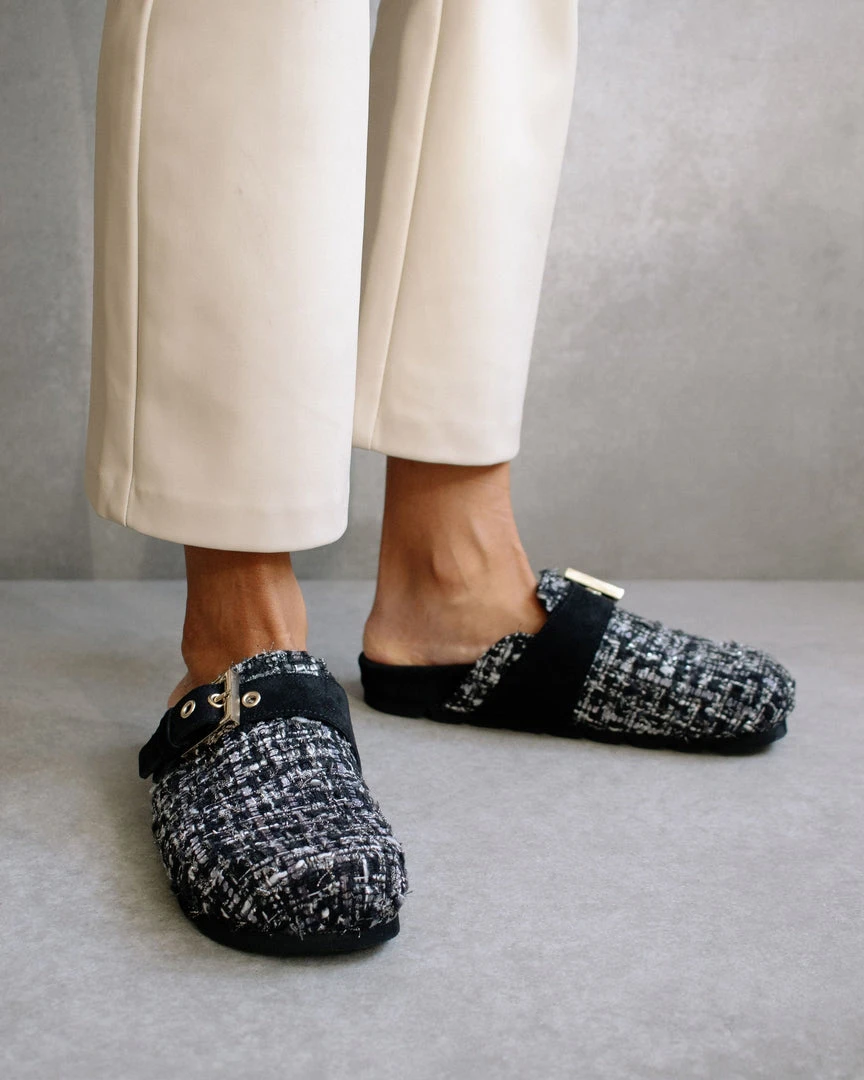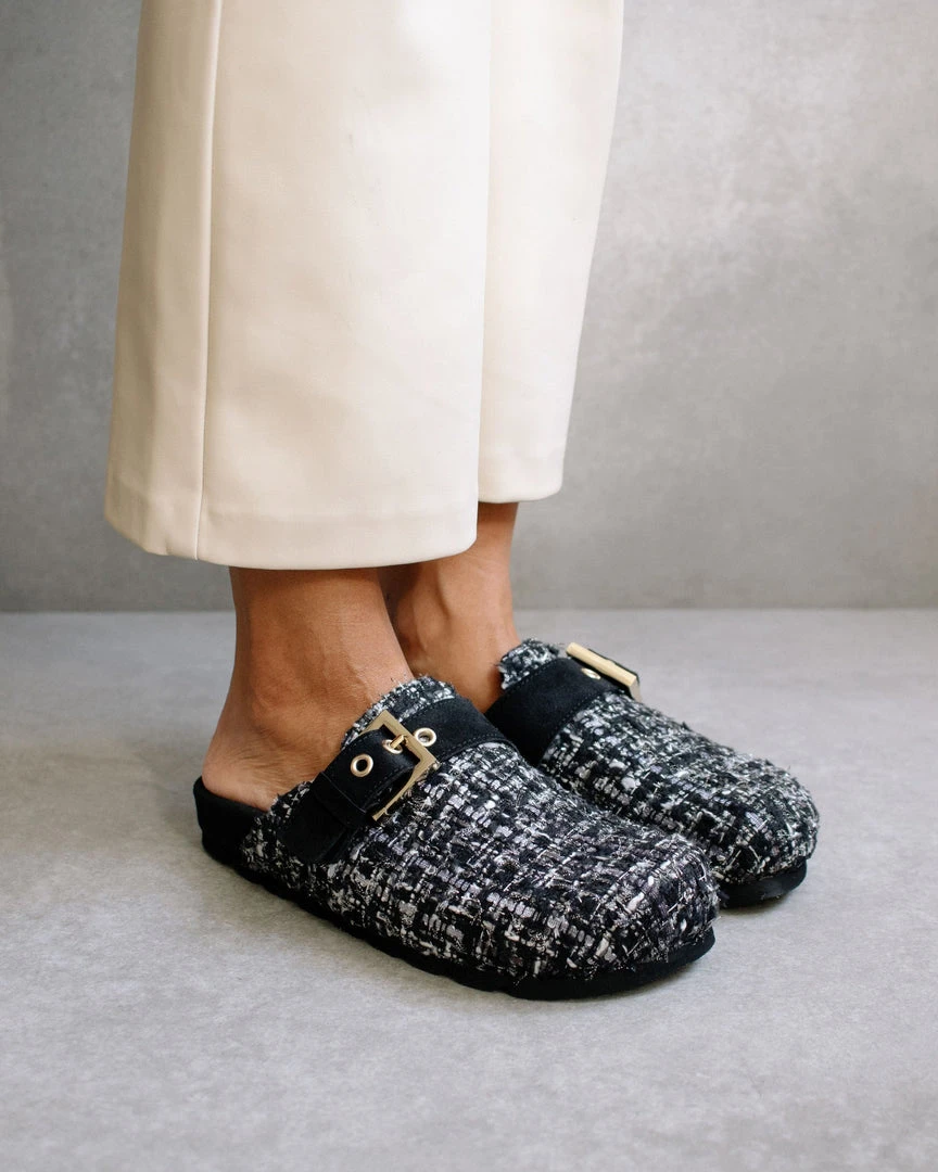 Wide, round-toed clog with an open back and a comfortable feel. Belt style buckle with three openings up front.