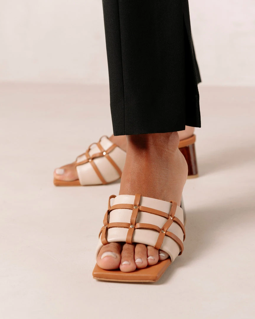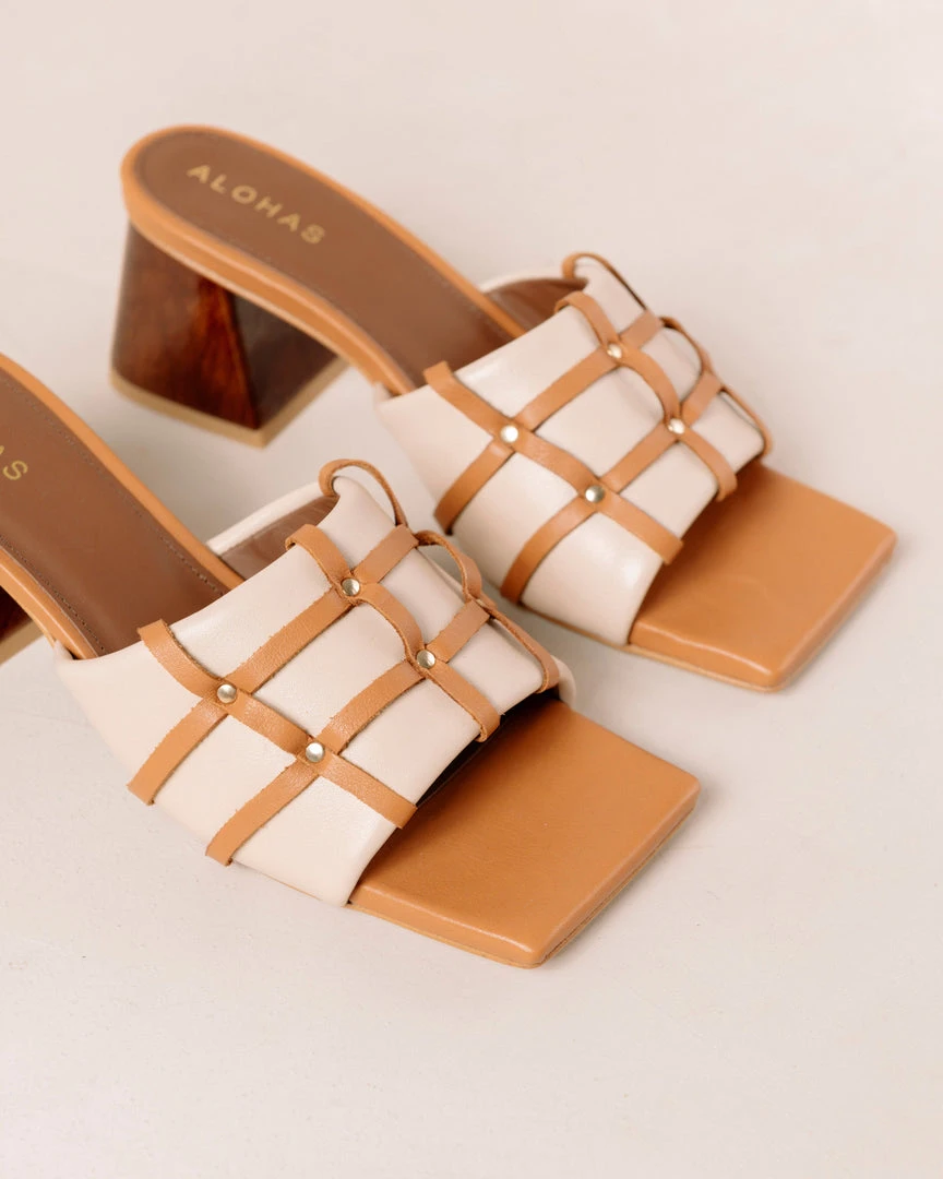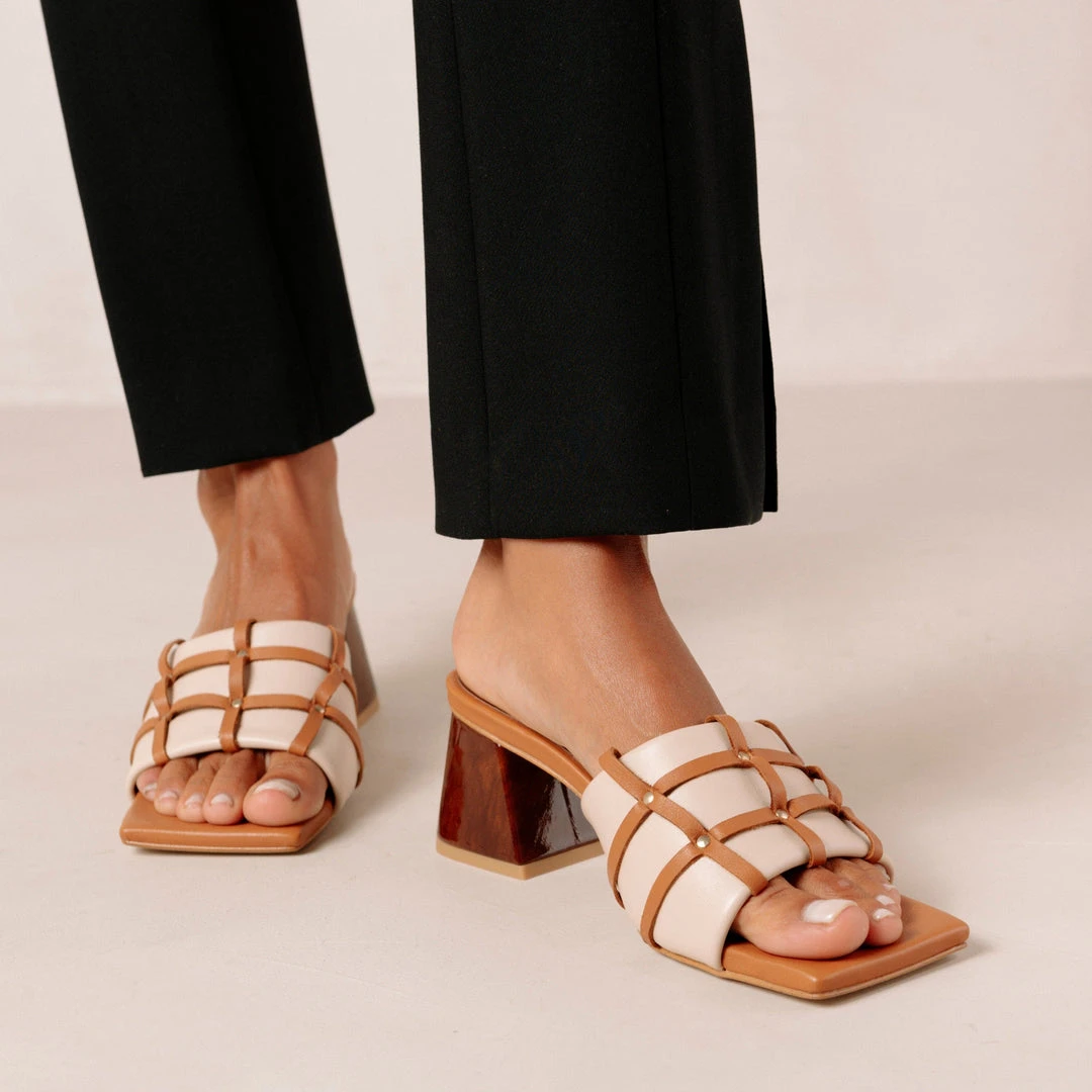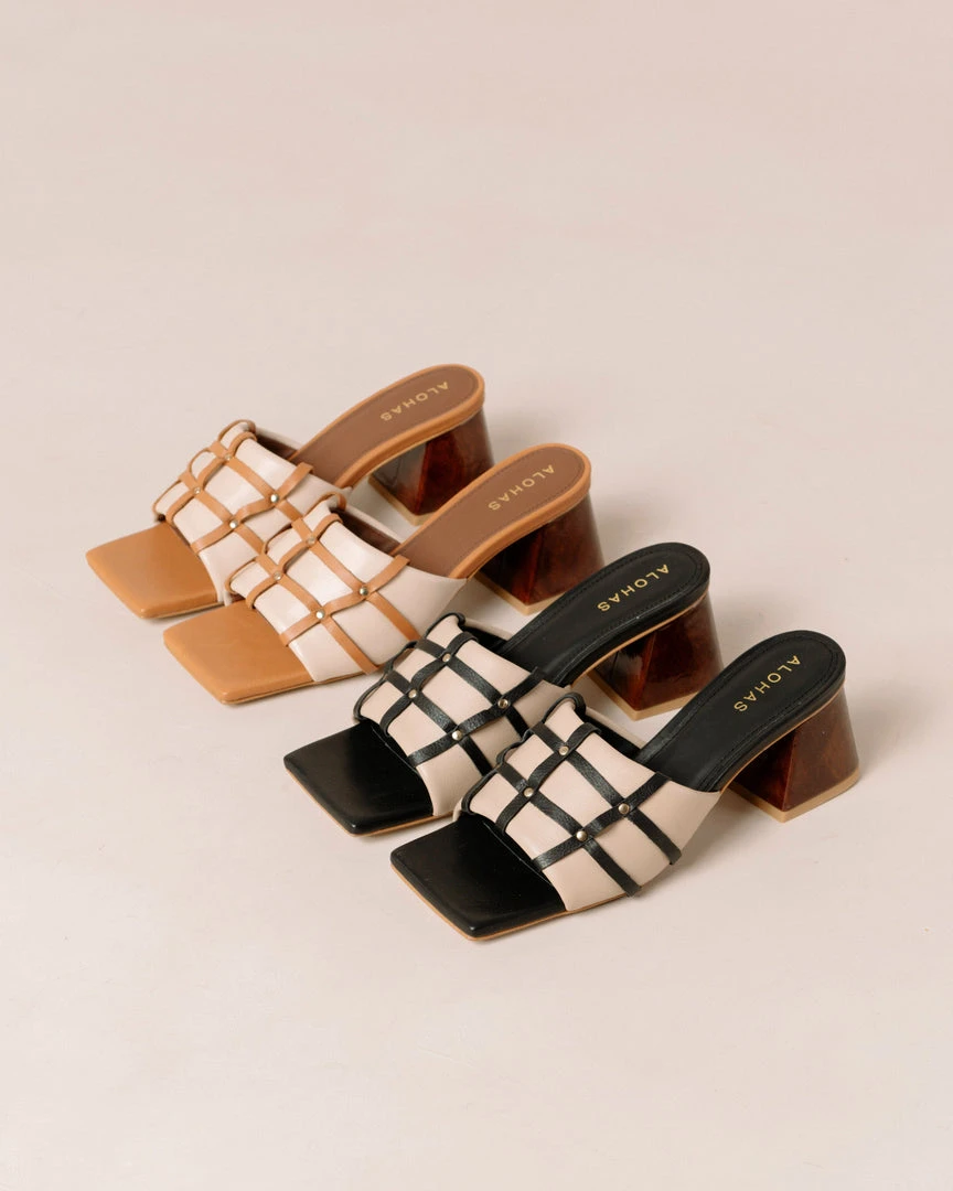 Low heeled sandal heels with a square toe and grid patterned front. Sleek in design and the undisputable choice for comfort.