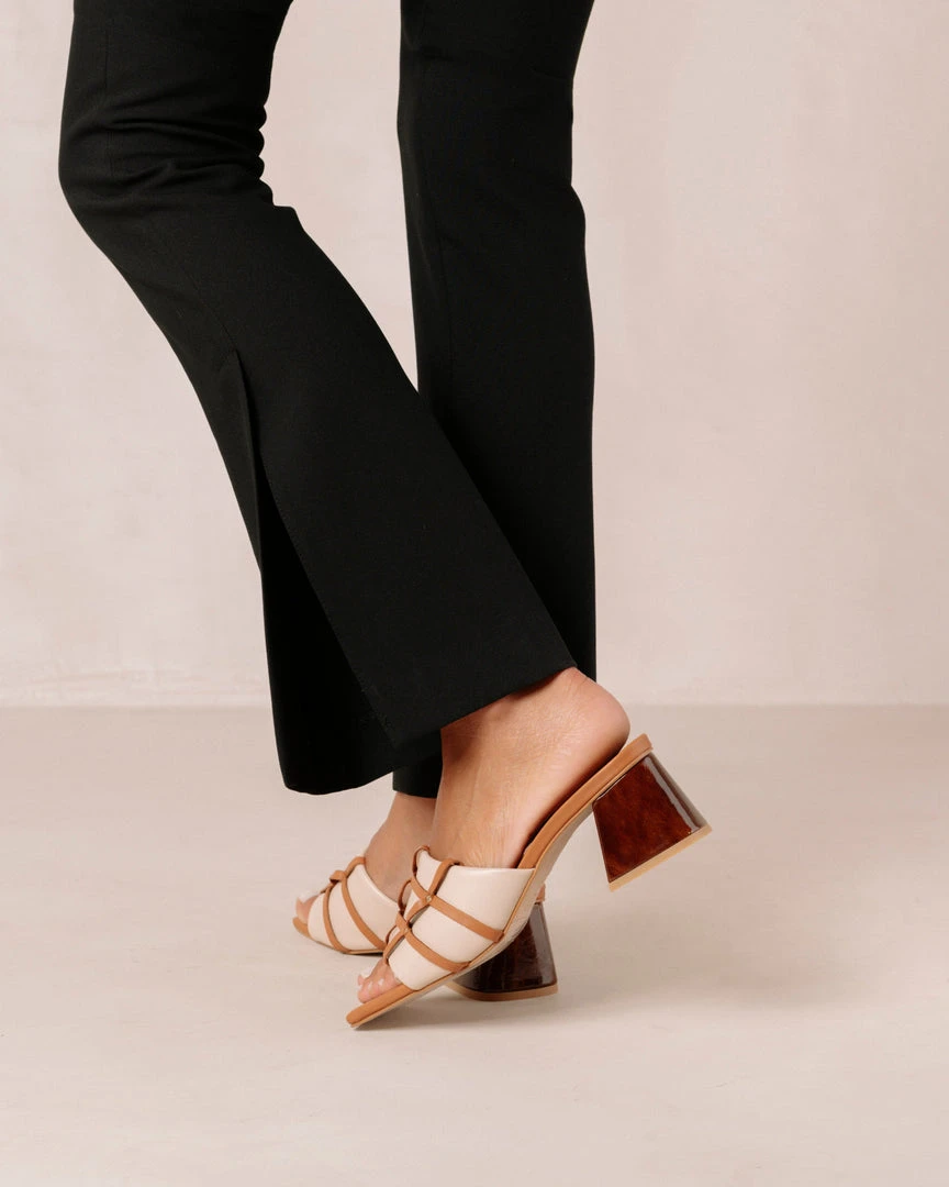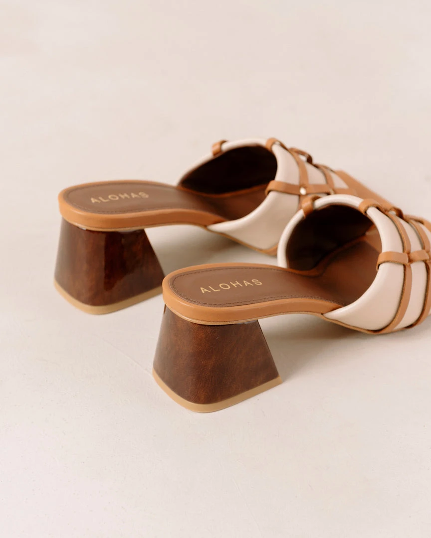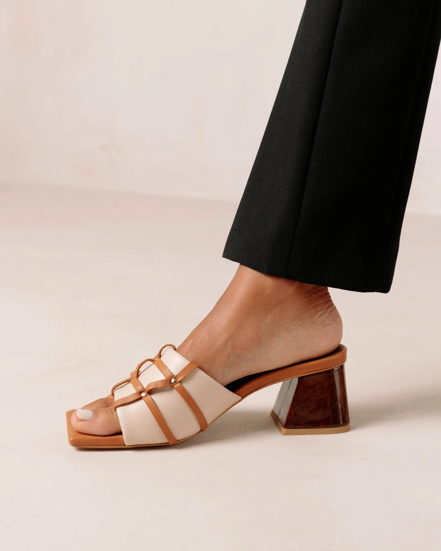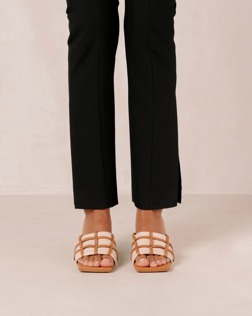 Low heeled sandal heels with a square toe and grid patterned front. Sleek in design and the undisputable choice for comfort.