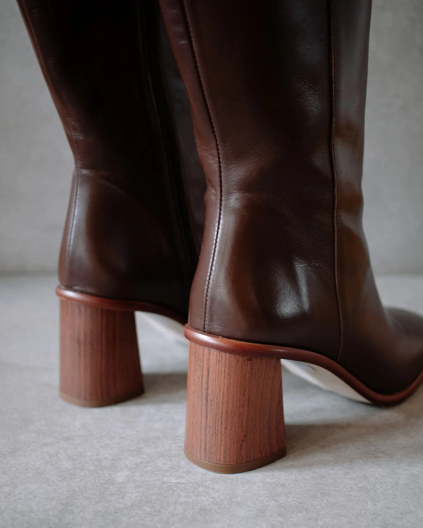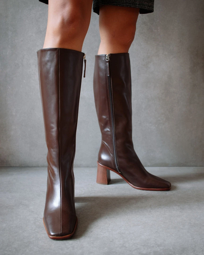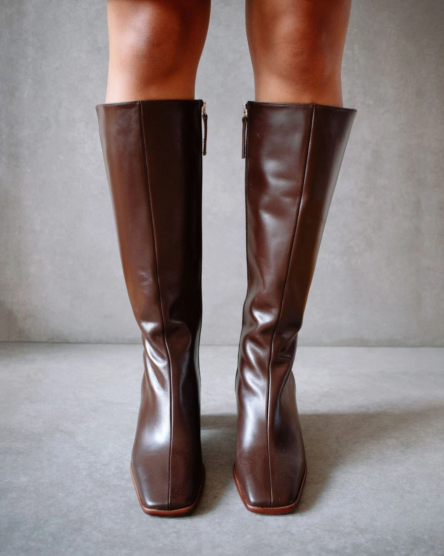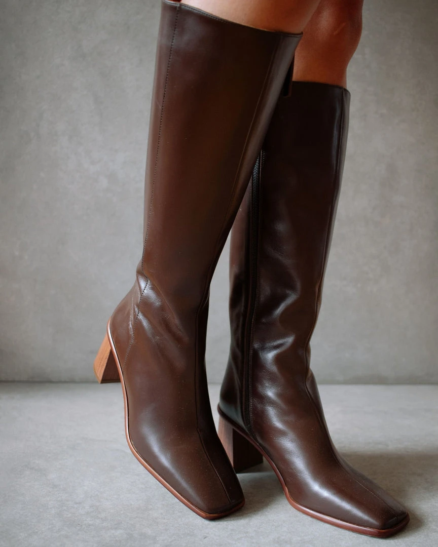 Bold and glamorous. A riding boot inspired model made special with its square toe and block heel. Side zipper for added comfort and a slim fit.