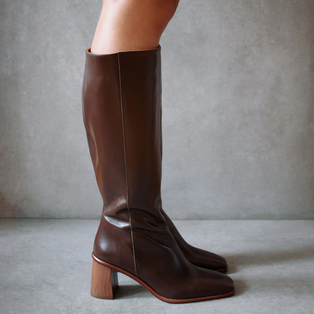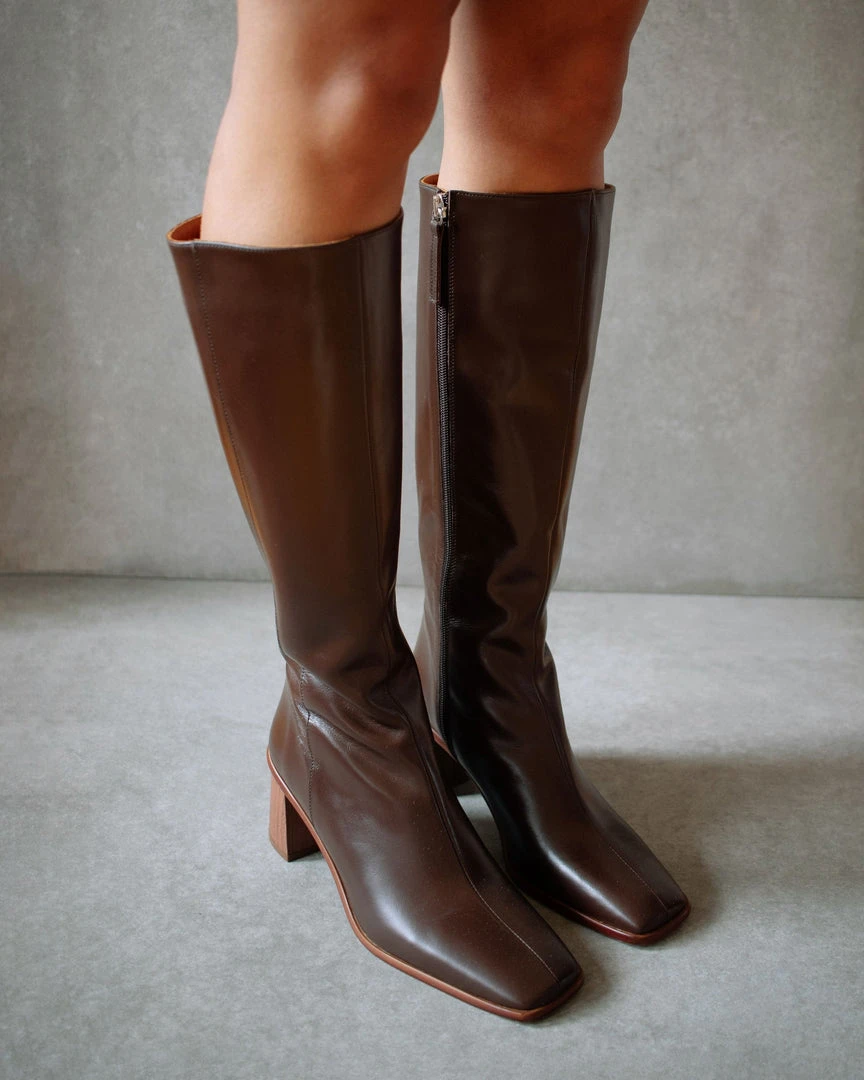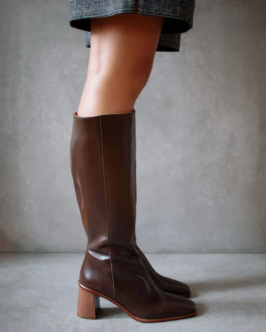 Bold and glamorous. A riding boot inspired model made special with its square toe and block heel. Side zipper for added comfort and a slim fit.