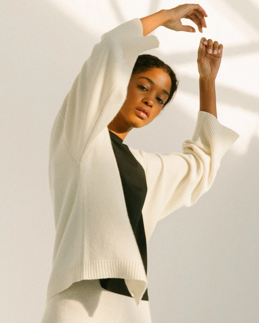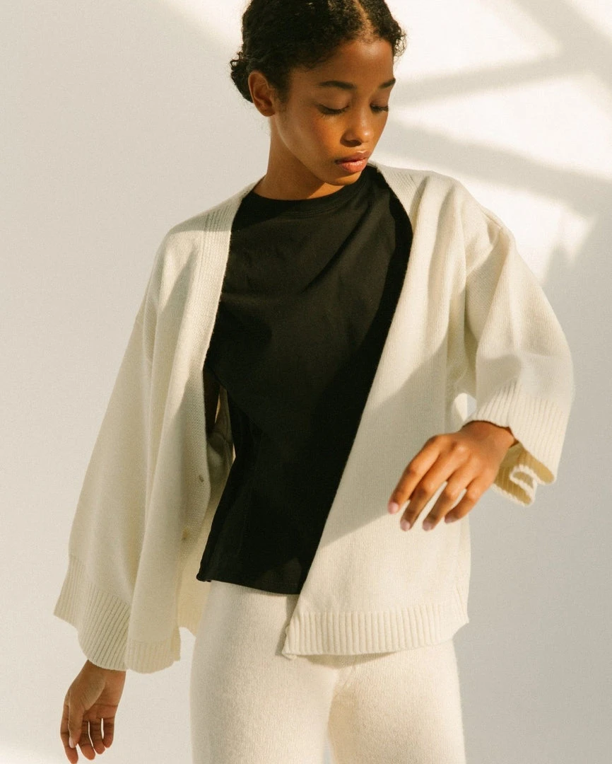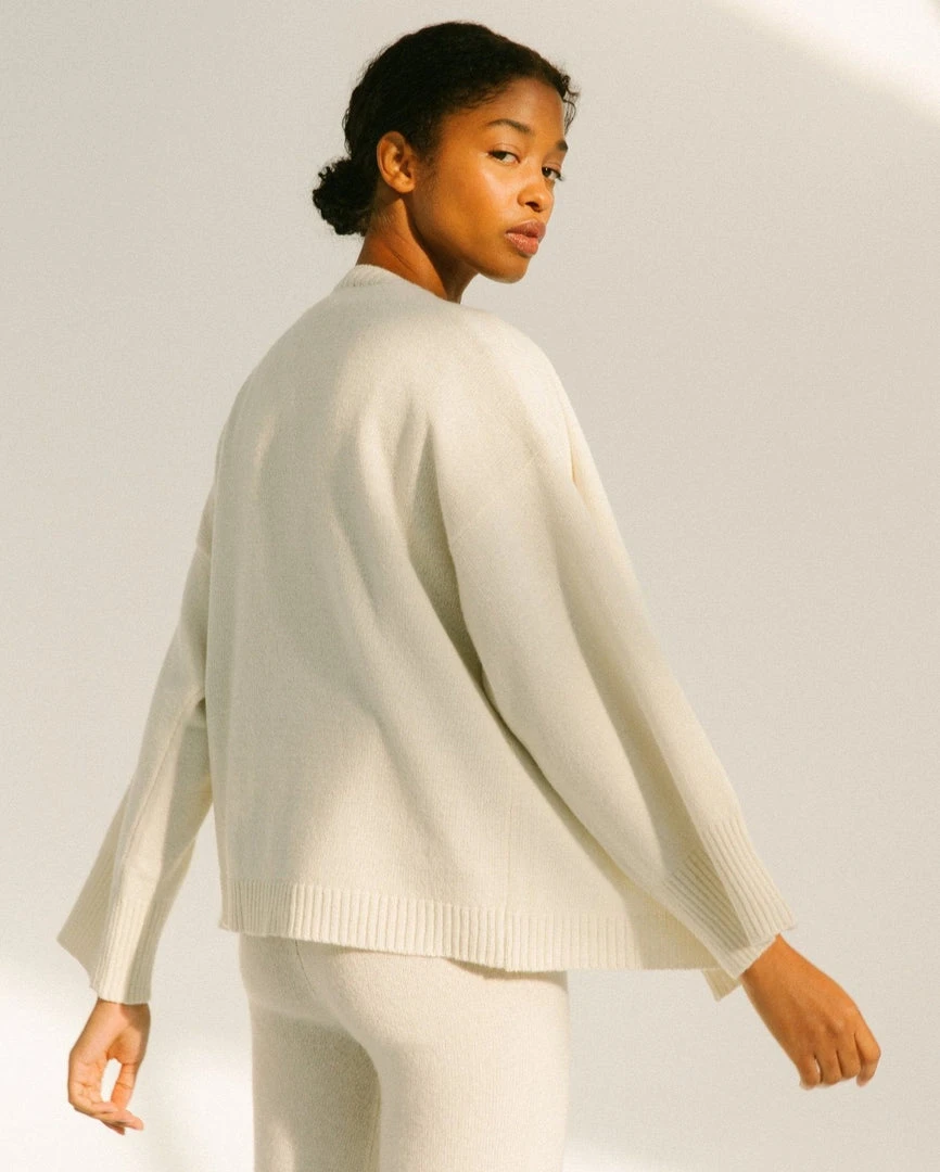Get your morning dose of comfy with Expresso. A buttoned V-neck cardigan with wide, flowy sleeves made with virgin wool and cashmere. Dress it up or dress it down, this one’s here to stay for good.