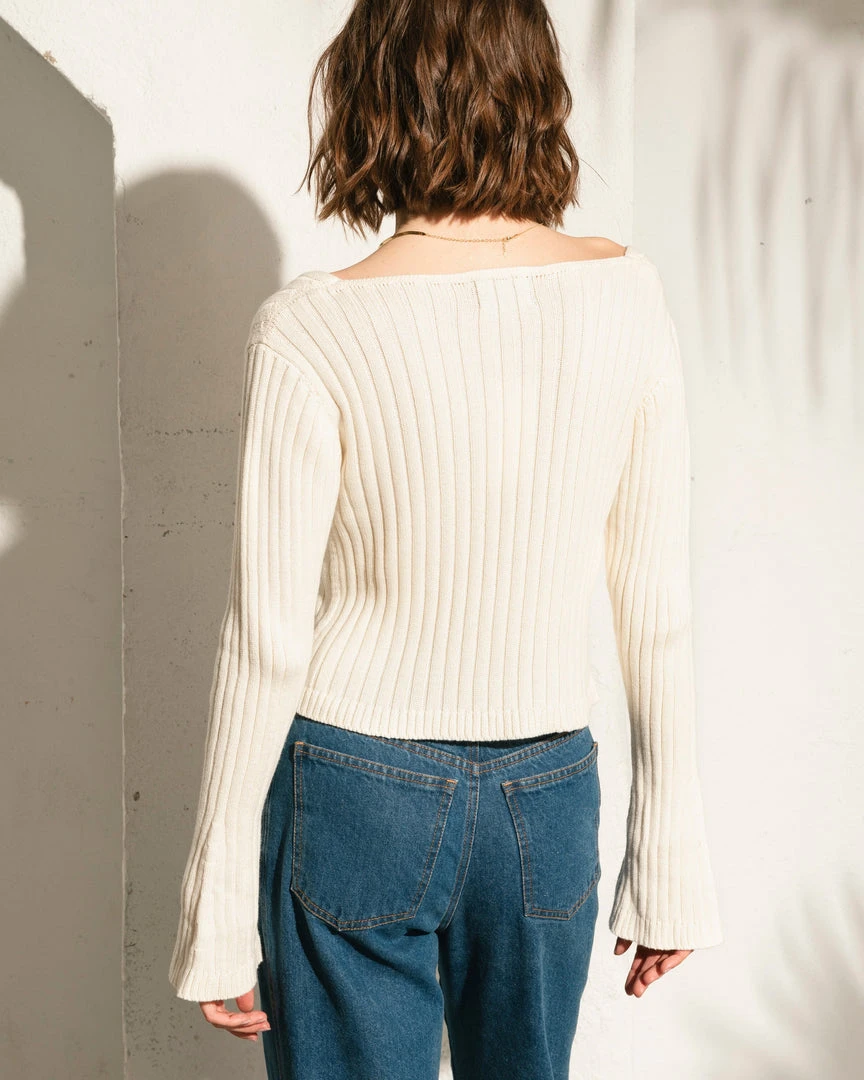 No-button knit cardigan laced at the front with a thin bow. Fit to form and long sleeved.