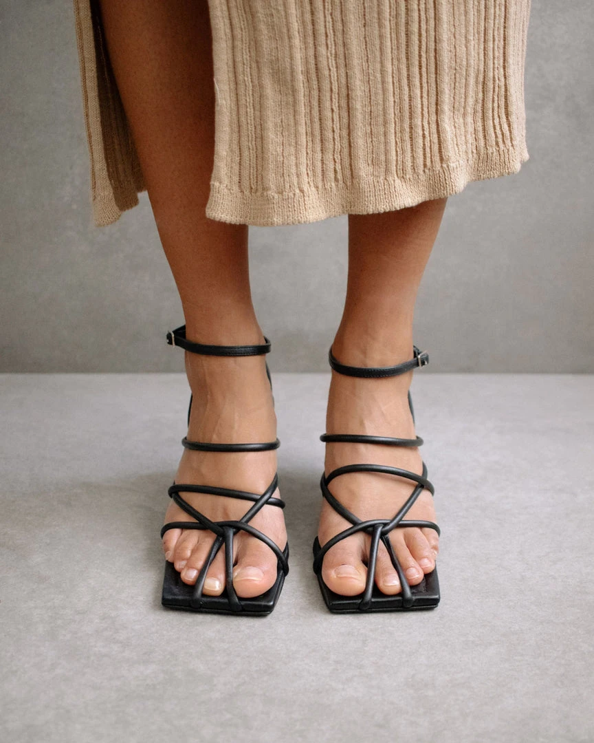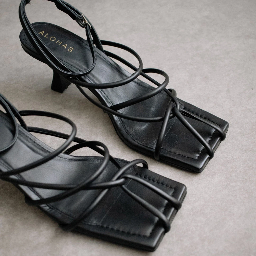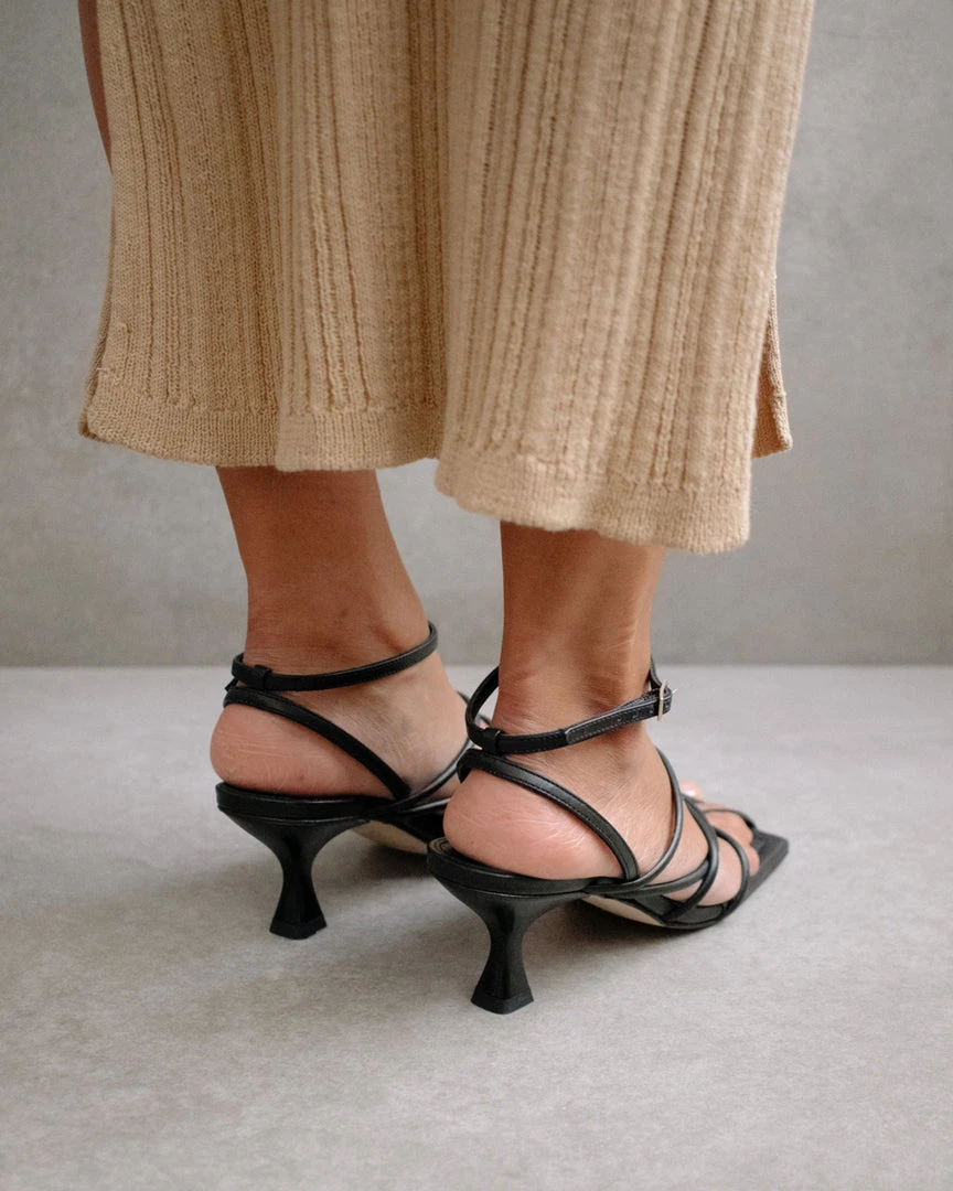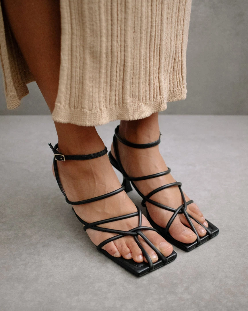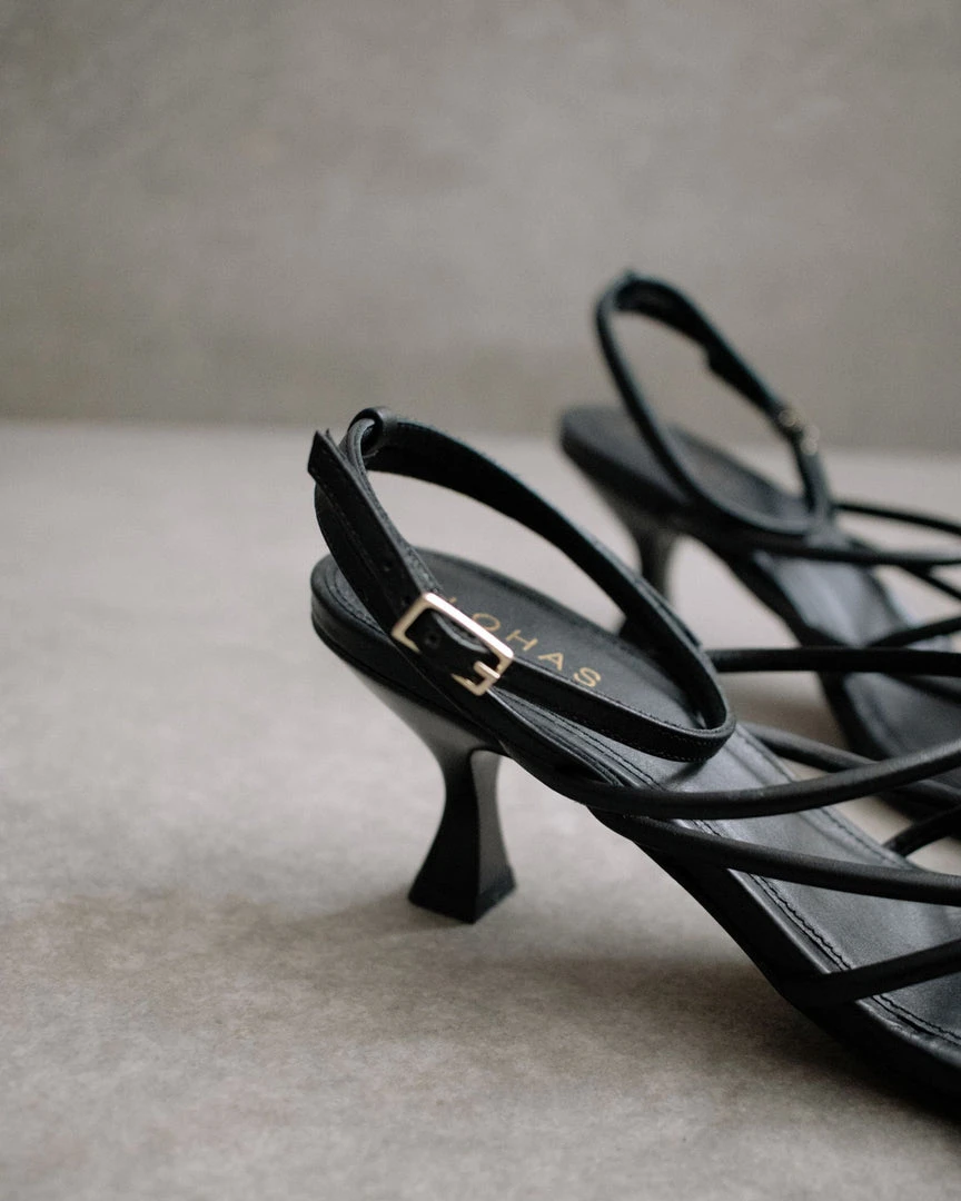 Geometry inspired sandal featuring five front straps in V-shaped and horizontal directions. Kitten heel, buckled up the ankle, with an extra back hold.