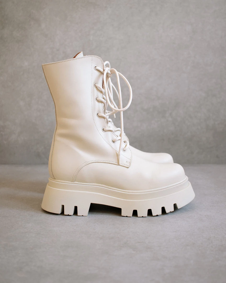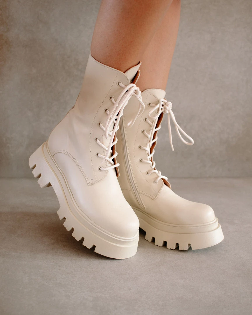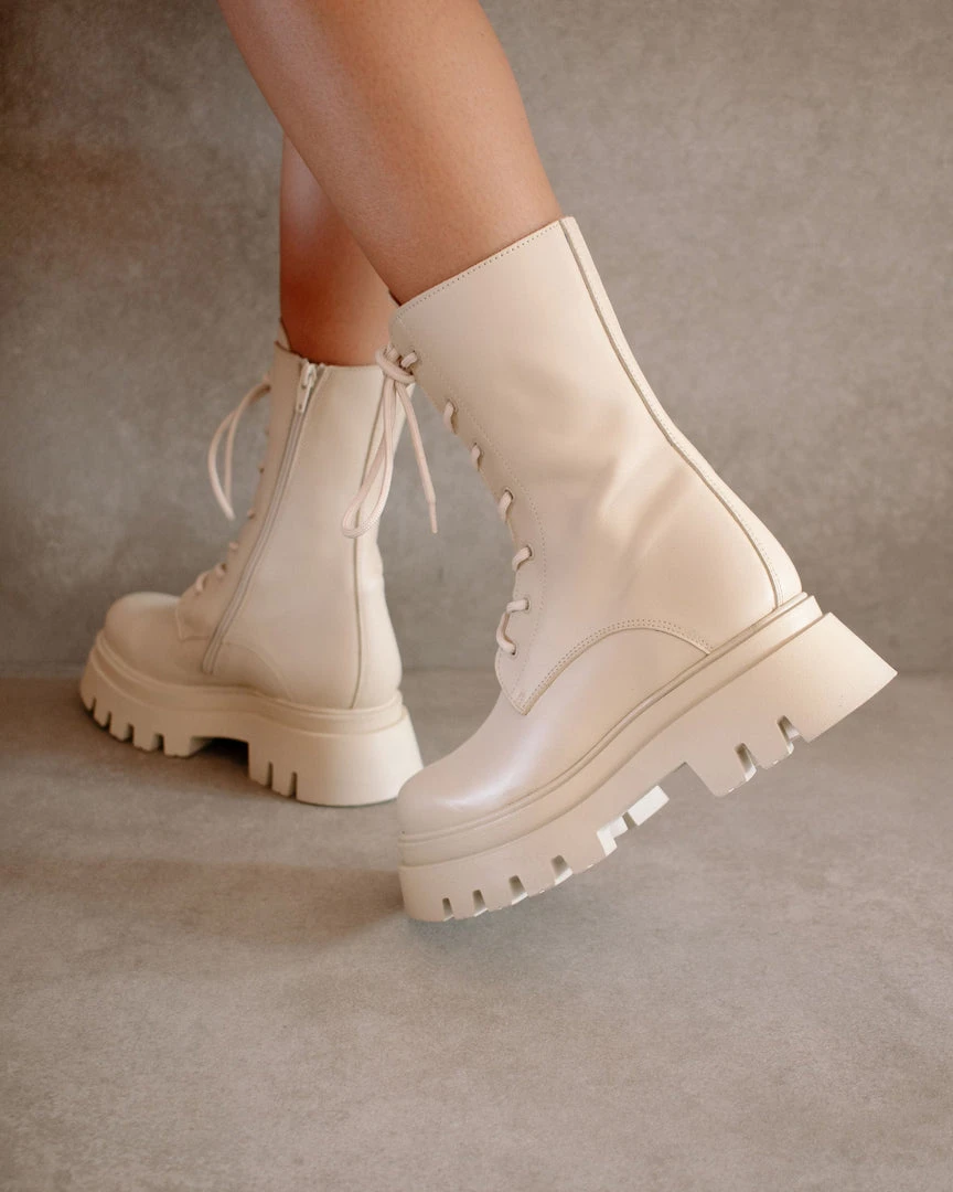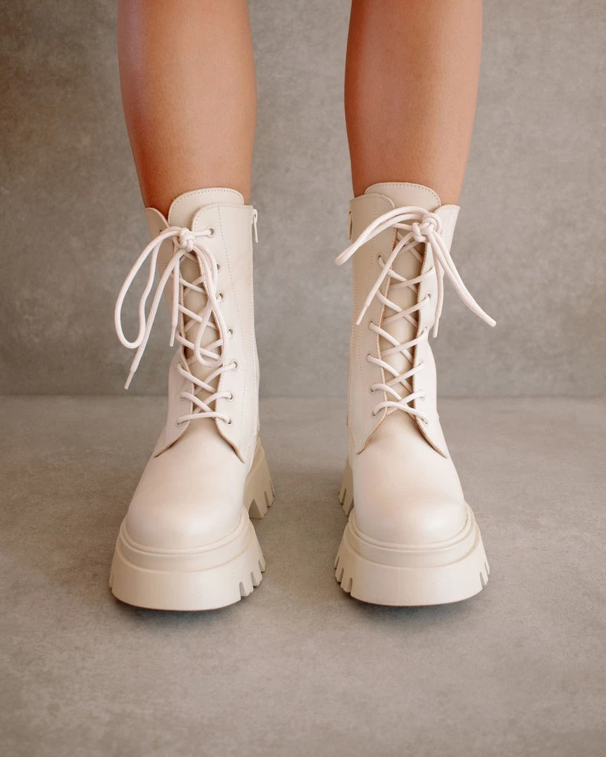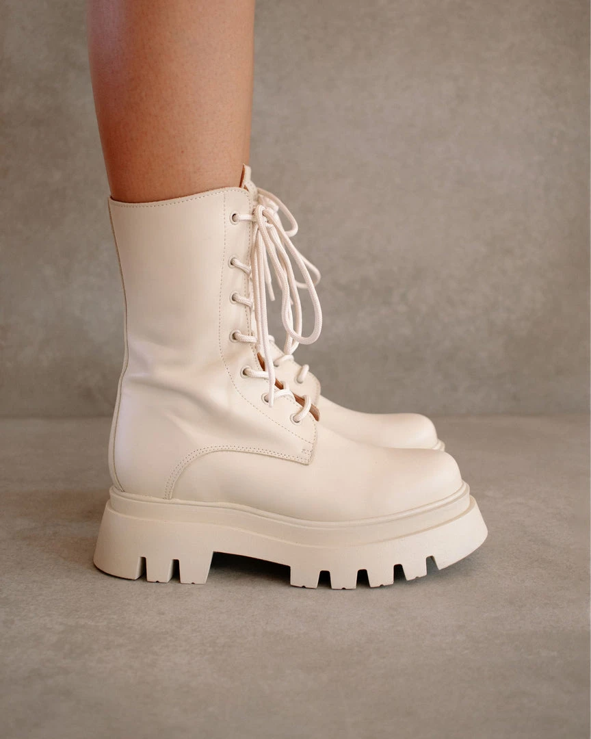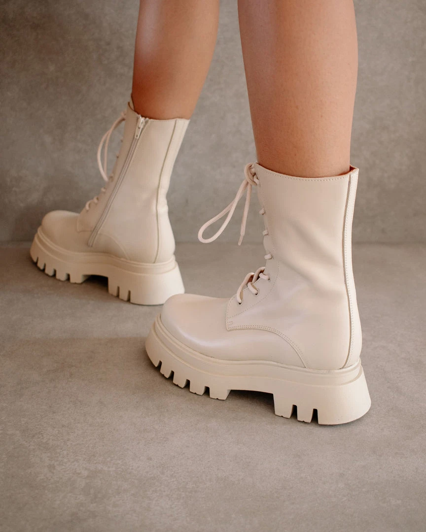 Chunky combat boots with a maxi track sole. Extra comfortable thanks to their certified leather material and lace up detail.
