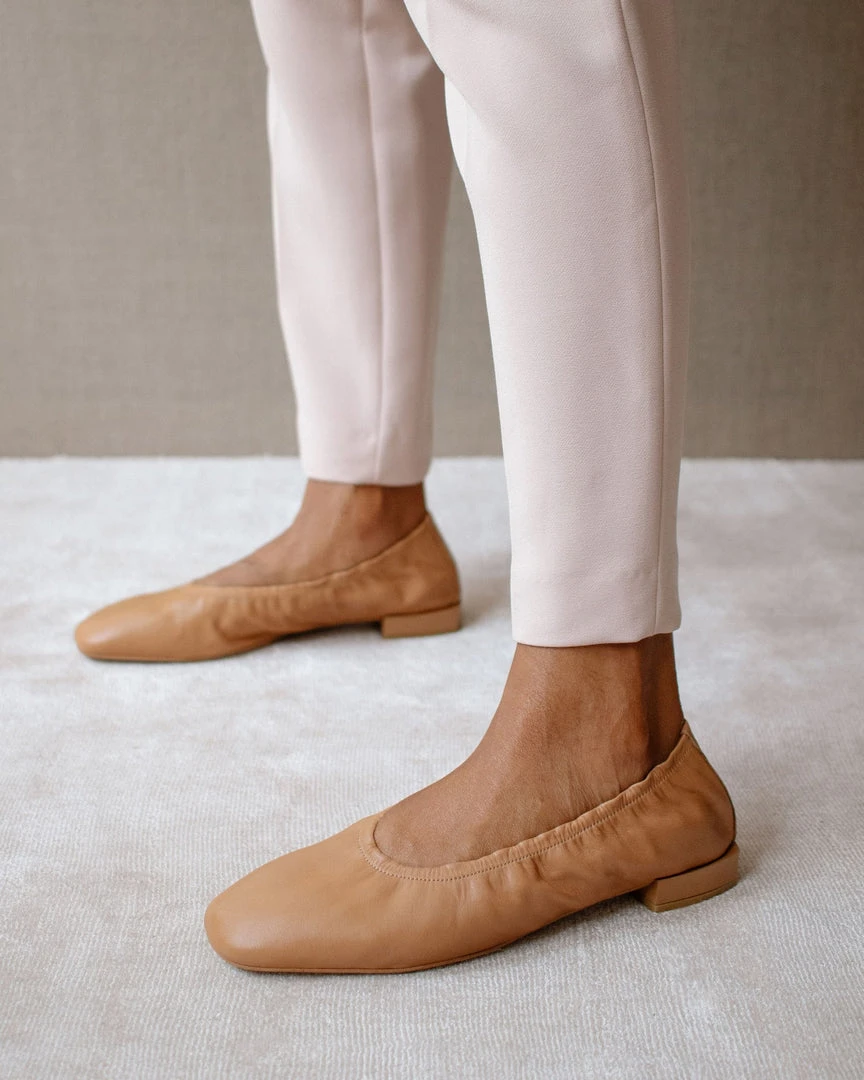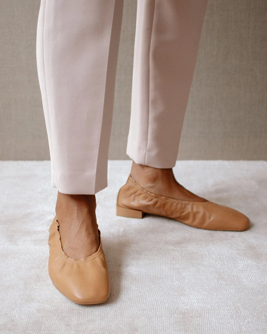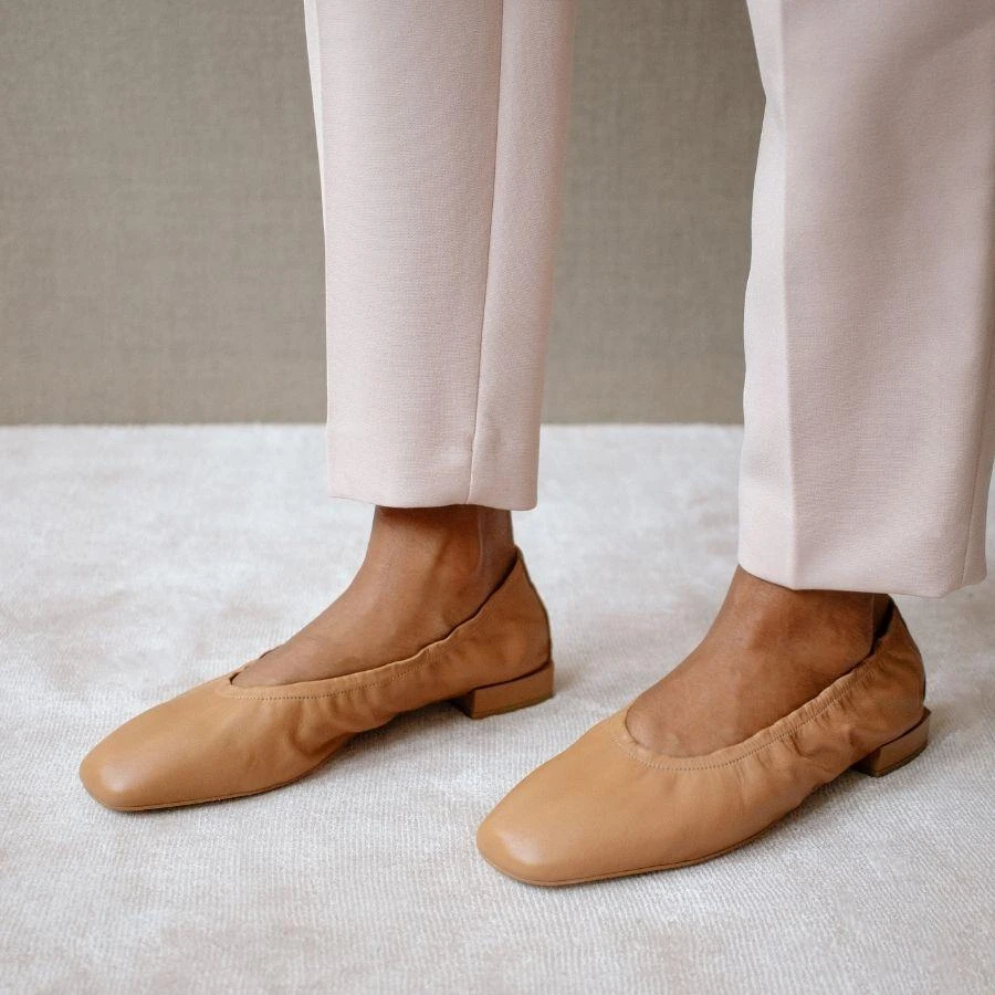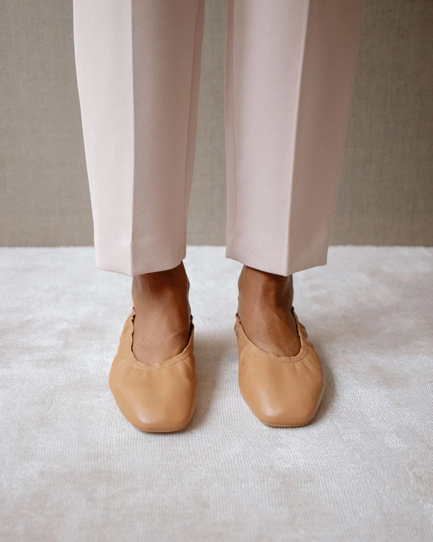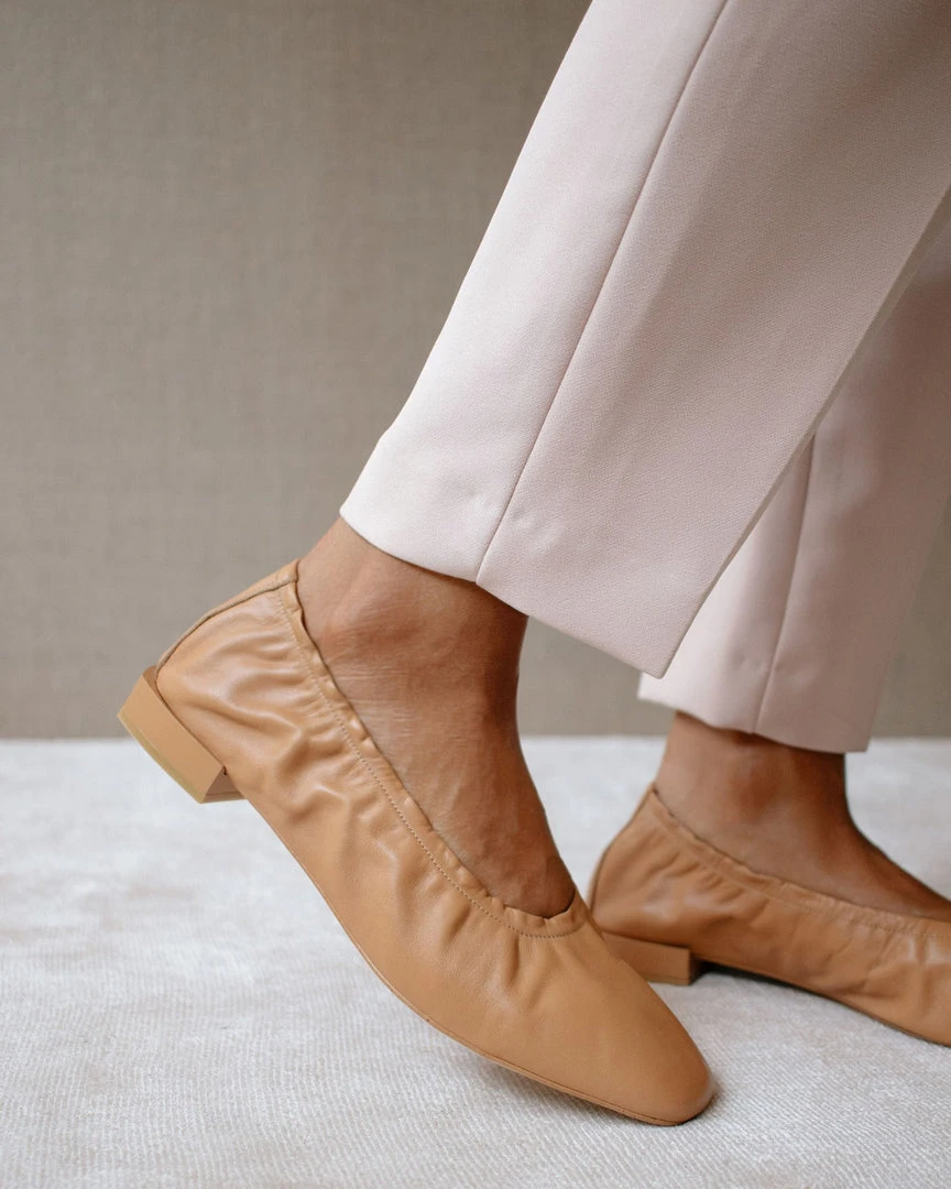Brown-coloured flat leather ballerinas. Habibi Camel ballet flats combine this season’s obsession with luxurious leather and stylish square toes. They’ve been handmade in Spain. Gathered leather upper and flexible sole designed to offer greater comfort.