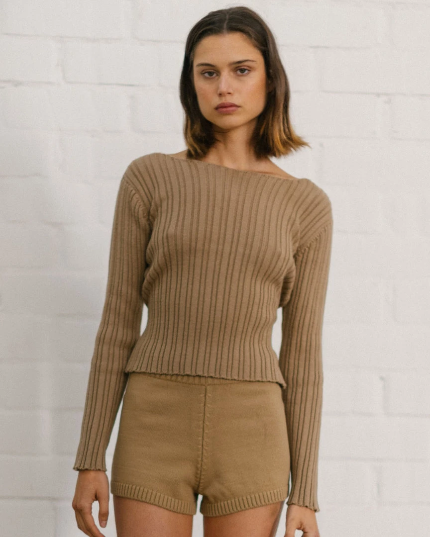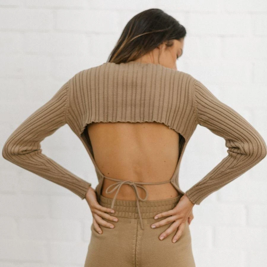 Knit sweater with full front cover that contrasts its 2/3 open back tied together with a thin lace.