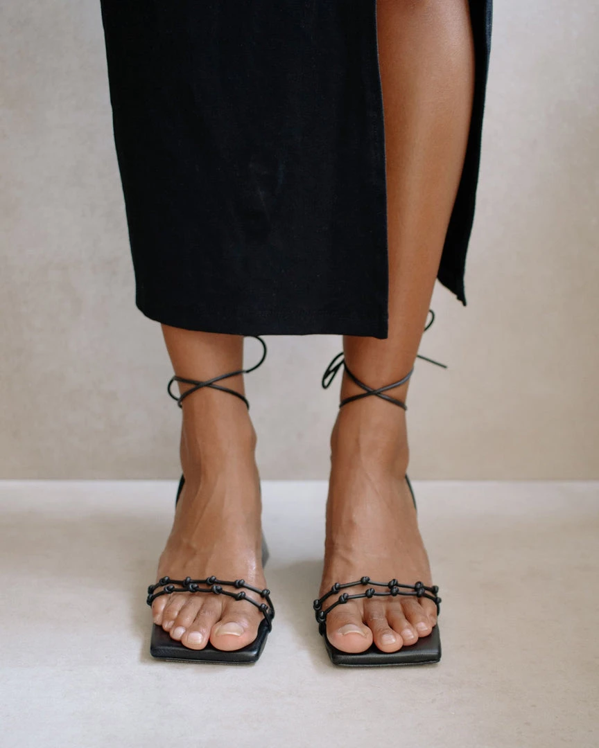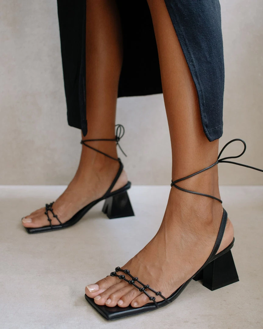 Featuring a thinly knotted double front strap. Open toed, square soled sandal featuring an A-shaped pyramid block heel. Laced up the ankle.