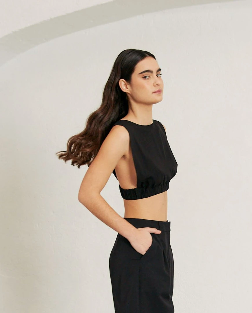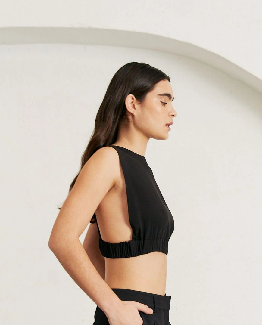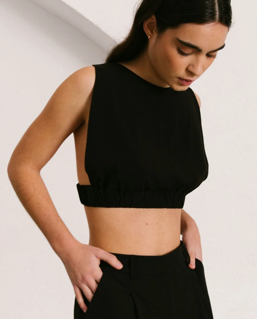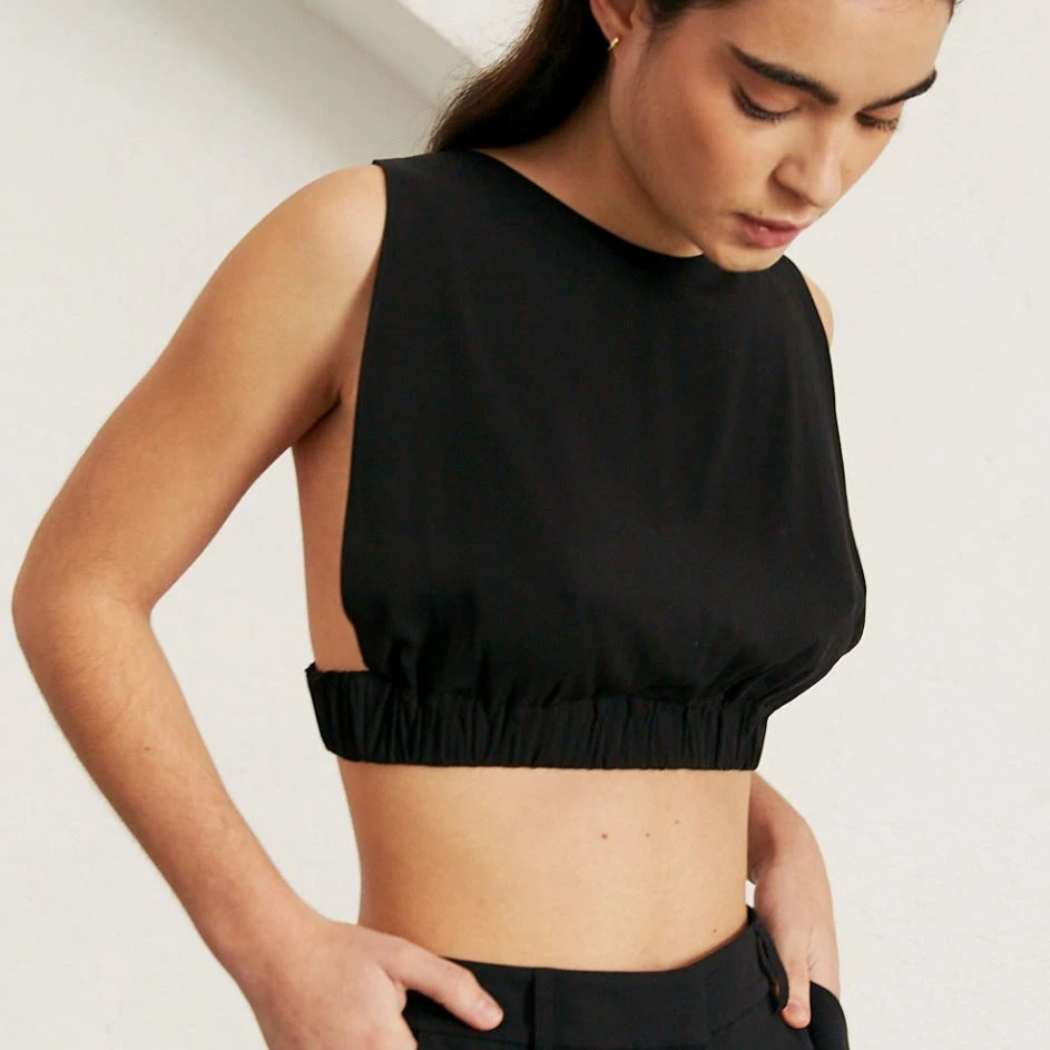 An absolute bombshell. Sleeveless crop top adjusted with an elastic for a perfectly curated look. Wear with low waisted trousers for a daring Kate Moss look, or combine with the Cliffhanger pants for a knockout combo.