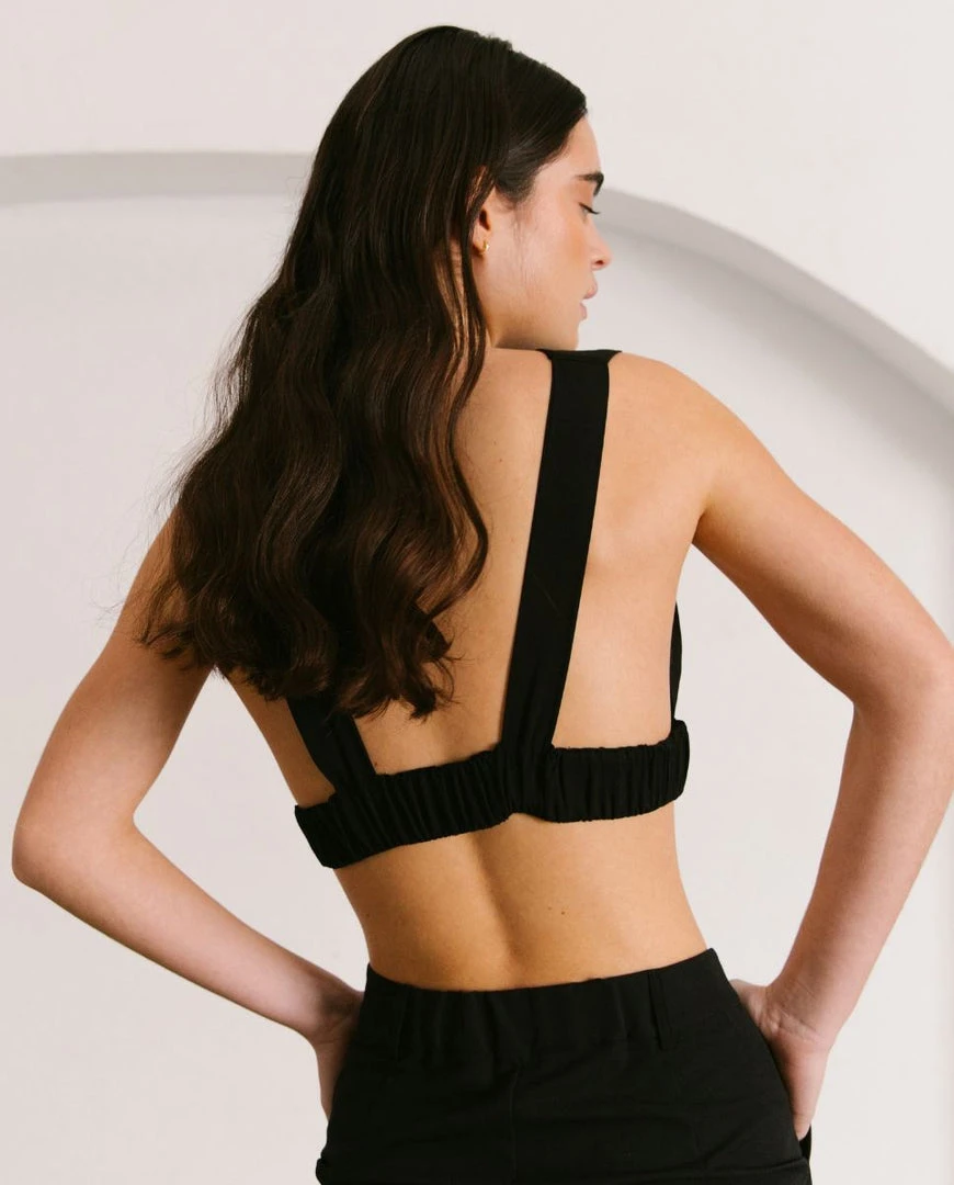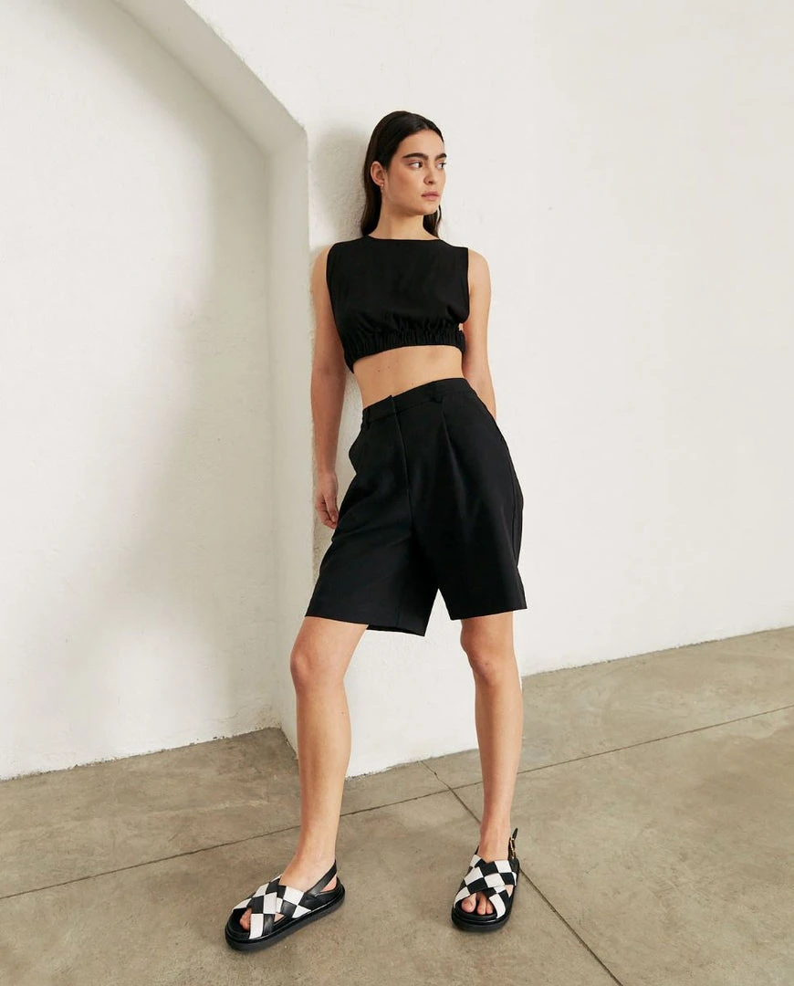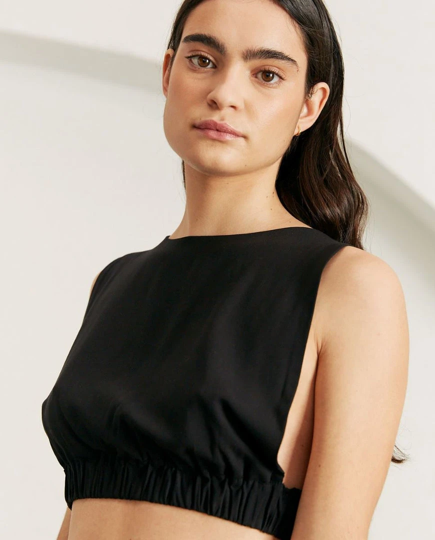 An absolute bombshell. Sleeveless crop top adjusted with an elastic for a perfectly curated look. Wear with low waisted trousers for a daring Kate Moss look, or combine with the Cliffhanger pants for a knockout combo.