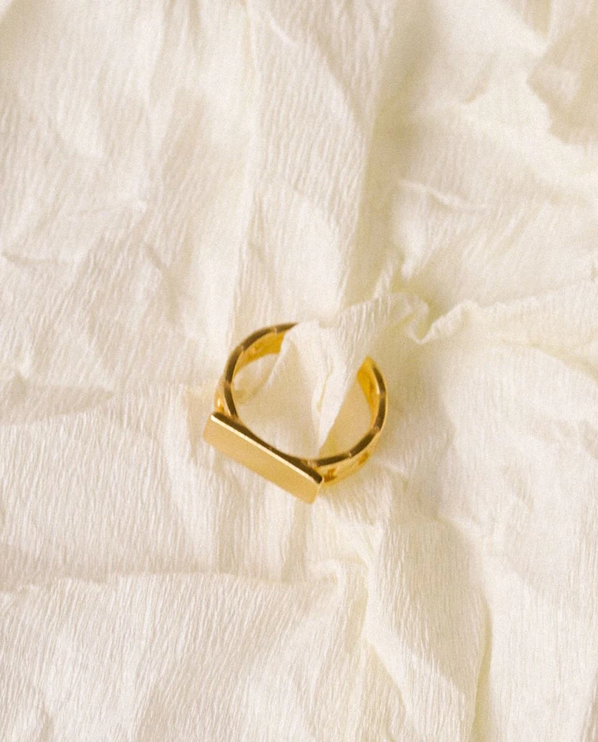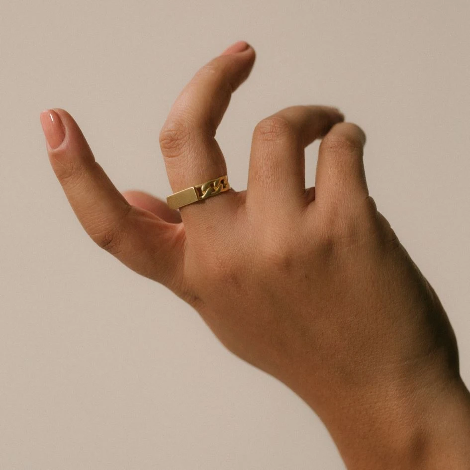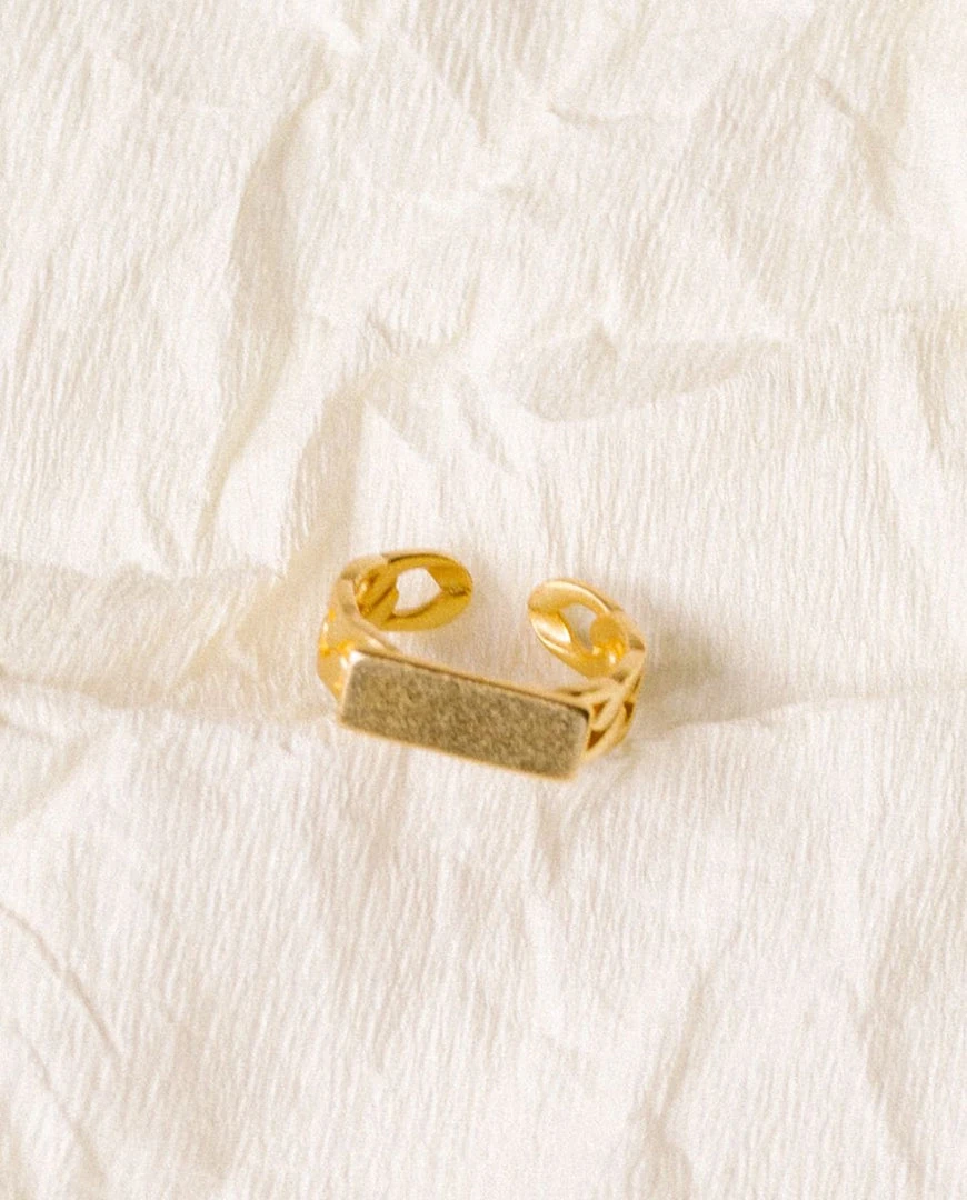 Gold plated chain link ring with a gap and a rectangular top. The perfect cross between elegance and boldness.