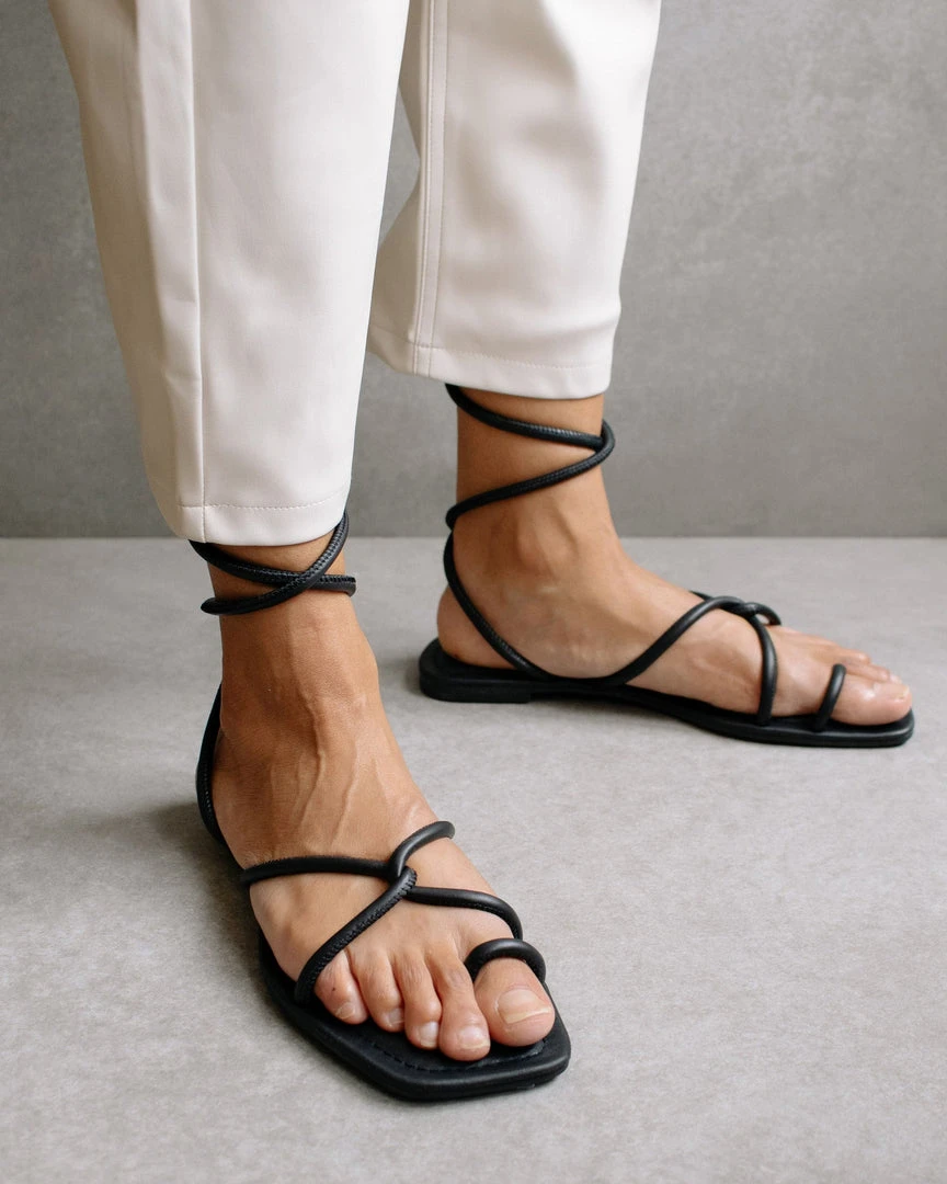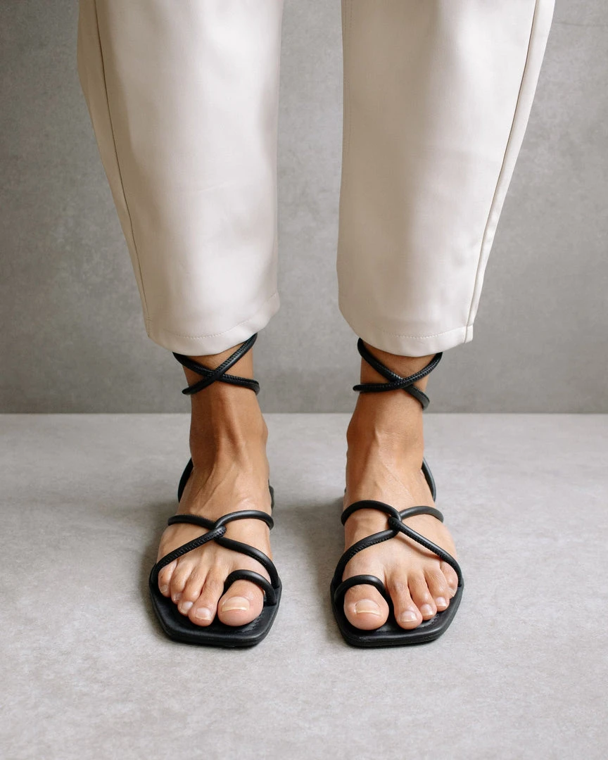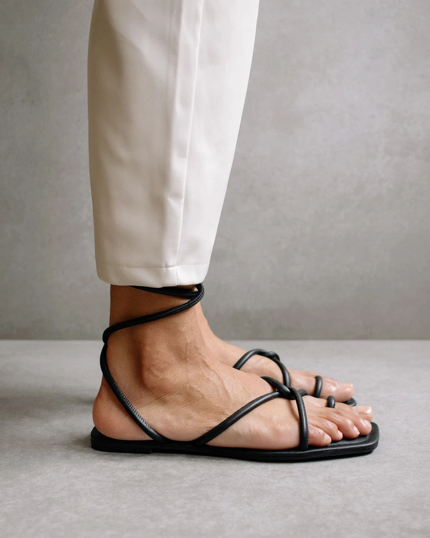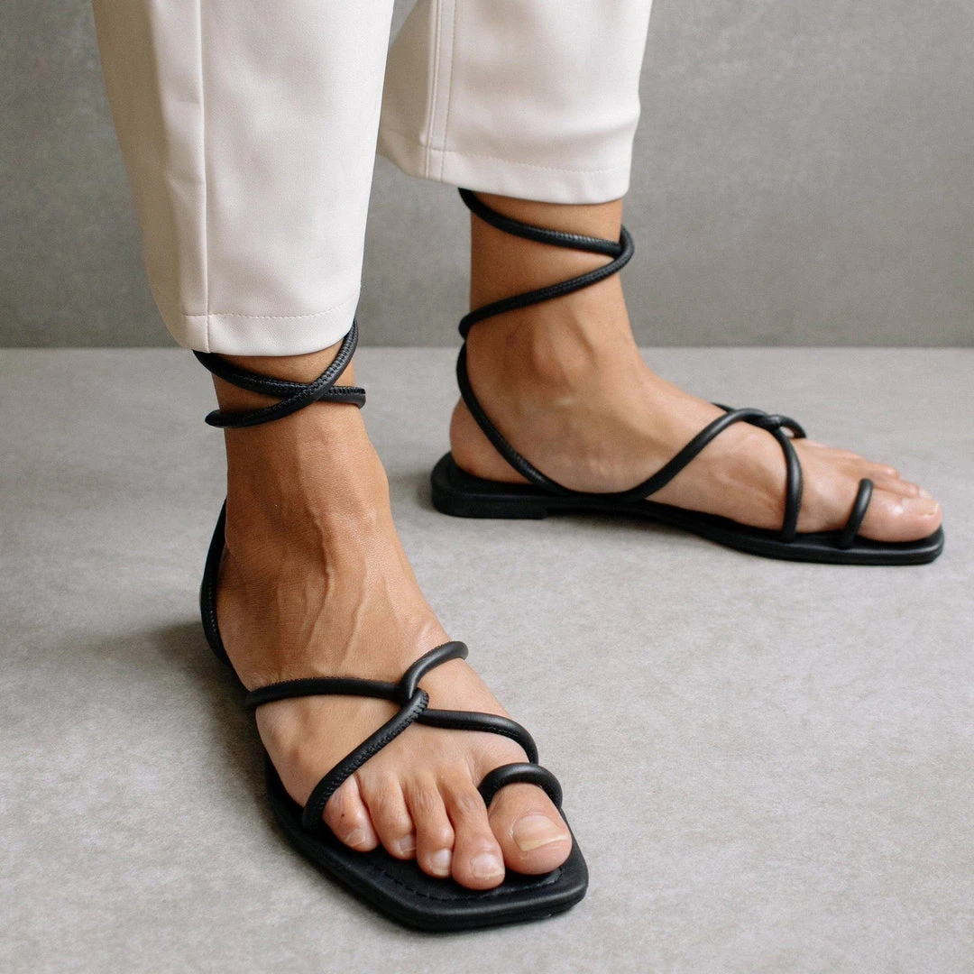 Get on board the “barely there” shoe aesthetic with this flat, strappy sandal. Features a toe ring and criss crosses up the ankle.