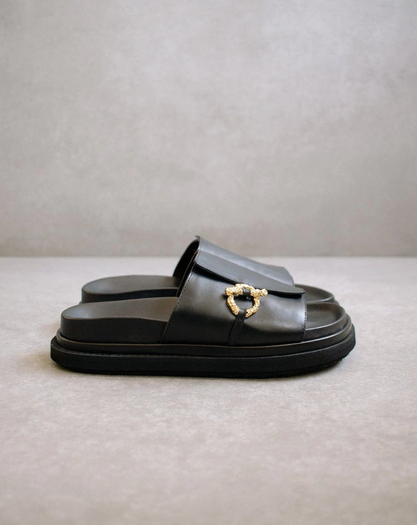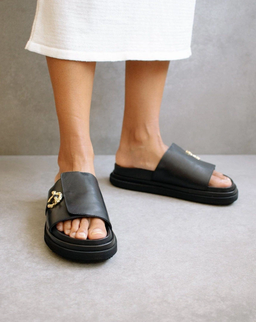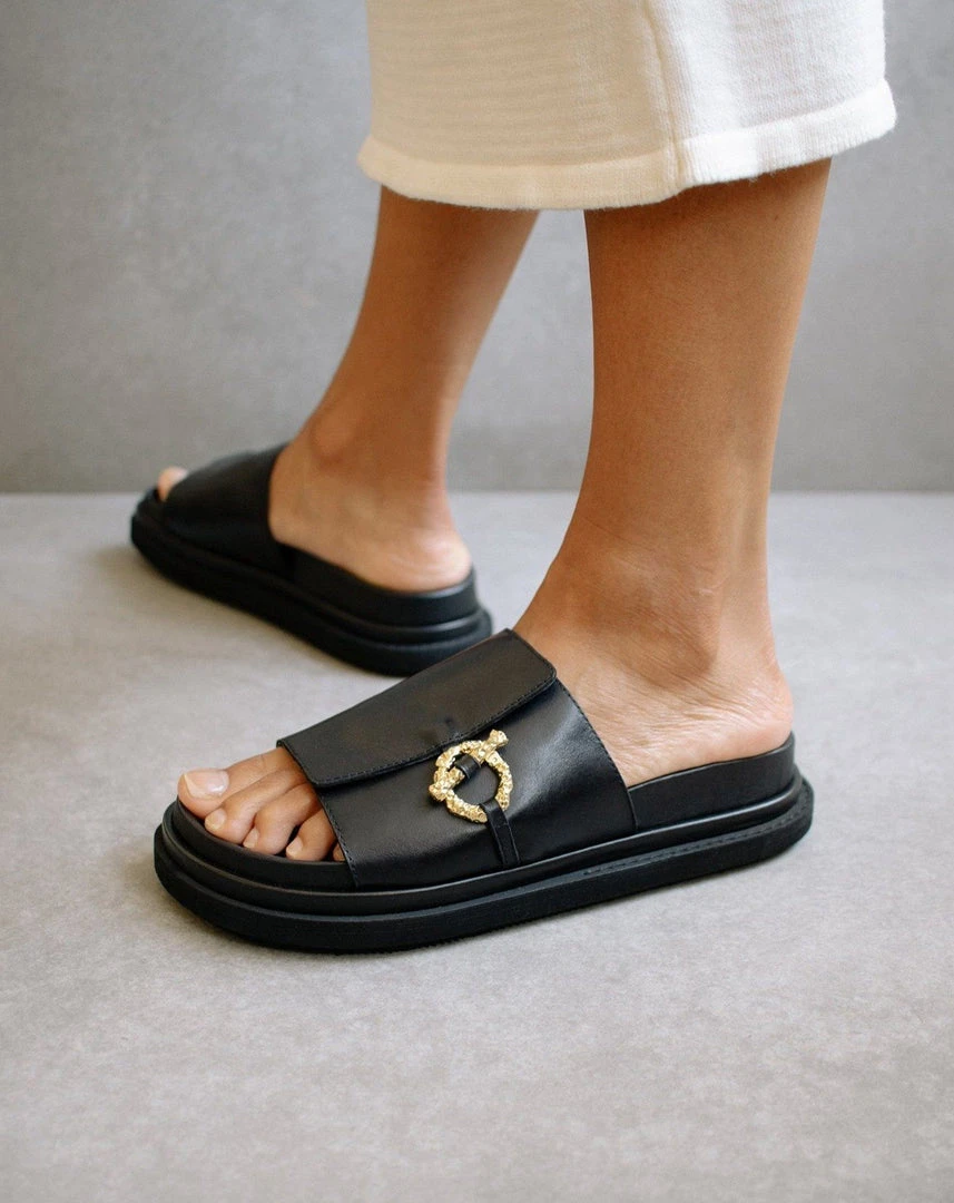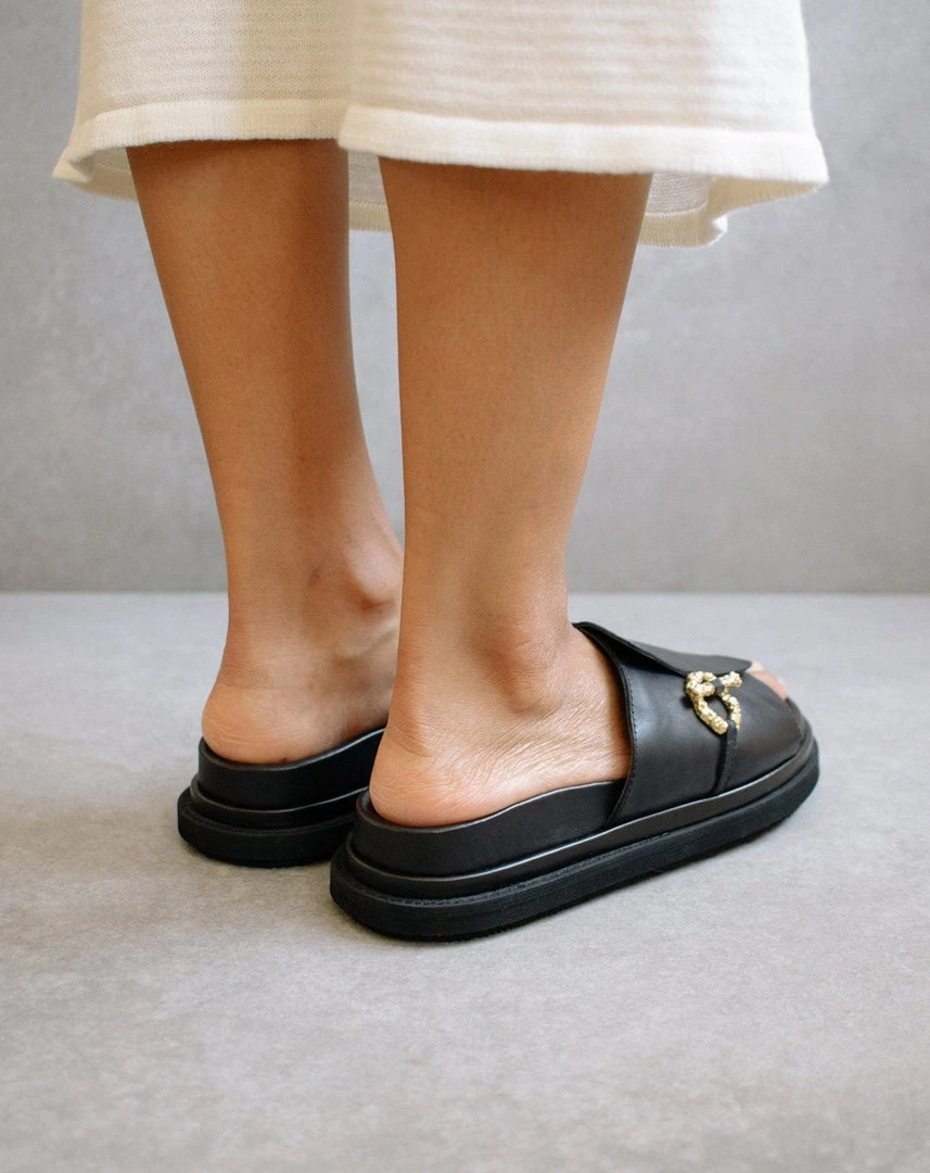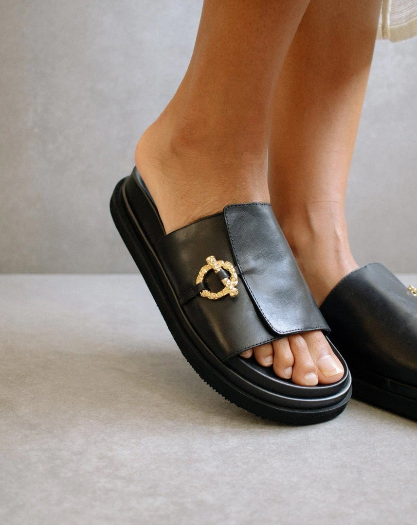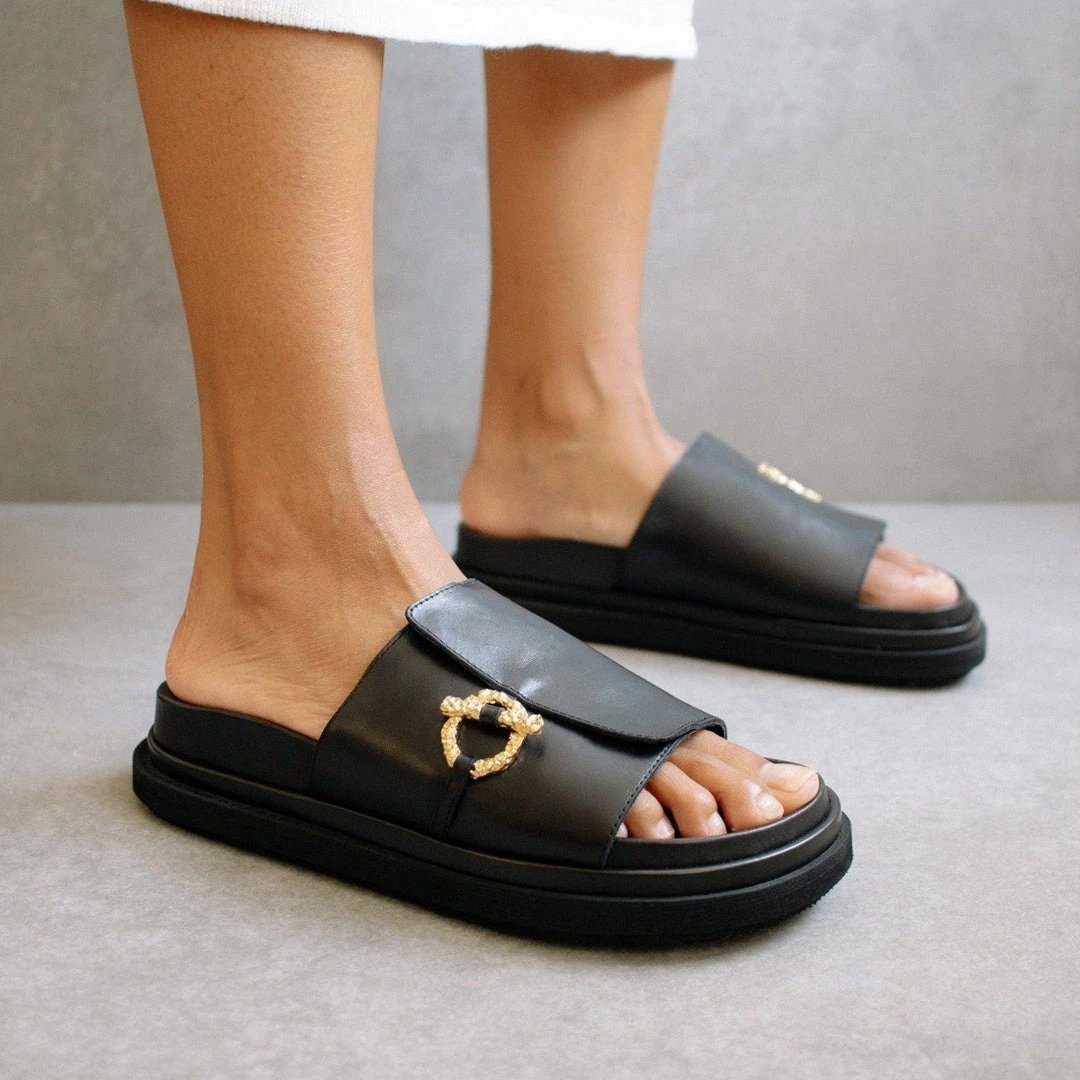 Anatomical sole silhouette featuring an open toe and open back. Metal detail for a fancy touch to a comfort over anything choice.