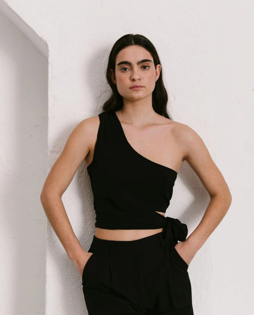 Simply irresistible. An open shoulder crop top with an adjustable side wrap to knot and tie any way you like. The ultimate Y2K look.