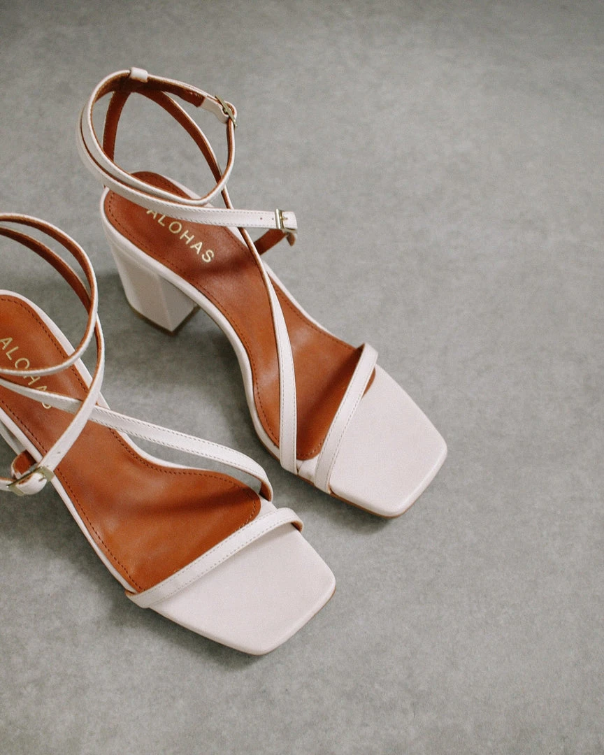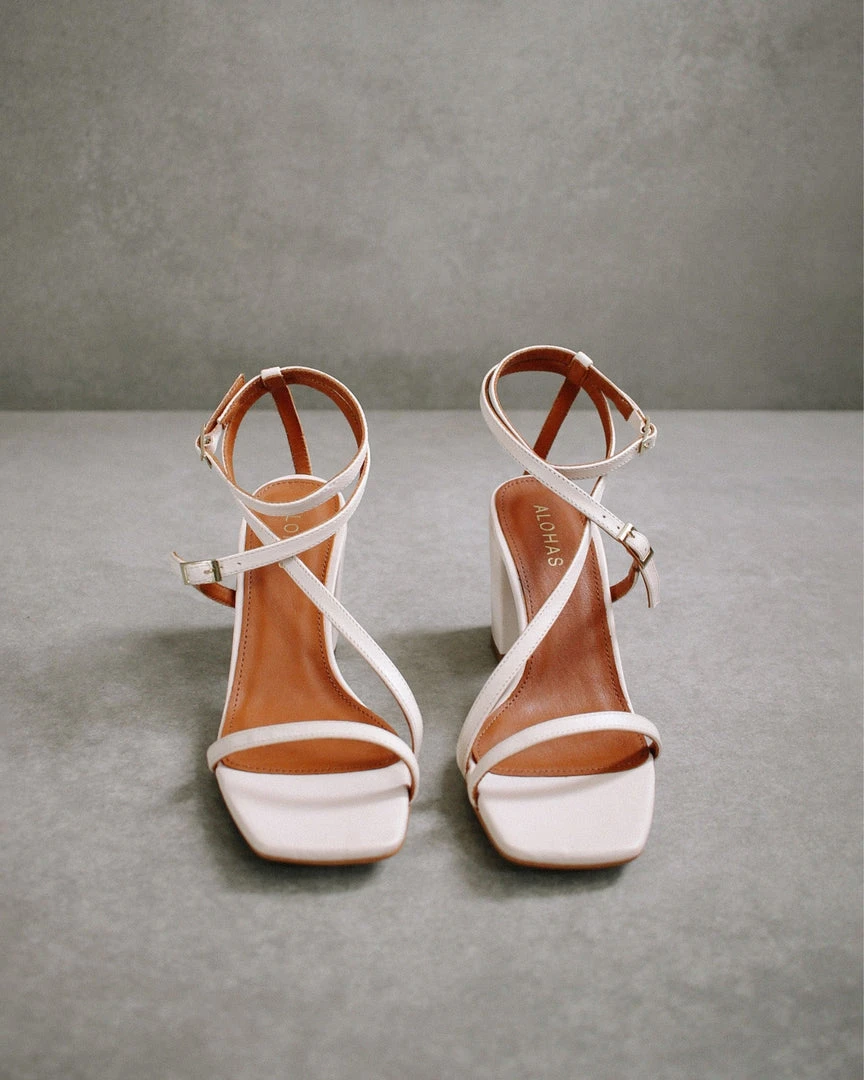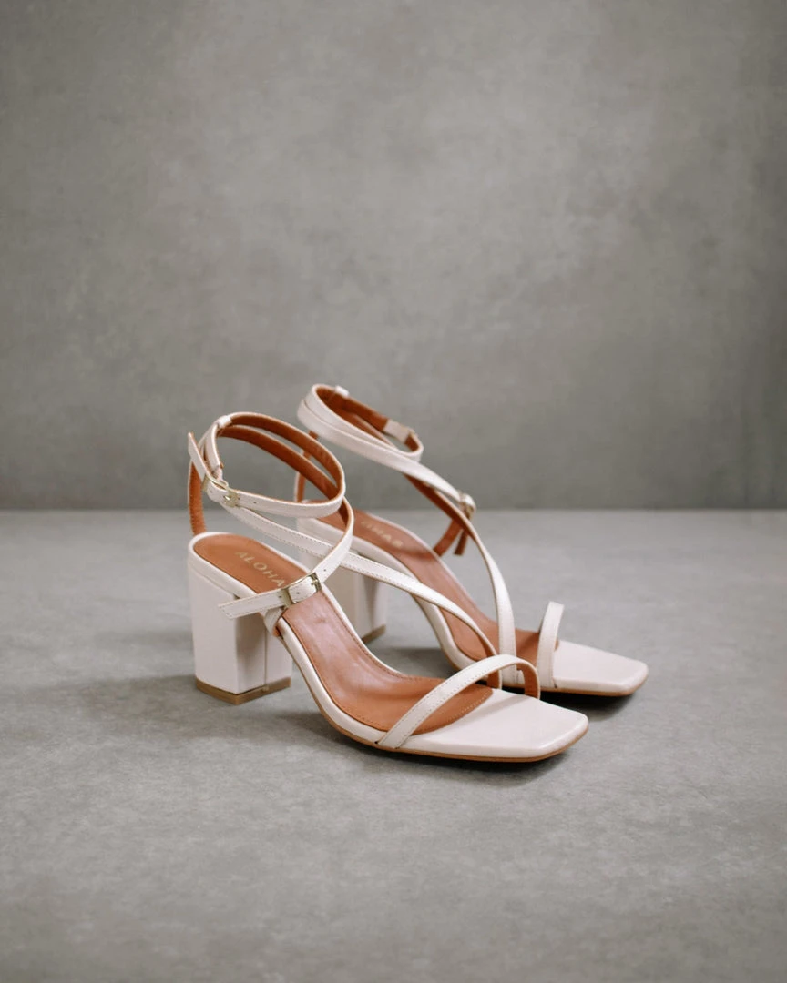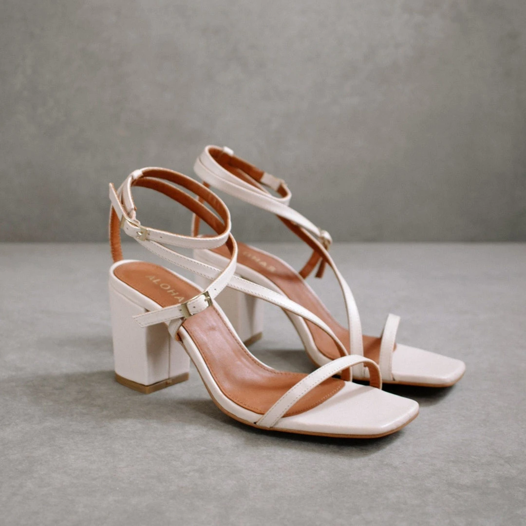 Leather sandal featuring thin straps contrasted by a chunky block heel. Double mini buckles criss crossed along the upper and lower ankle.