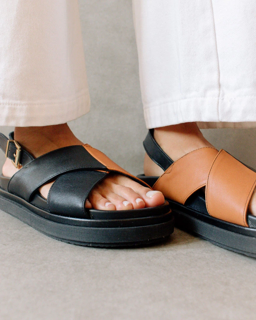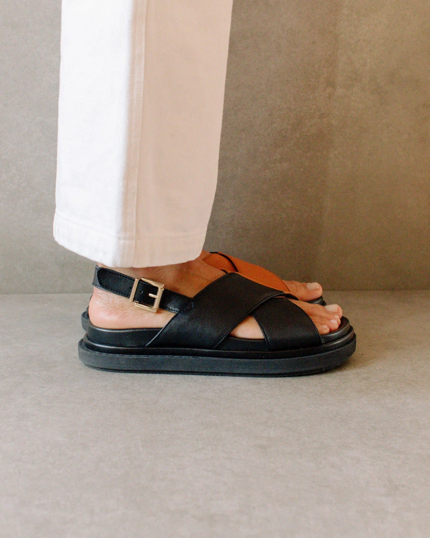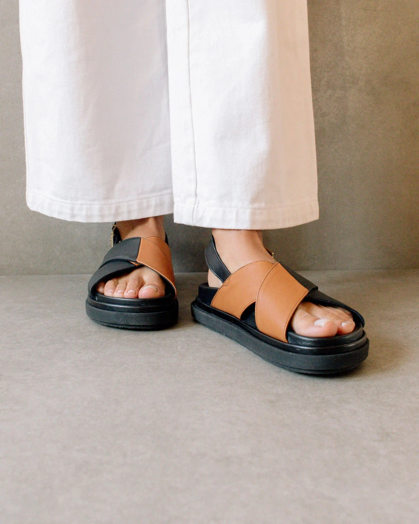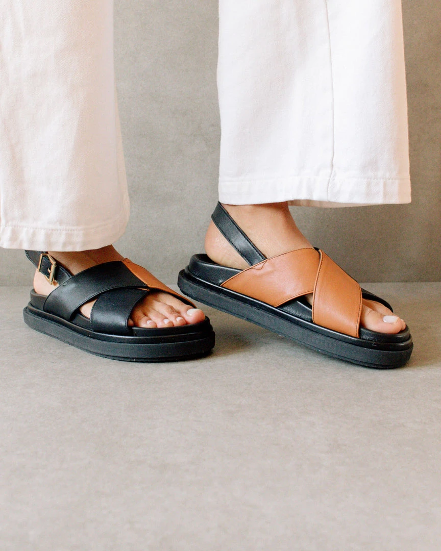 A 90s inspired oversized slipper sandal featuring a maxi double layered sole. Criss-crossed front hold and a buckled back strap for added comfort.