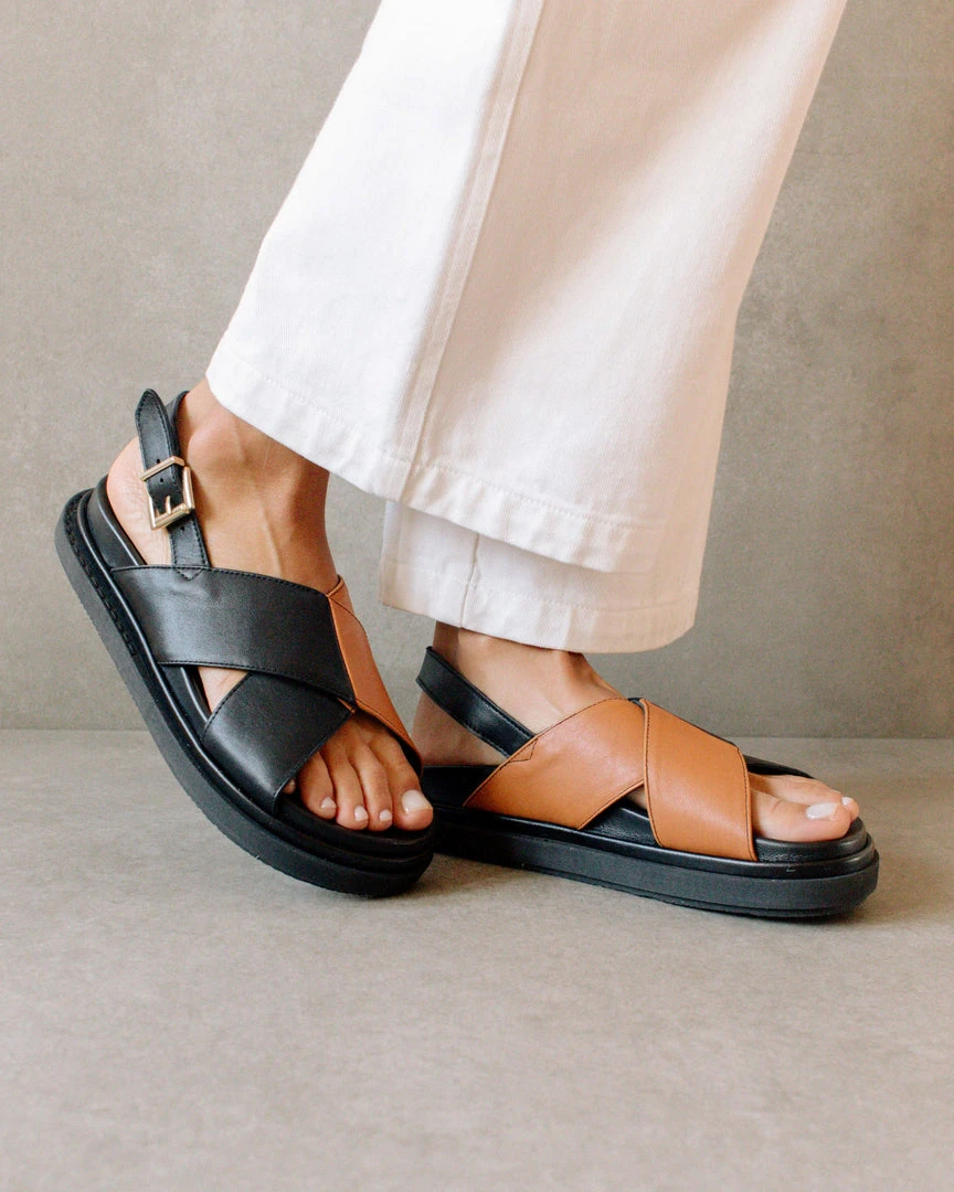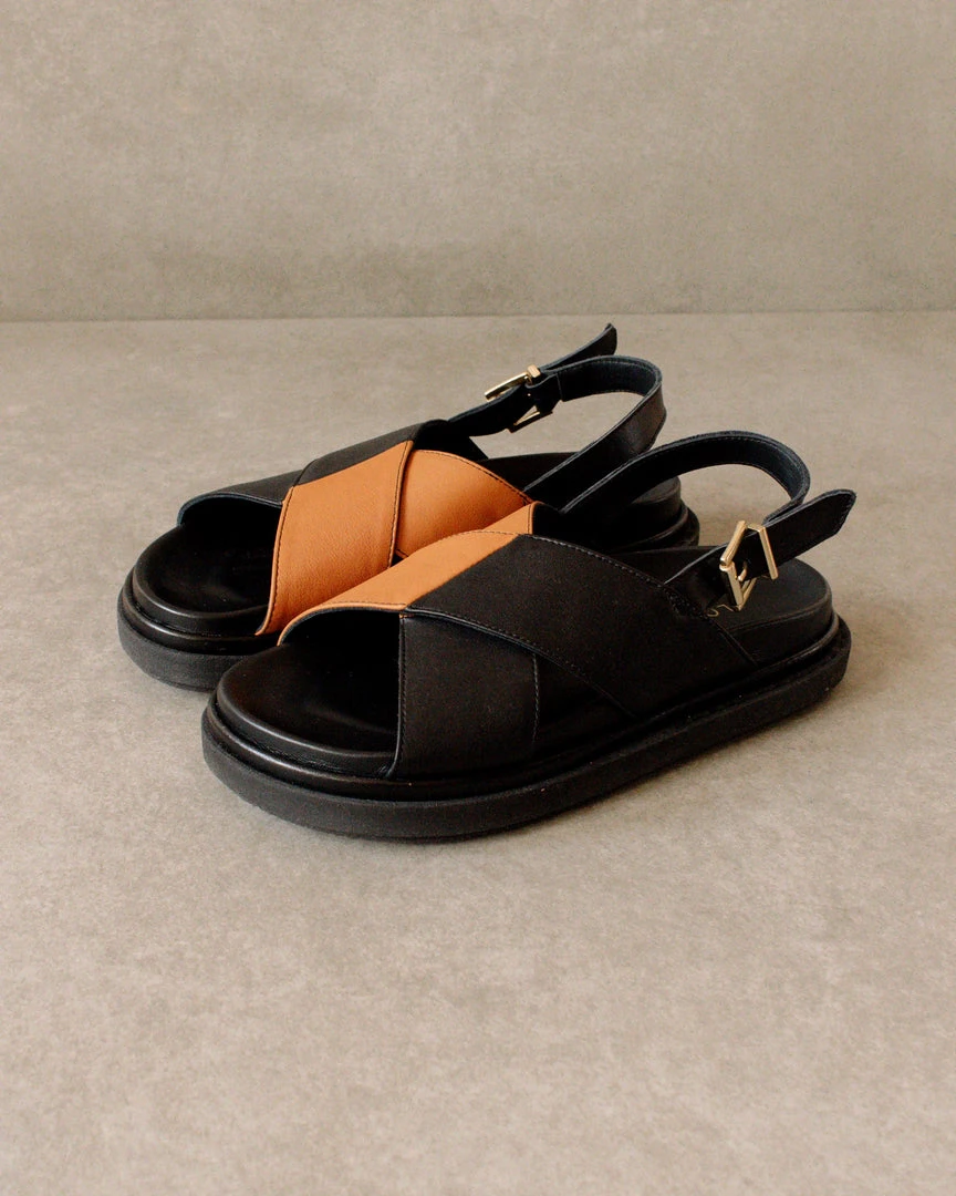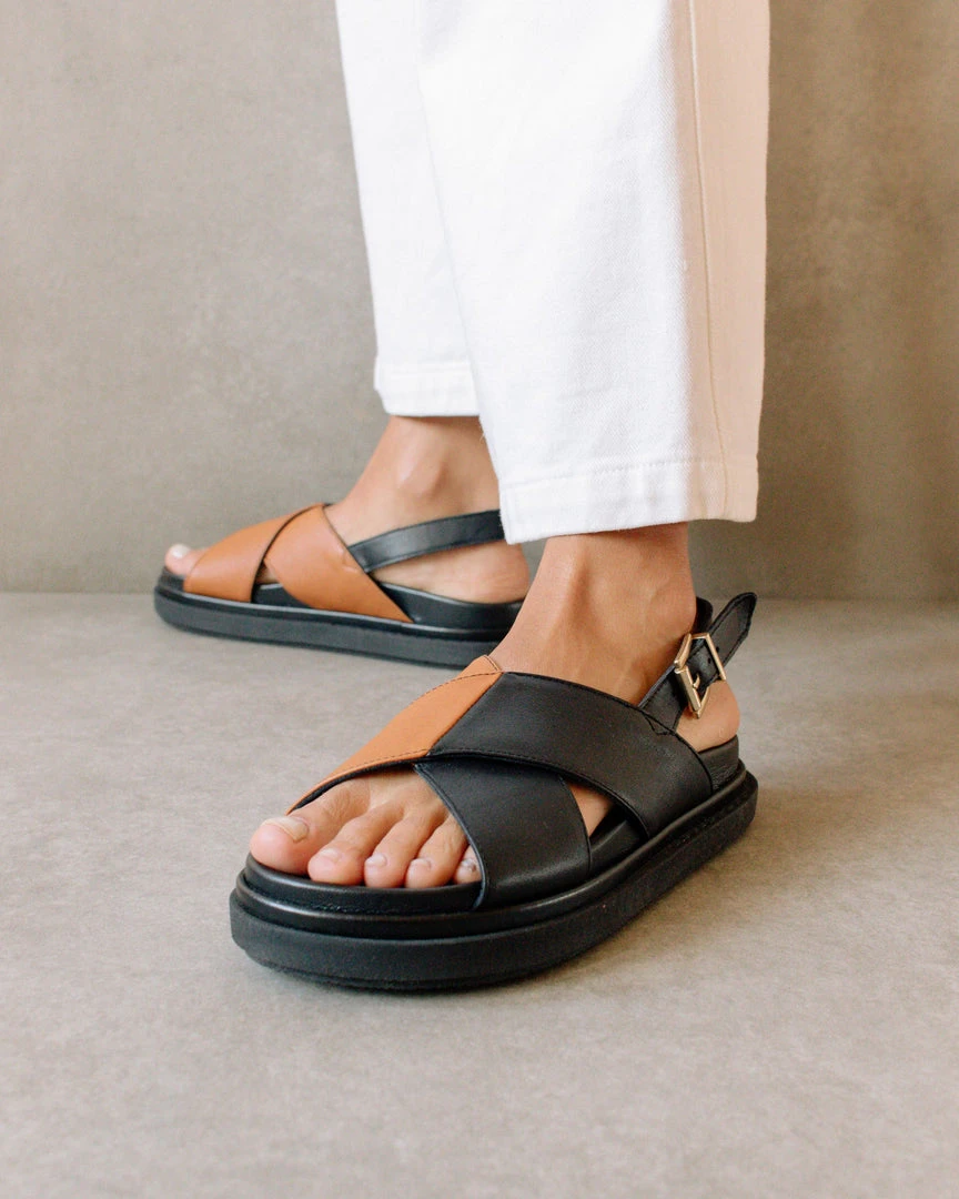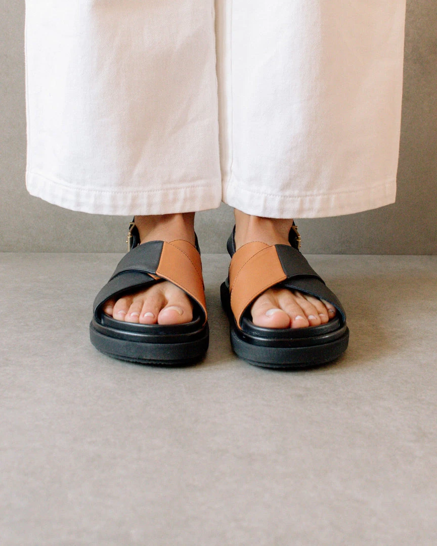 A 90s inspired oversized slipper sandal featuring a maxi double layered sole. Criss-crossed front hold and a buckled back strap for added comfort.
