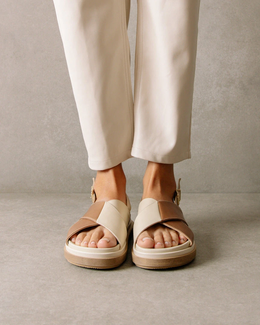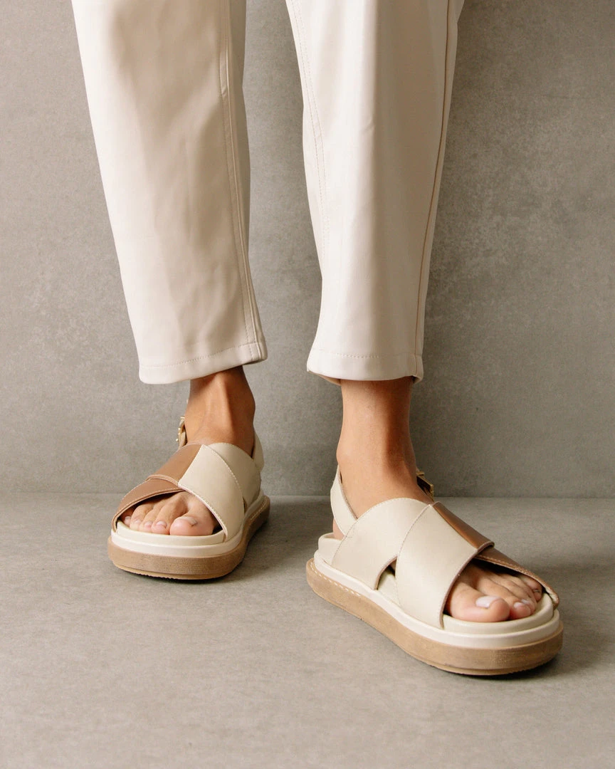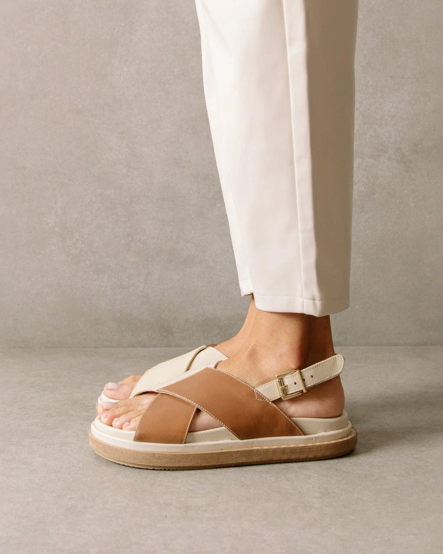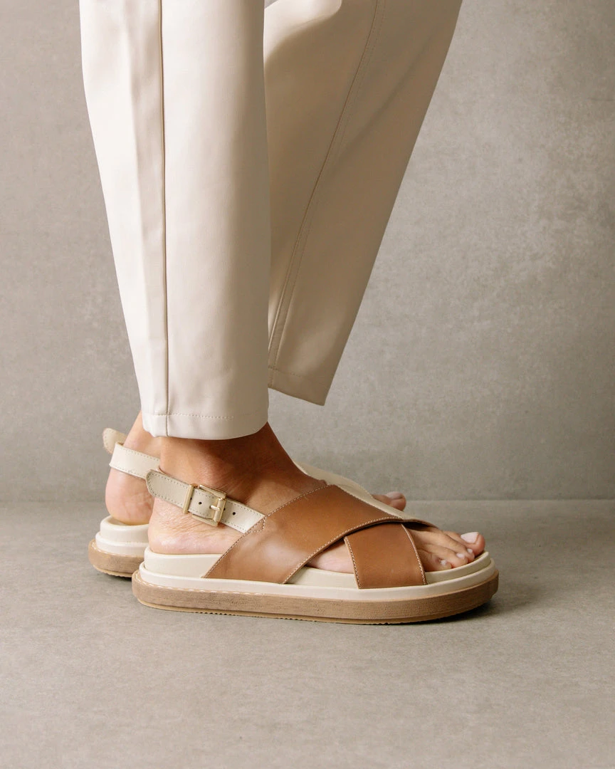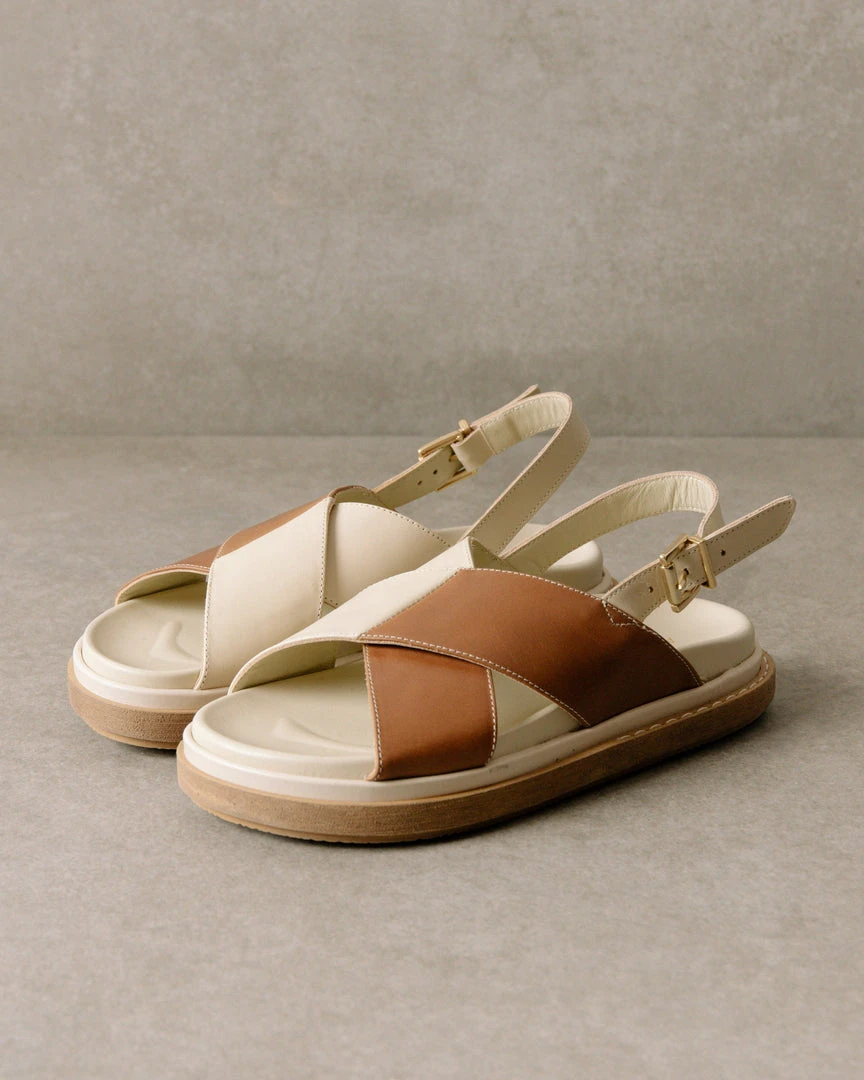 A 90s inspired oversized slipper sandal featuring a maxi double layered sole. Criss-crossed front hold and a buckled back strap for added comfort.