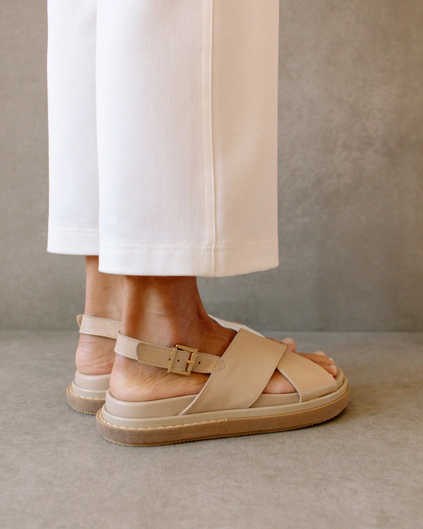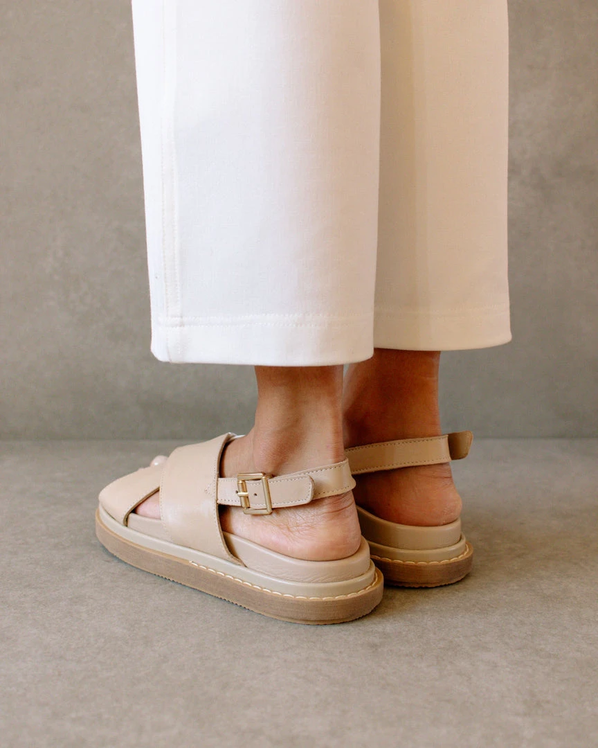 A 90s inspired oversized slipper sandal featuring a maxi double layered sole. Criss-crossed front hold and a buckled back strap for added comfort.