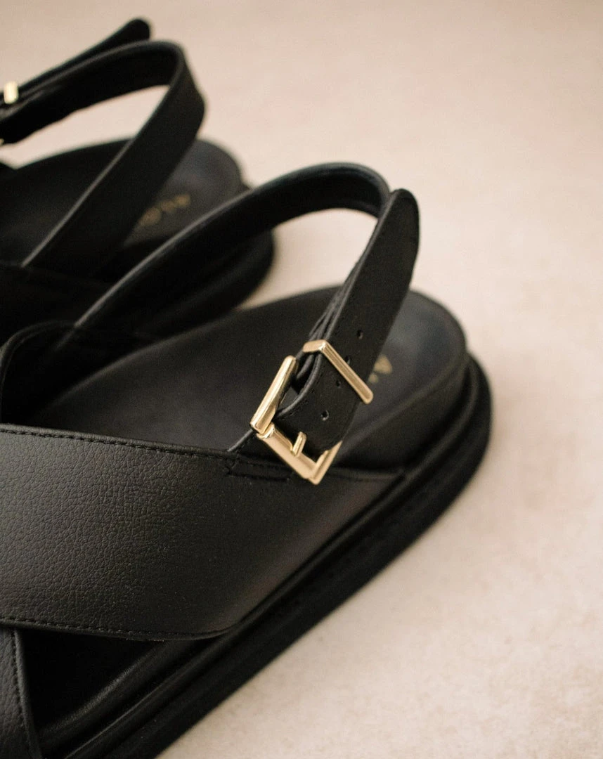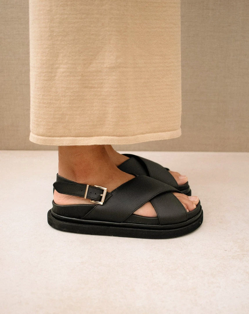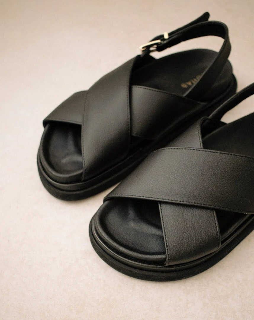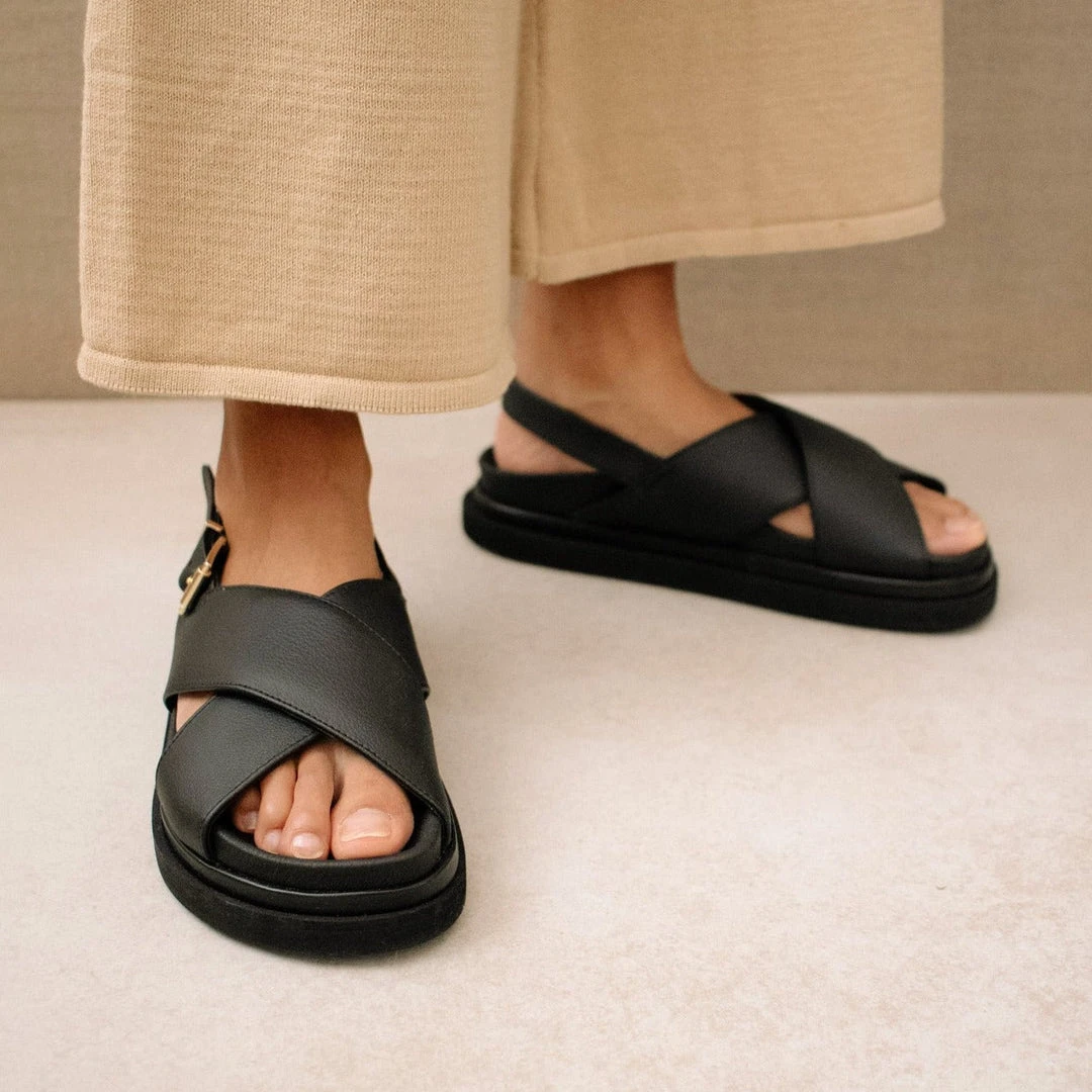 A 90s inspired oversized slipper sandal featuring a maxi double layered sole. Criss-crossed front hold and a buckled back strap for added comfort.
