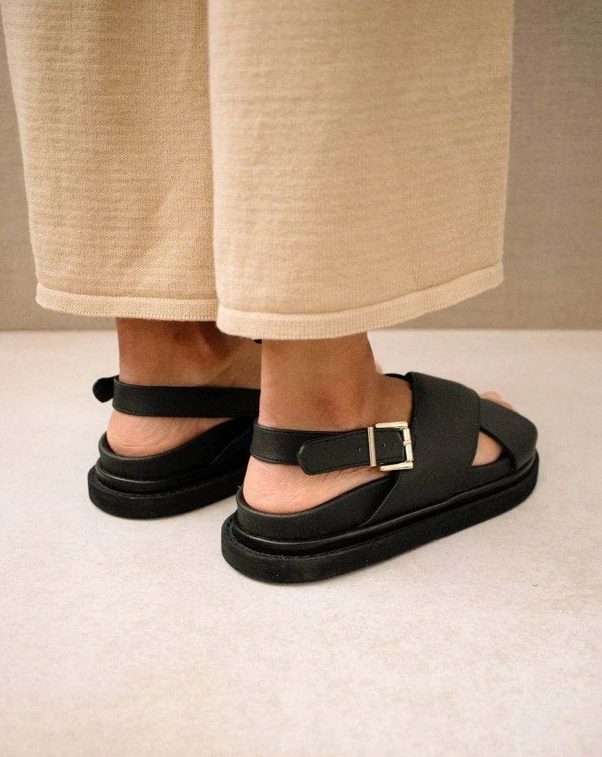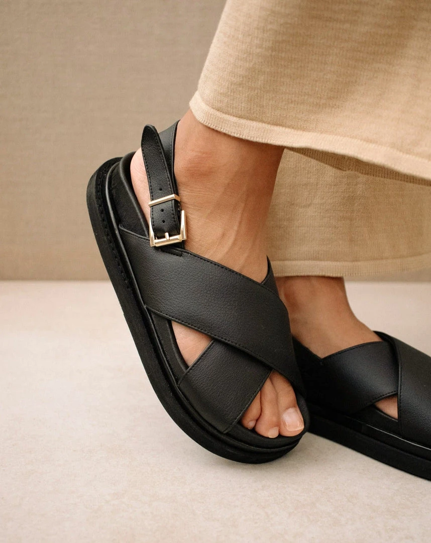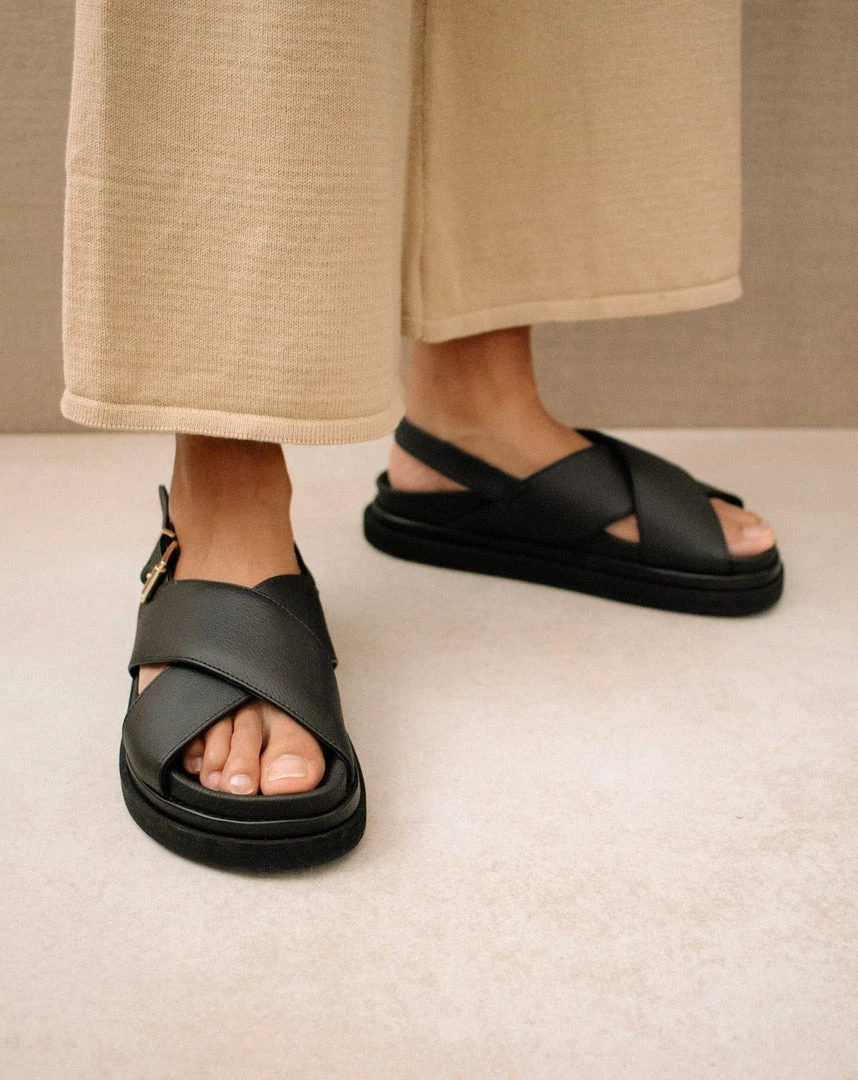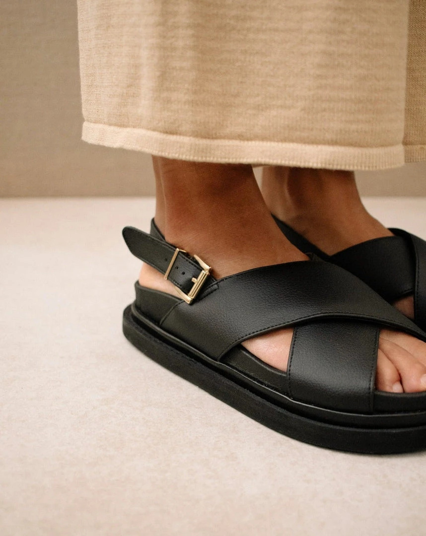 A 90s inspired oversized slipper sandal featuring a maxi double layered sole. Criss-crossed front hold and a buckled back strap for added comfort.