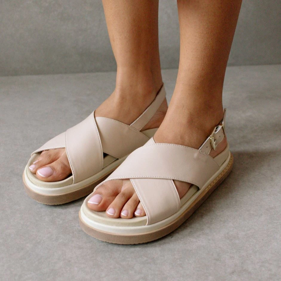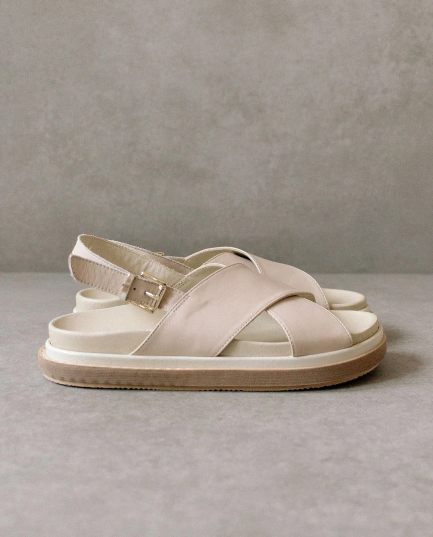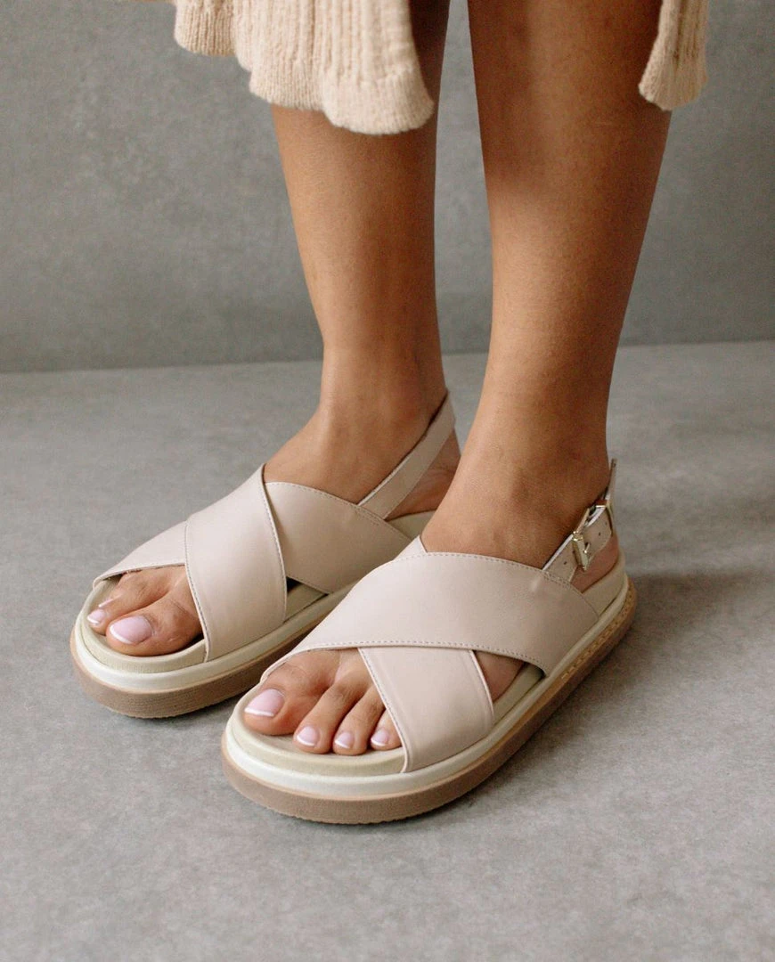 90s inspired leather platform sandals with a buckle backstrap and a maxi double layered sole. Featuring two criss-crossed straps and an open toe for breathability. Crisp, shiny finish. Needless to say, they are the must-have summer piece.