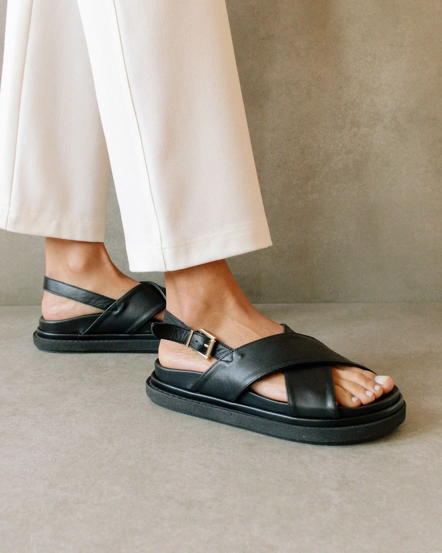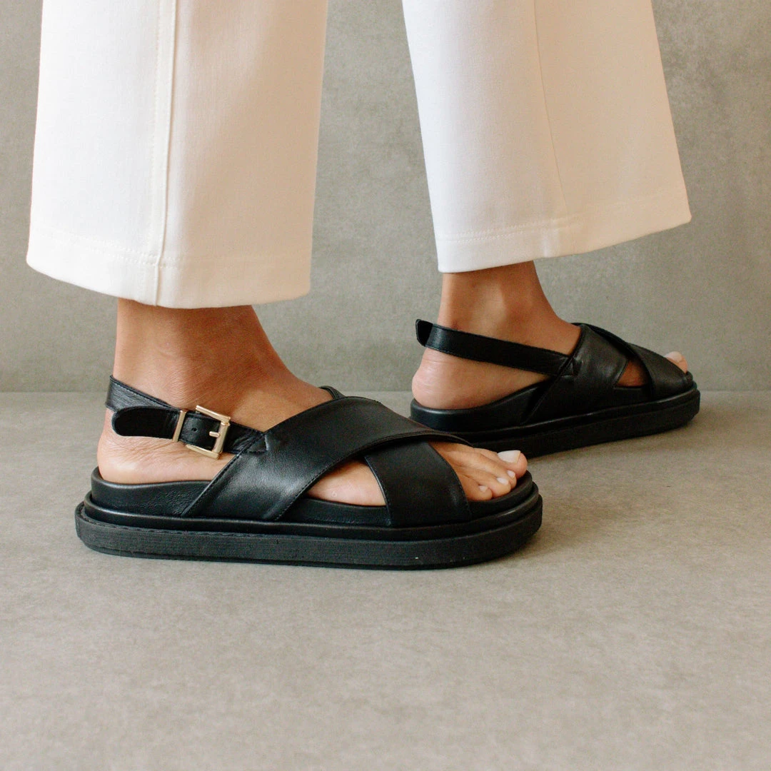A 90s inspired oversized slipper sandal featuring a maxi double layered sole. Criss-crossed front hold and a buckled back strap for added comfort.