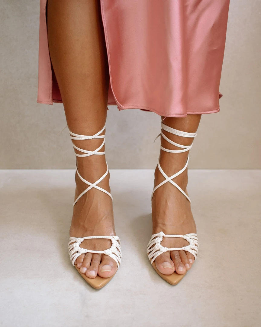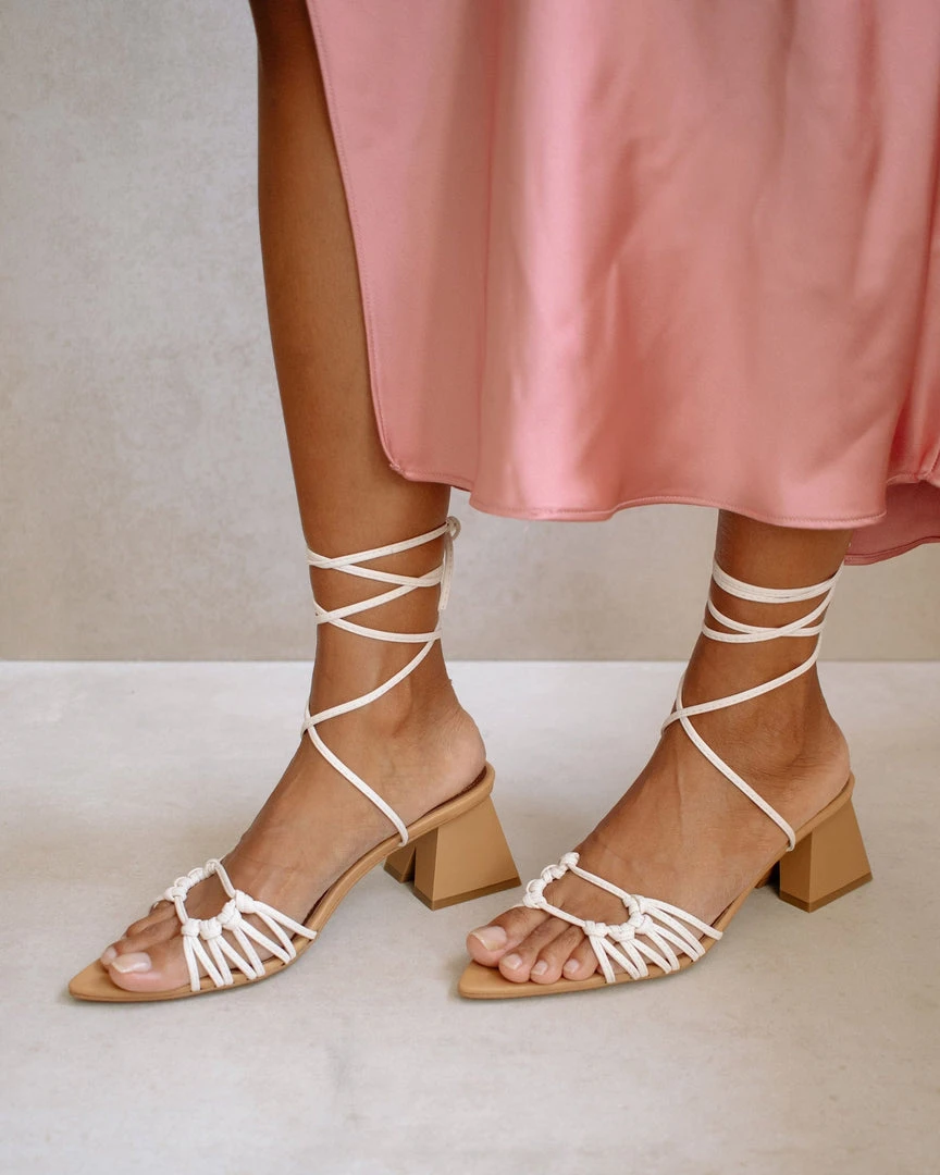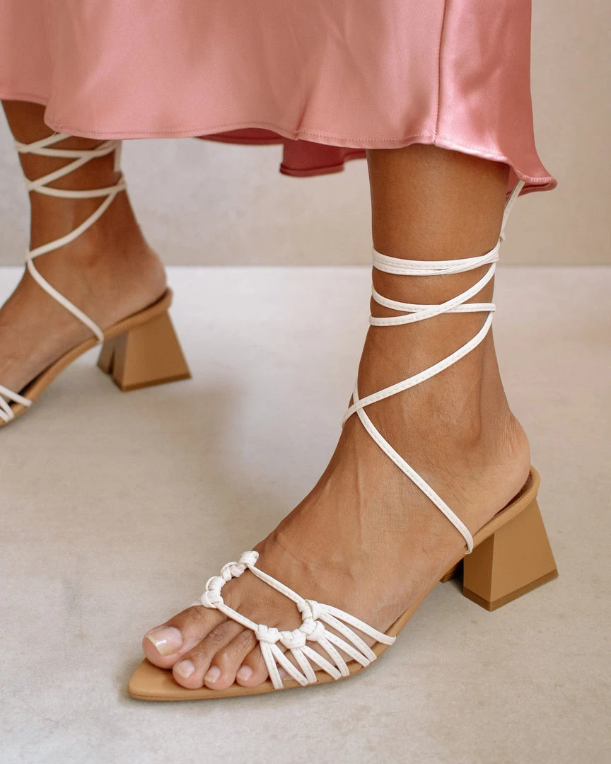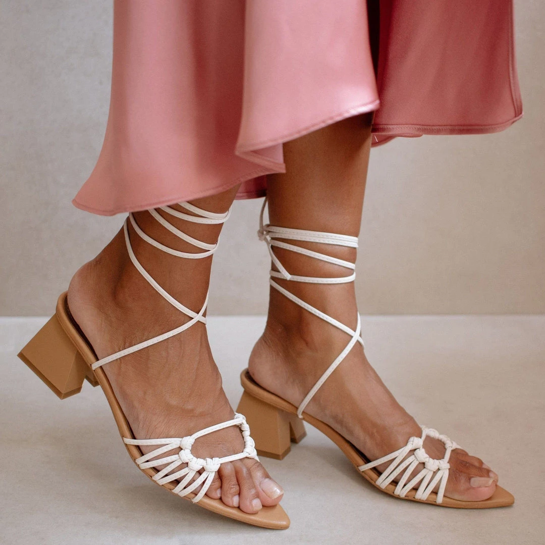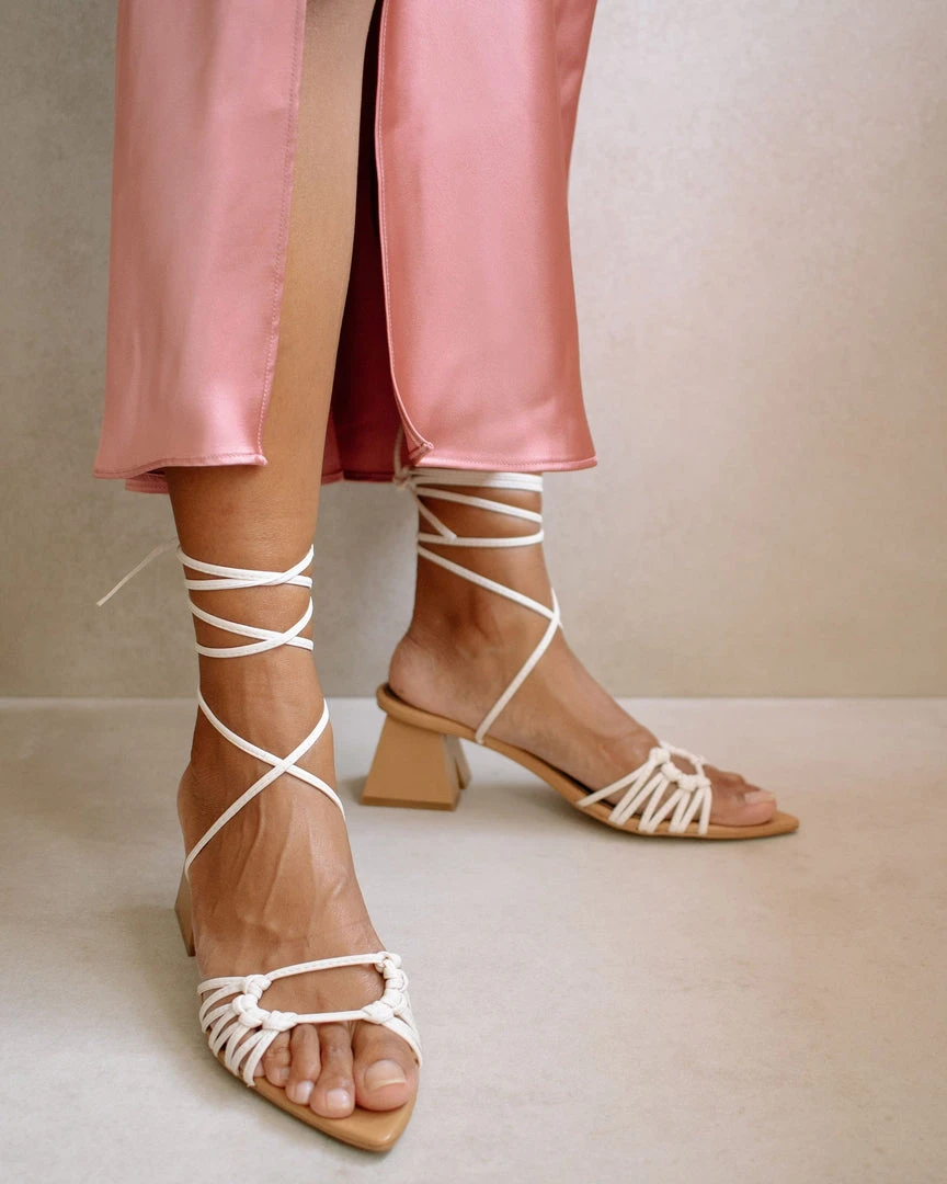 Pointed sole with an open toe featuring an A-shaped pyramid block heel. Decorative straps knotted at the front and criss cross straps up the ankle.