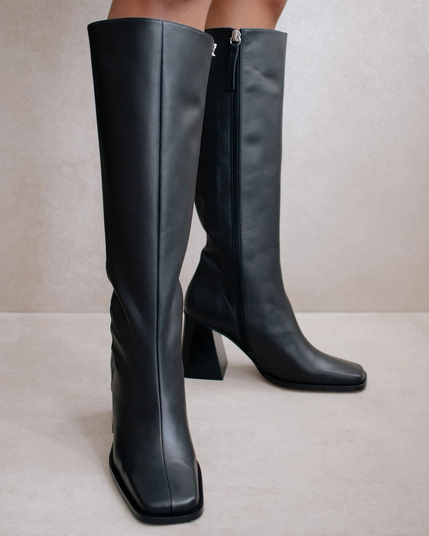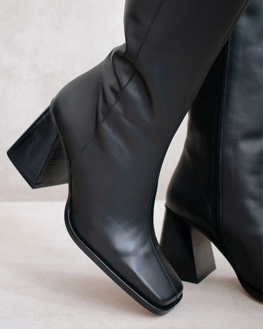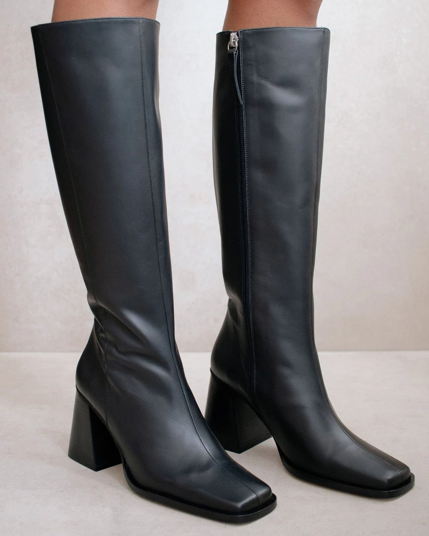 Under the knee boots with a structured, wide cut and chunky block heel. Full length inner side zipper for ease of use.