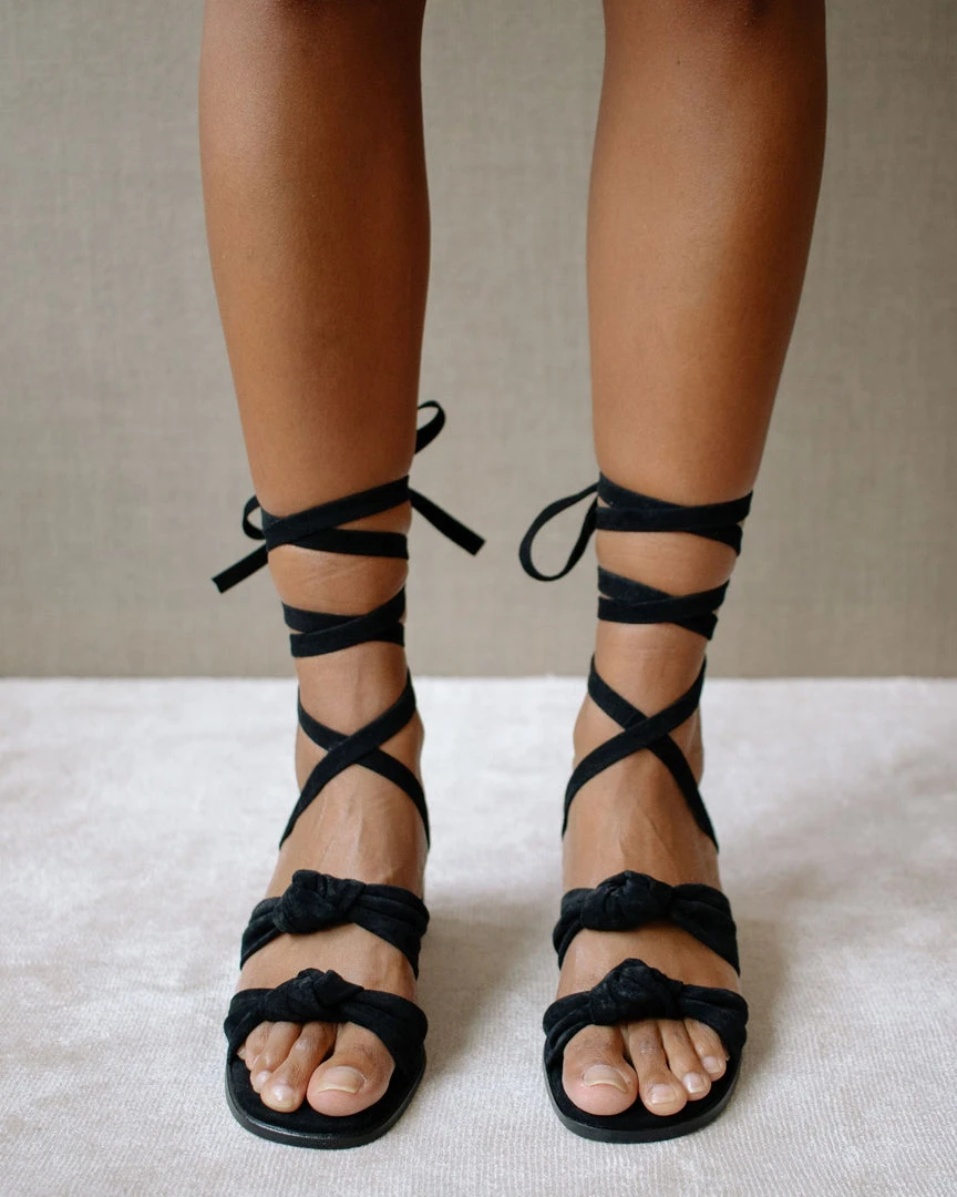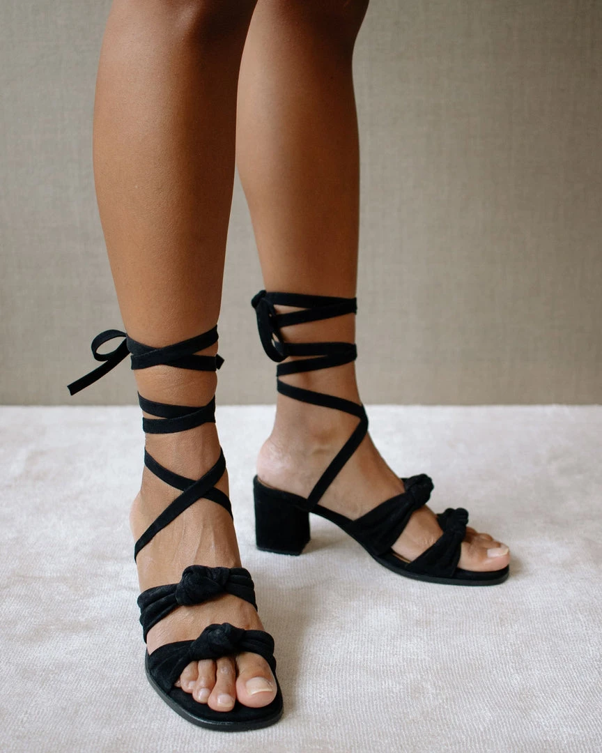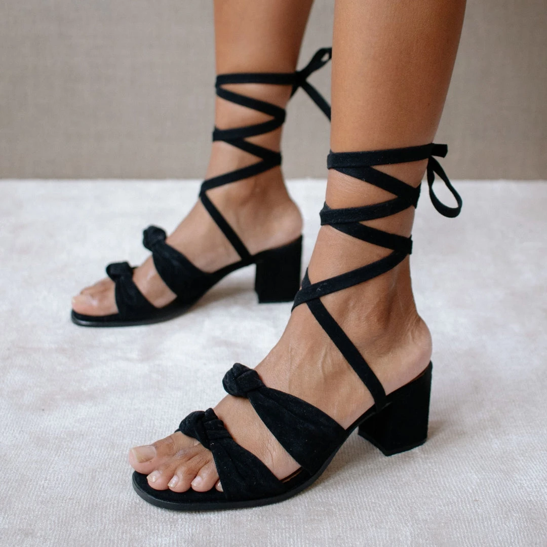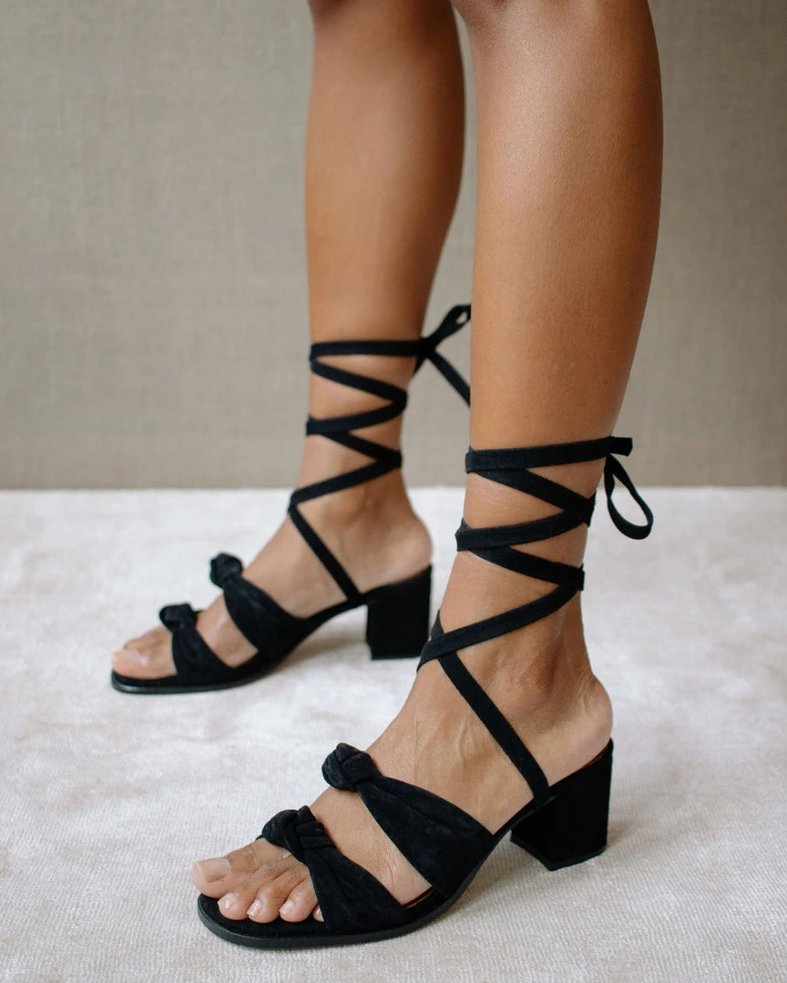 Two knot straps contrast the criss-cross straps up to the calf in this summer-evoking sandal. Featuring a block heel that adds comfort to a dressed-up look.