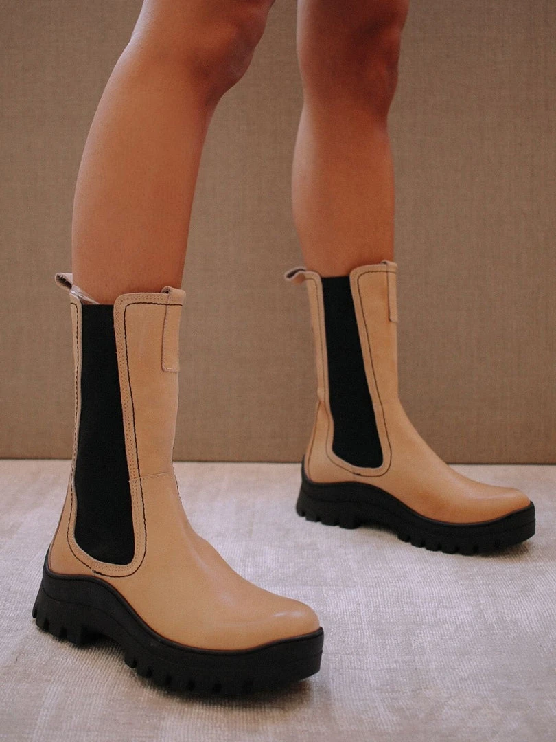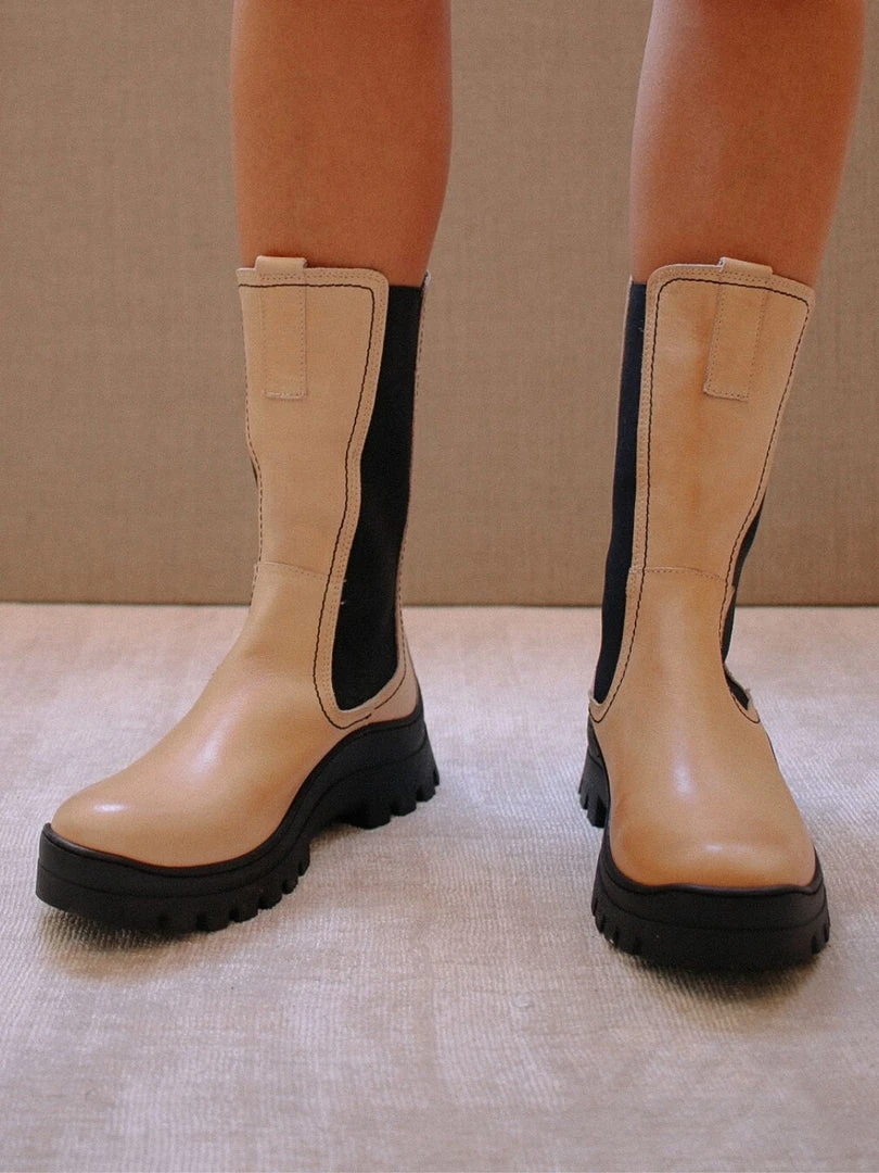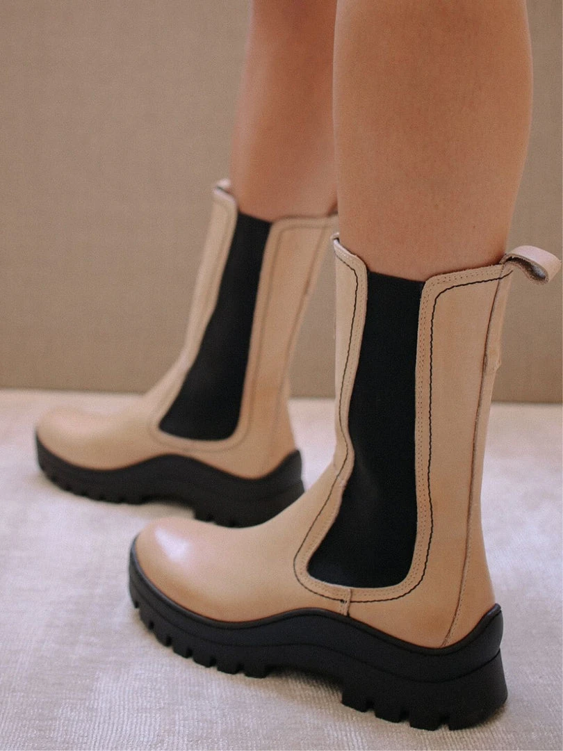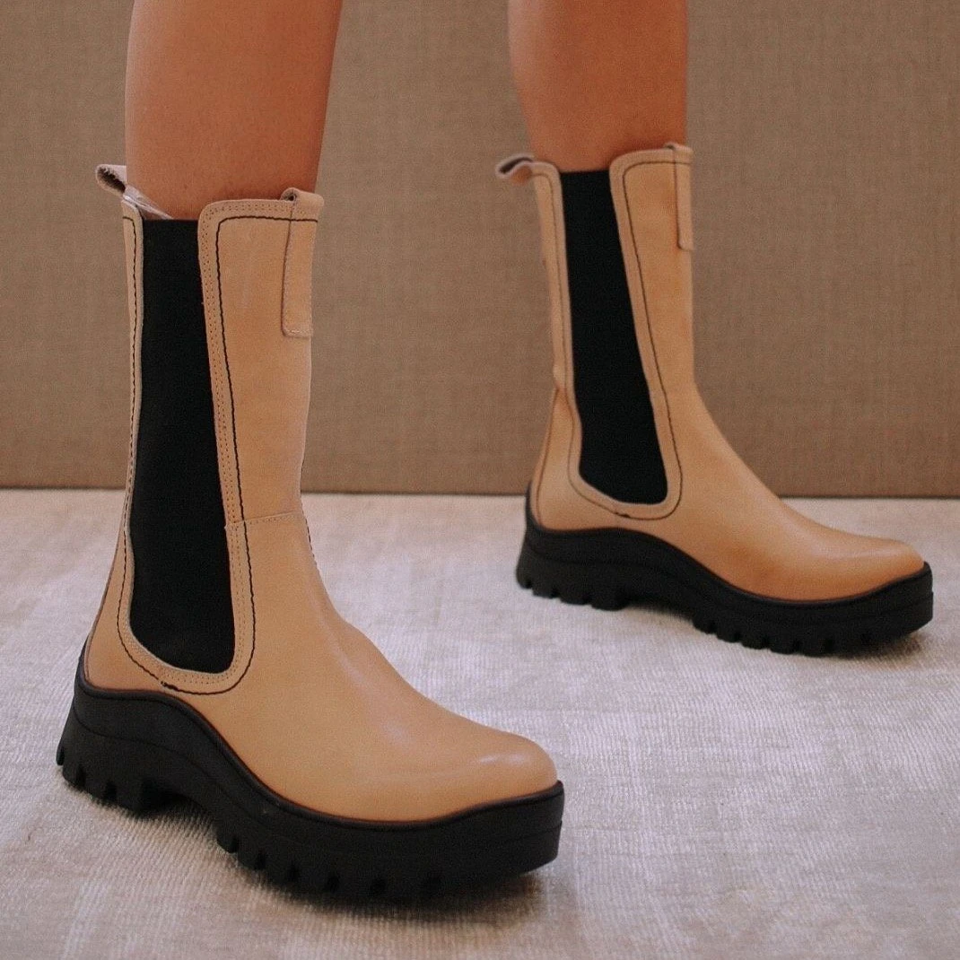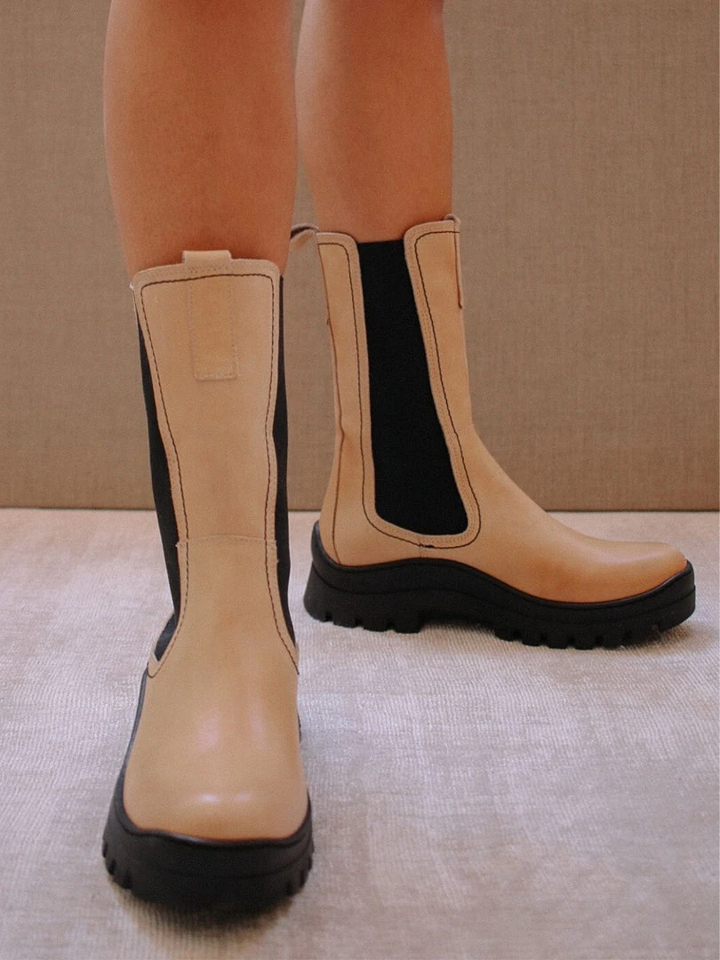 ALOHAS FW 20/21, Diner Love. Rain boot inspired low platform boots that run shin-height. With visible side stitching to add that 90s inspired vibe. Easy to slip on and designed to provide a firm grip for any sort of road trip detour.