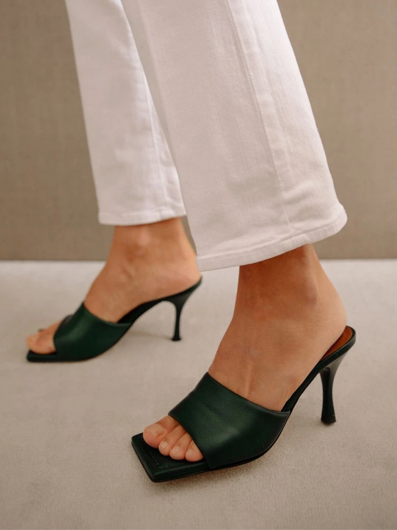 An elevated mule with puffy black fabric that reveals an open toe. Minimalist styling without forgoing the charm. Featuring a squared sole and mid-heel. For when your mind decides to dive deep into the forest.