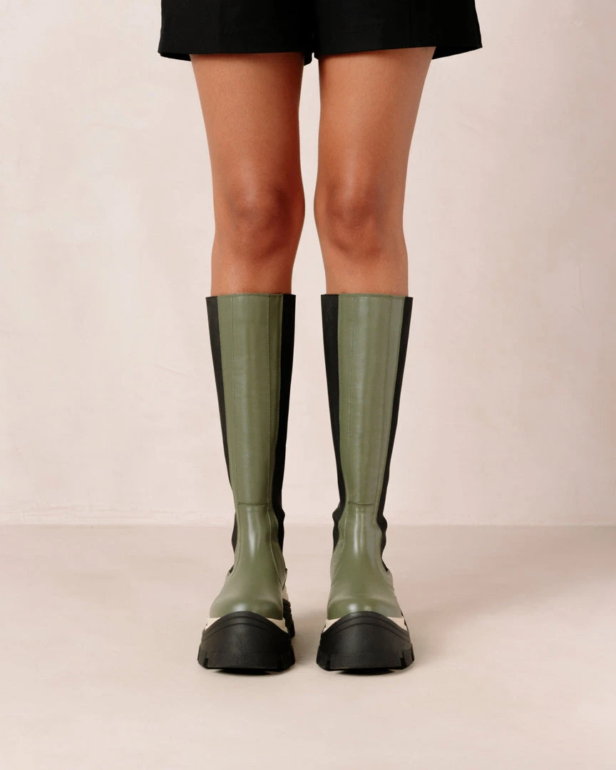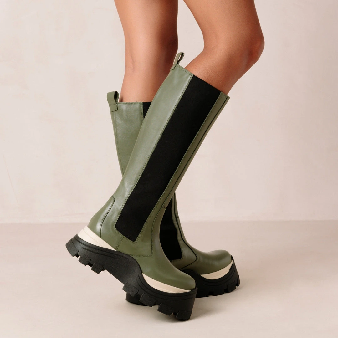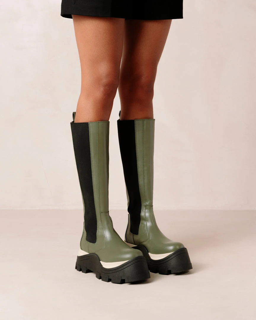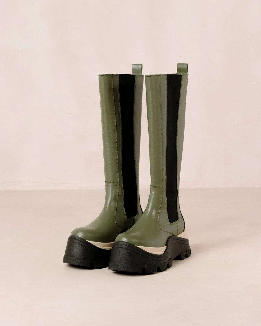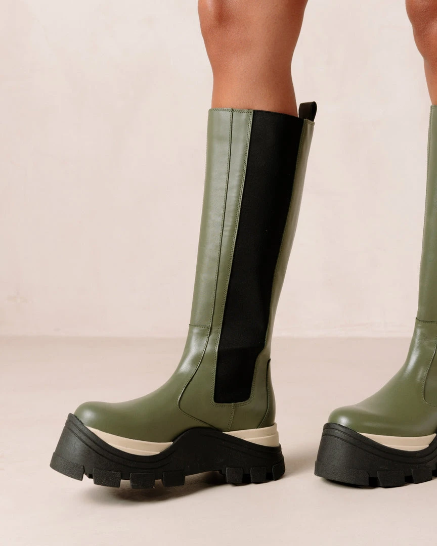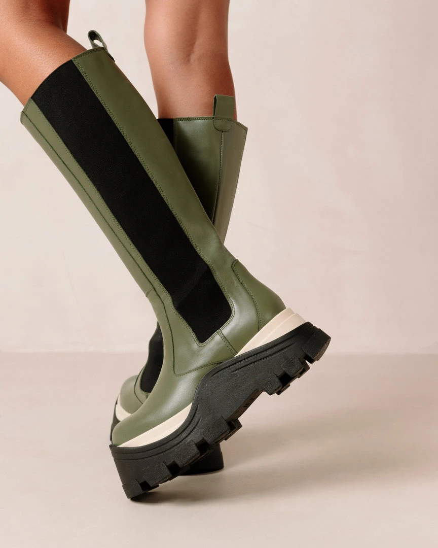 High knee chelsea boot with a thick track sole with an elastic side panel. The perfect companion for fall.