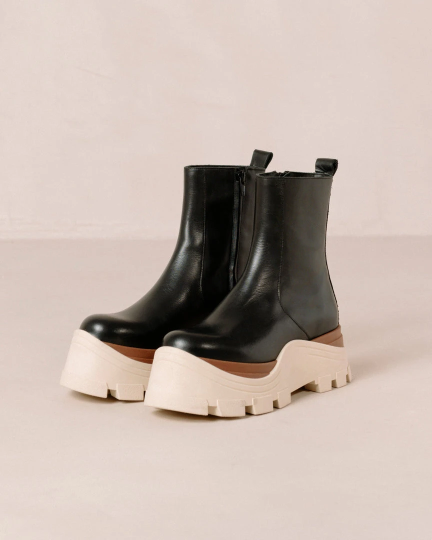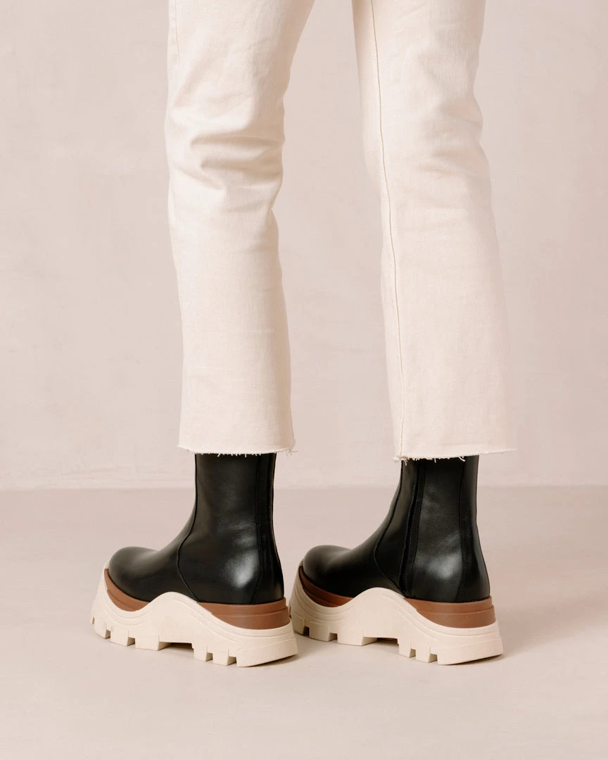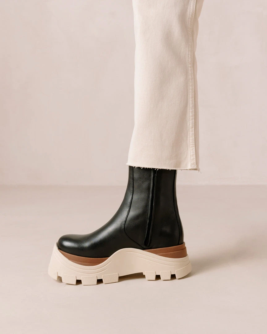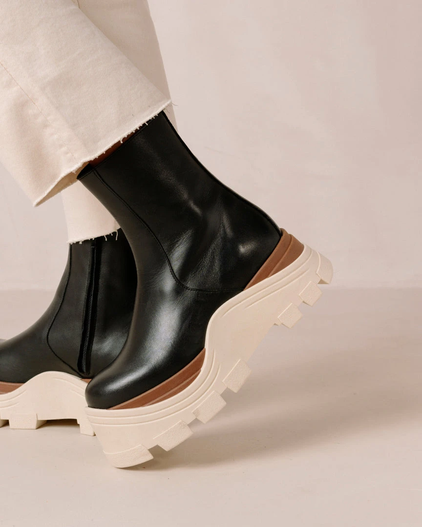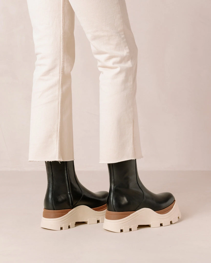 Low ankle chelsea boot with a thick track sole with an elastic side panel. The perfect companion for fall.