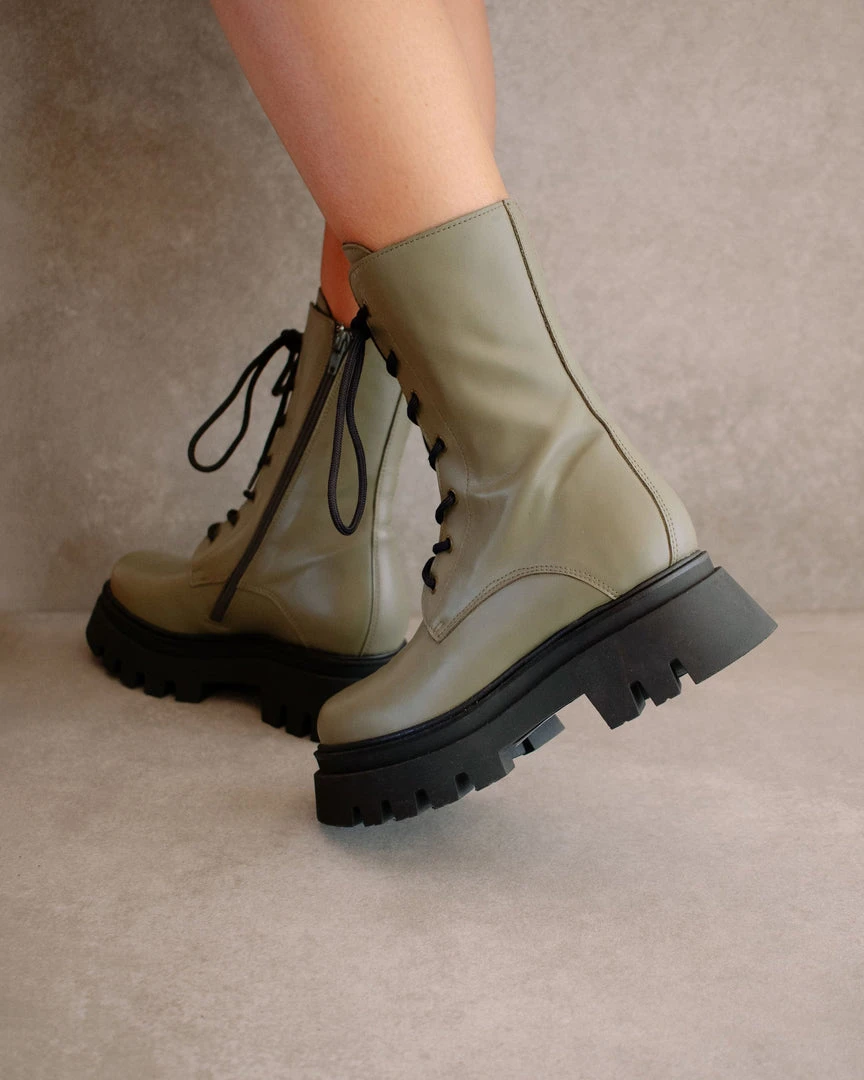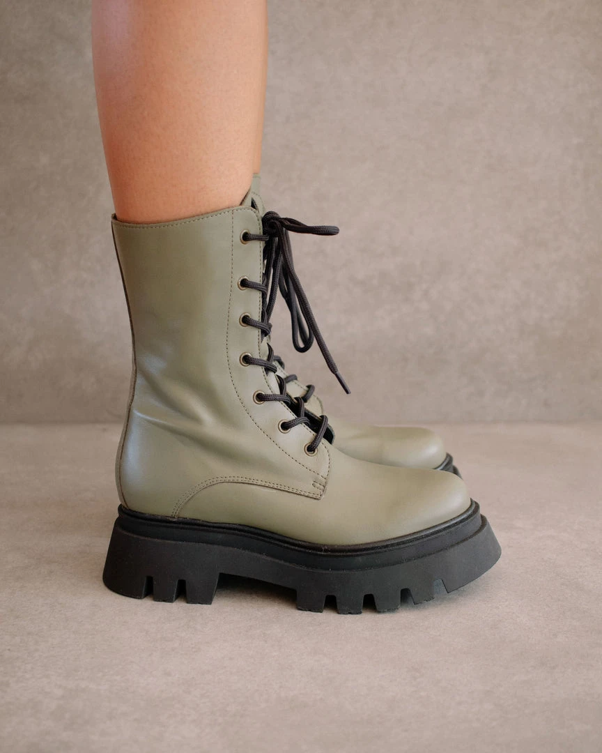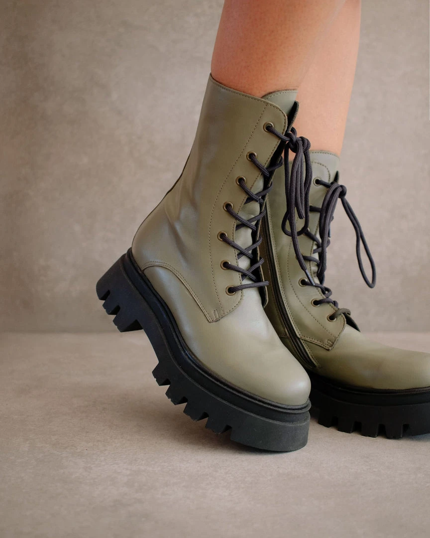 Chunky combat boots with a maxi track sole. Extra comfortable thanks to their certified leather material and lace up detail.