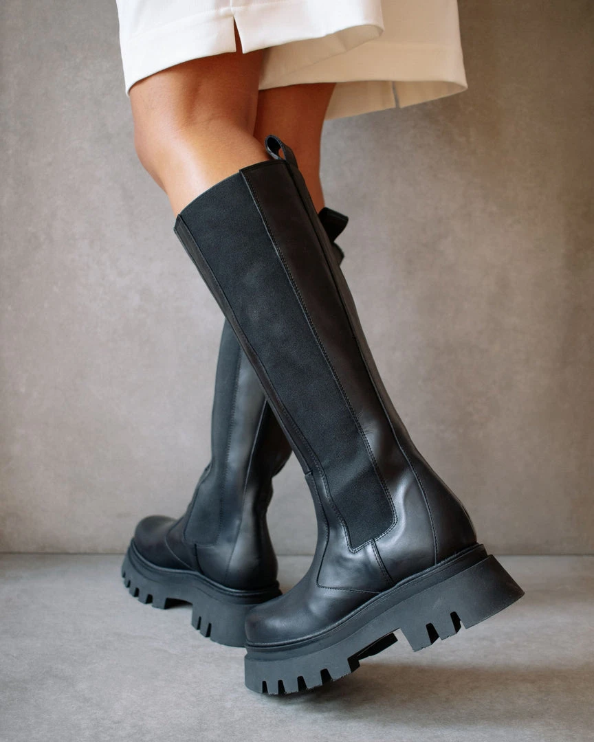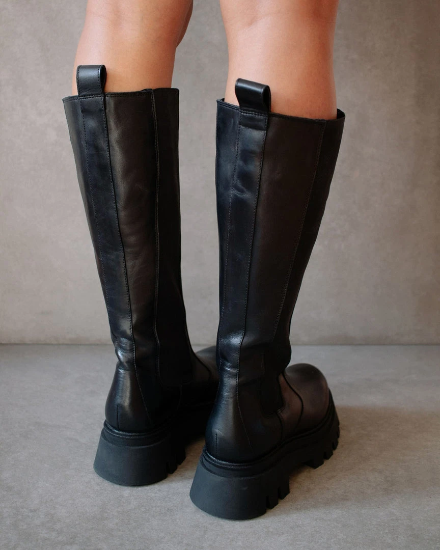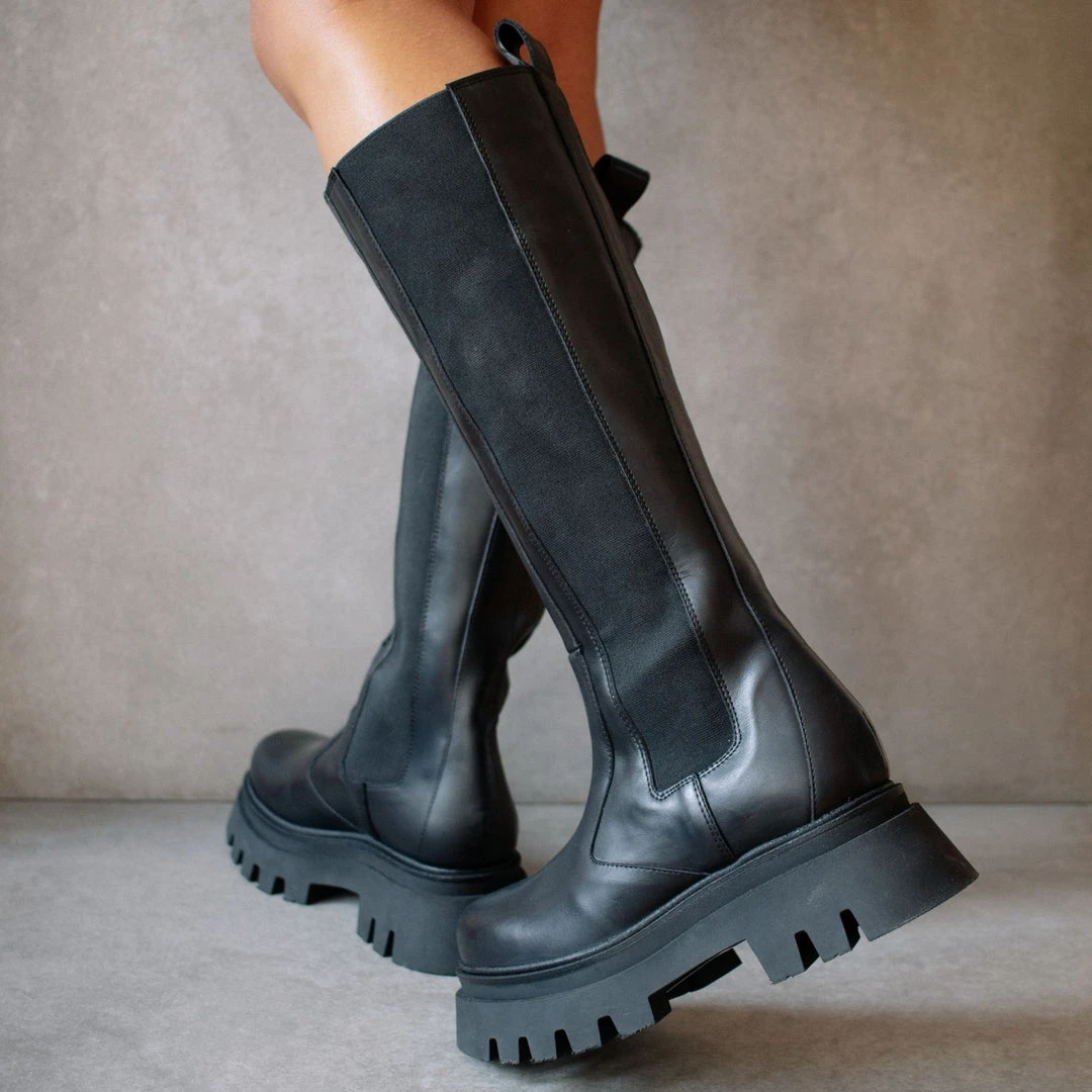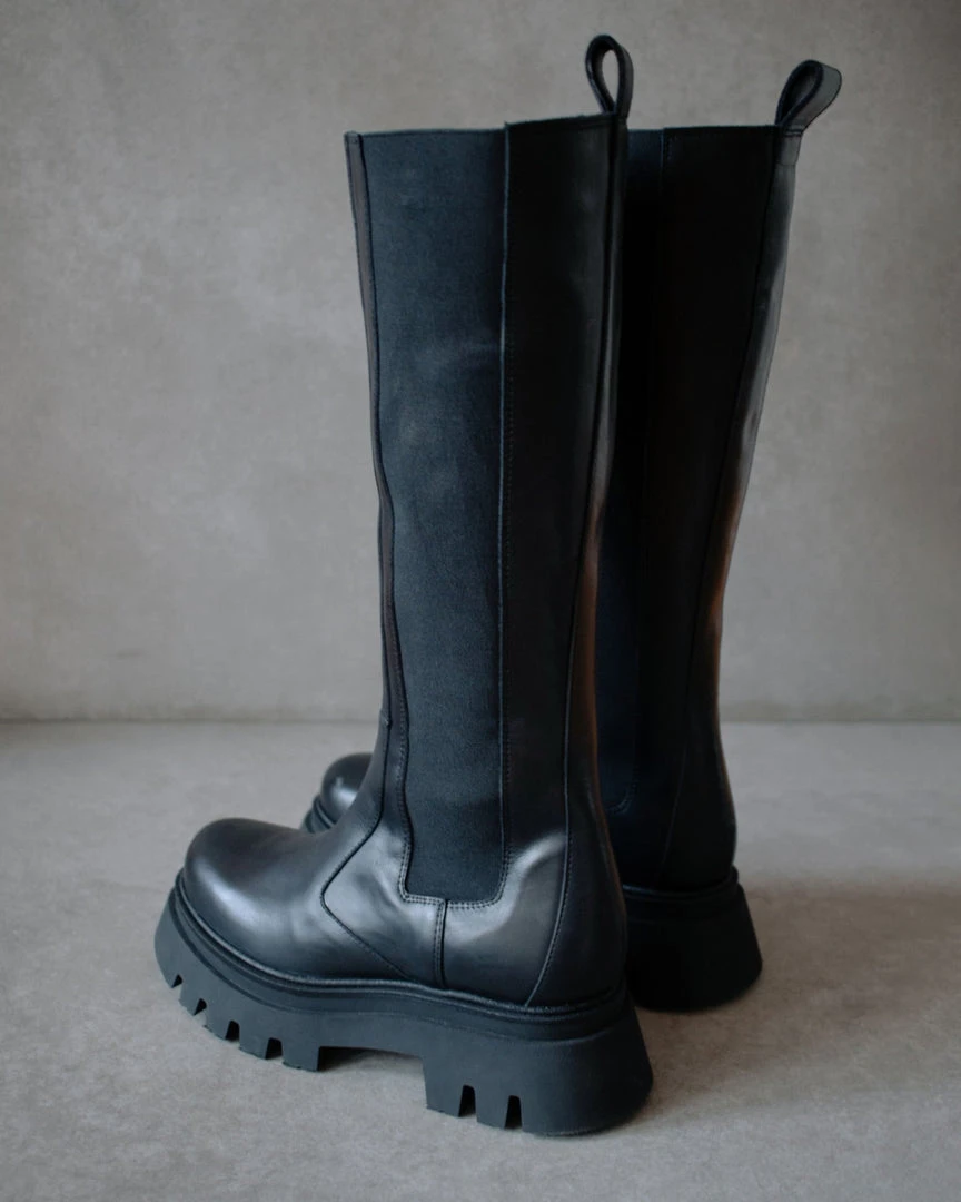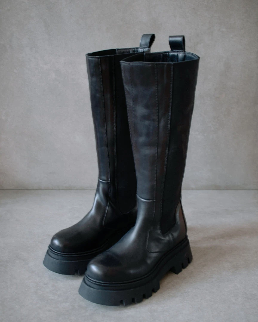 Chunky style boot with a maxi platform and slip on silhouette. Reaches right under the knee. Adds height and attitude to any type of outfit.