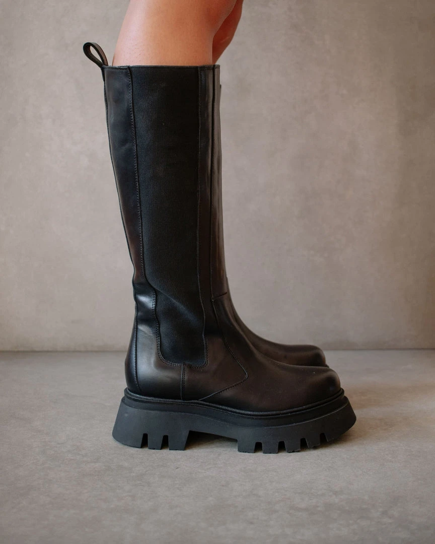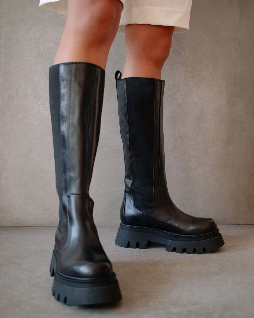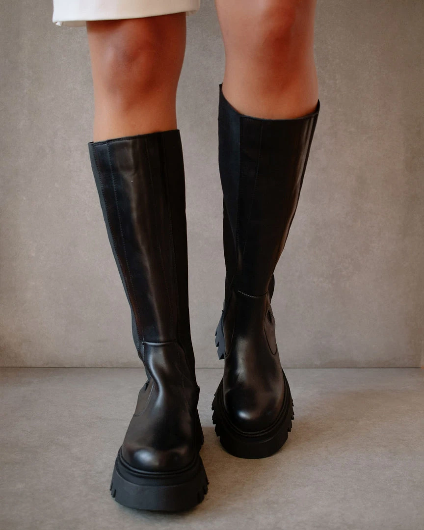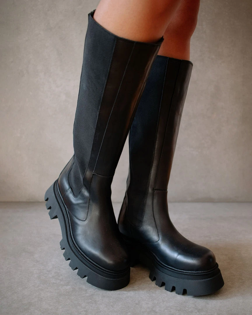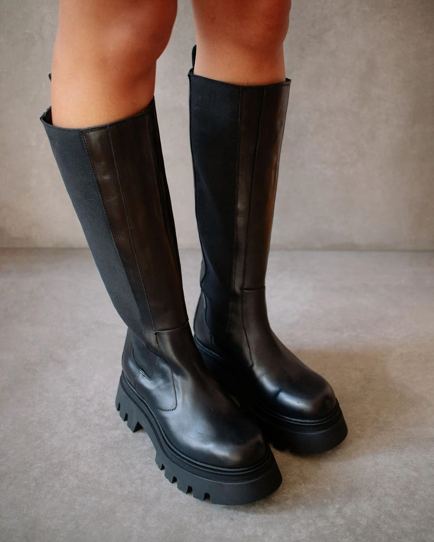 Chunky style boot with a maxi platform and slip on silhouette. Reaches right under the knee. Adds height and attitude to any type of outfit.